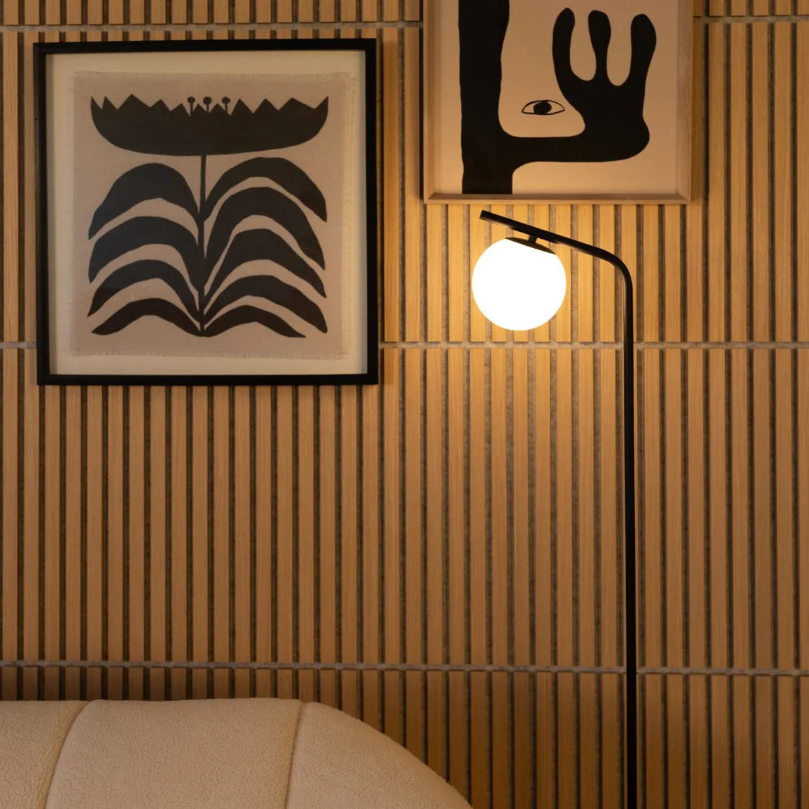 Modern living room with a white sofa, a wooden armchair, a round coffee table, a floor lamp, a large potted plant, two abstract art pieces on a wooden slat wall, and a beige rug on a wooden floor.