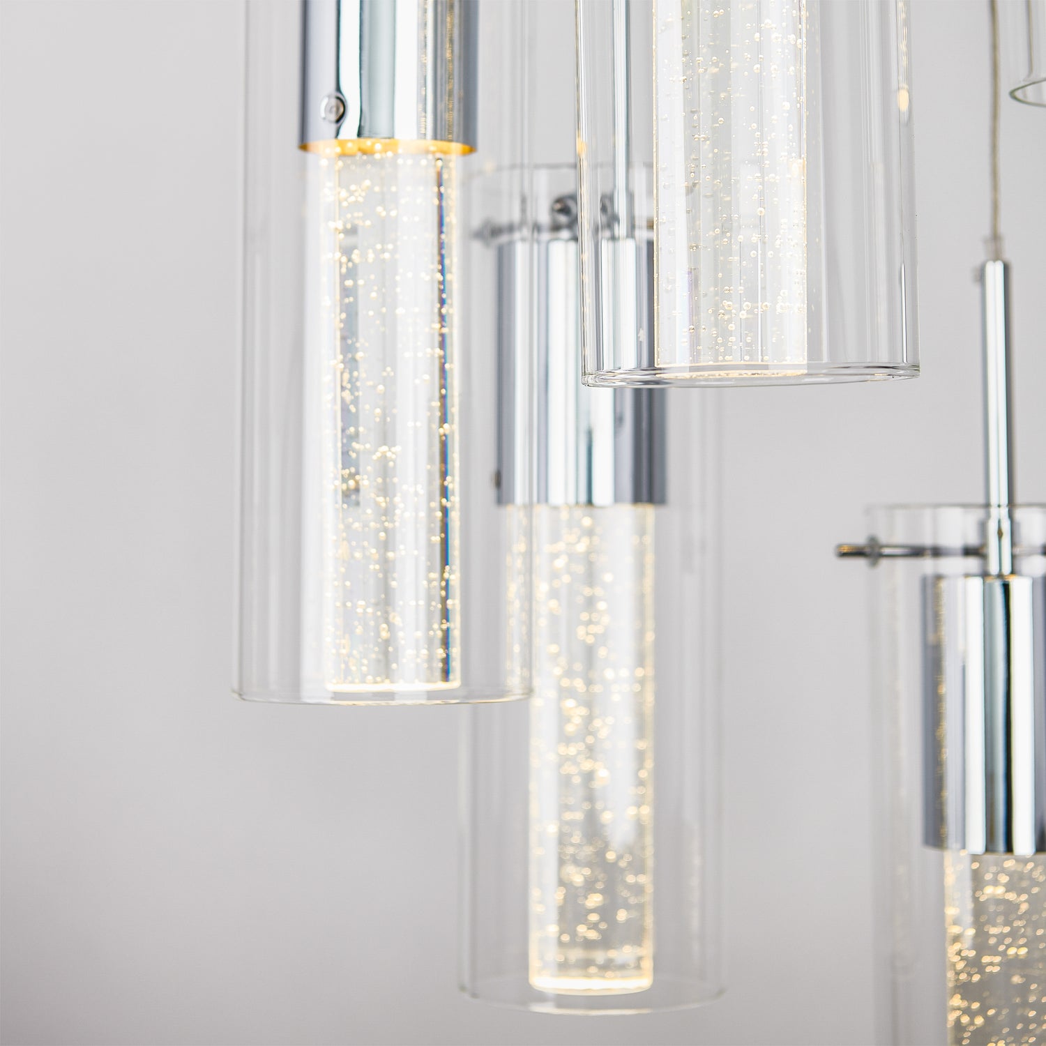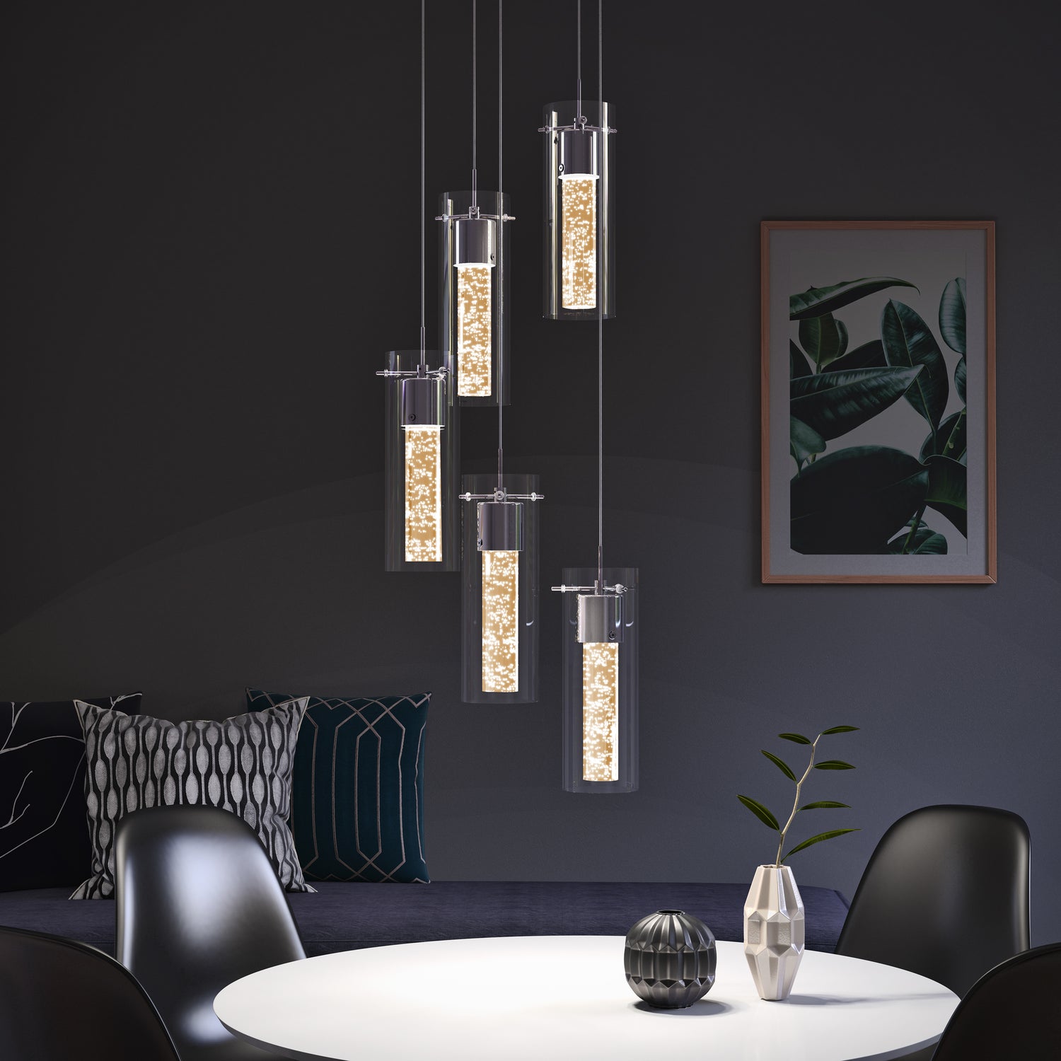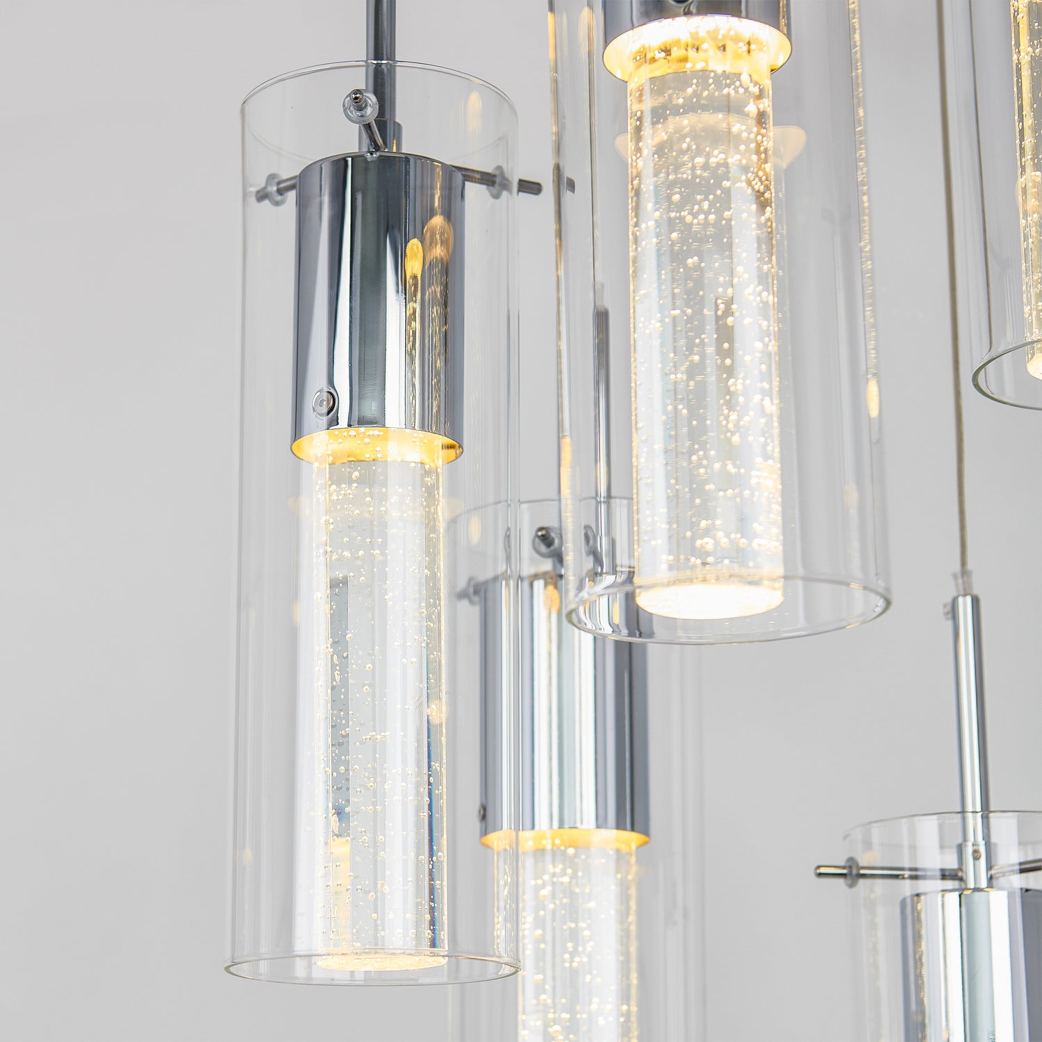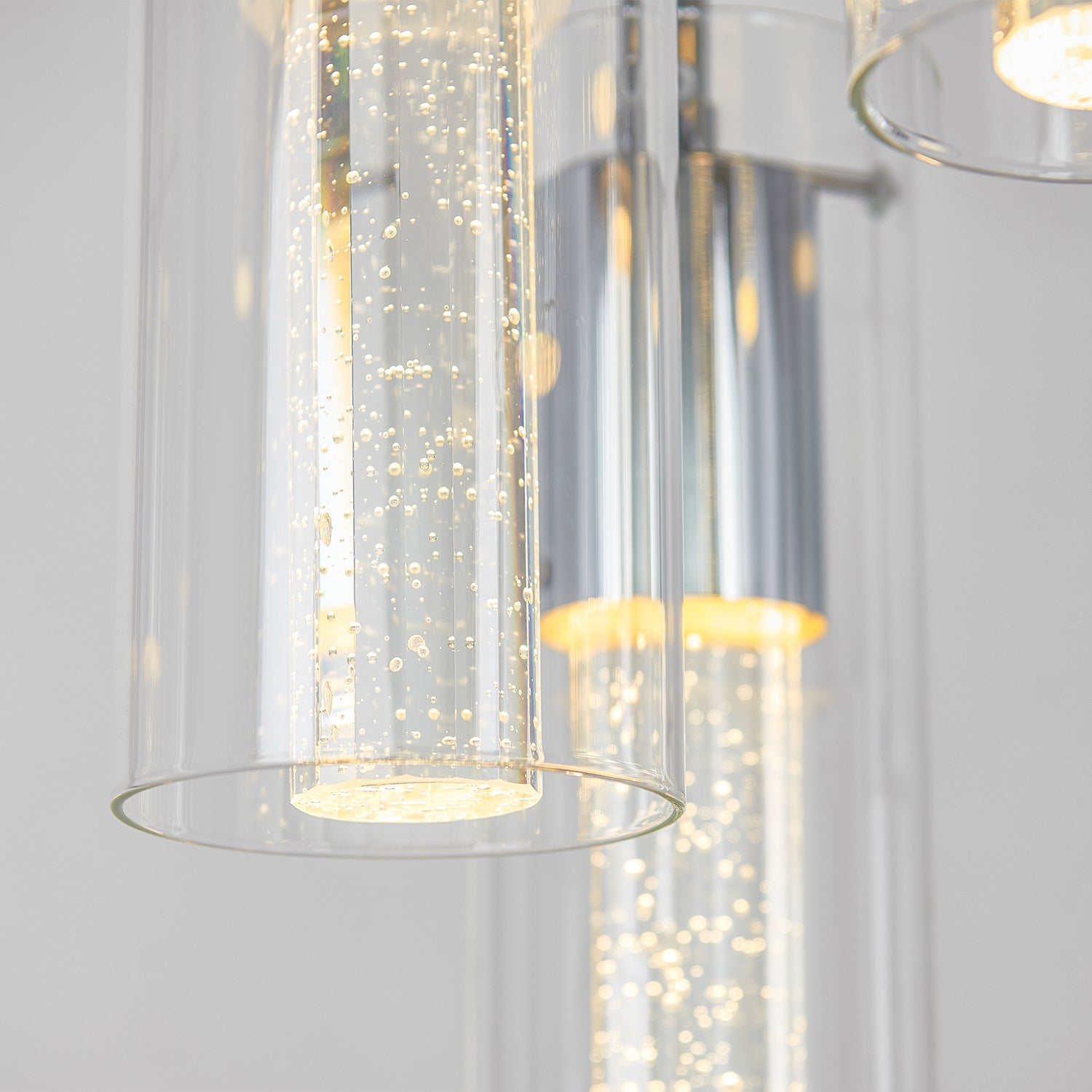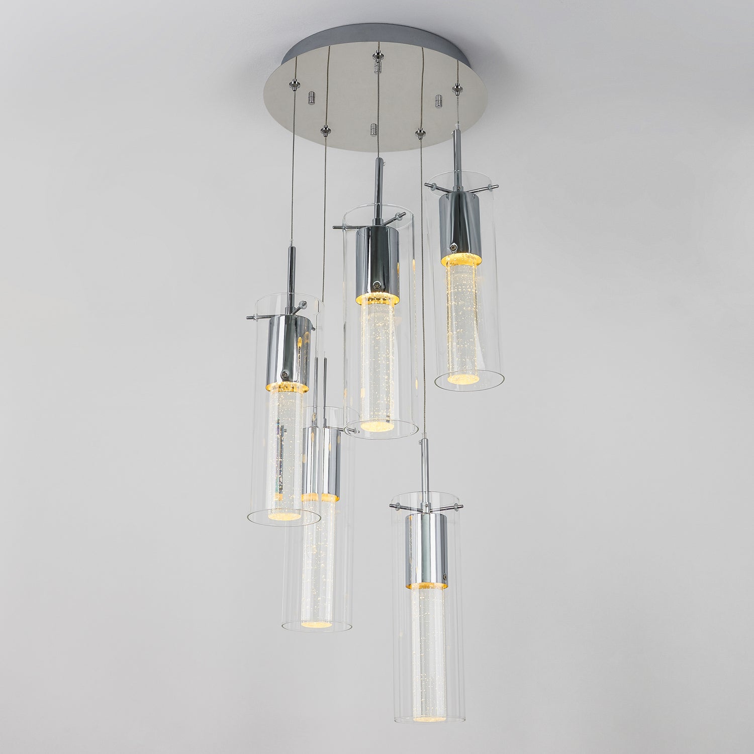 Esta lámpara colgante de 5 focos con luz led integrada trascenderá con gracia en la entrada, en el hueco de la escalera o en el comedor. Sus difusores cilíndricos de vidrio contienen hermosas burbujas de aire que se iluminan con suavidad, cubiertas por una campana de vidrio transparente aumentan el volumen.