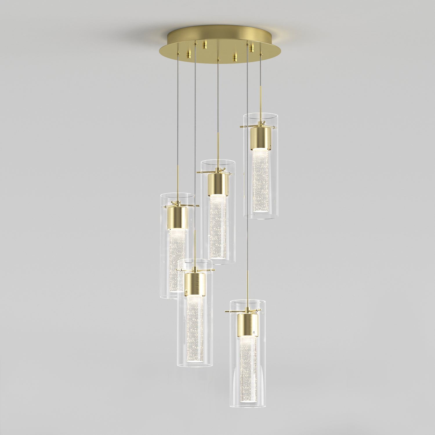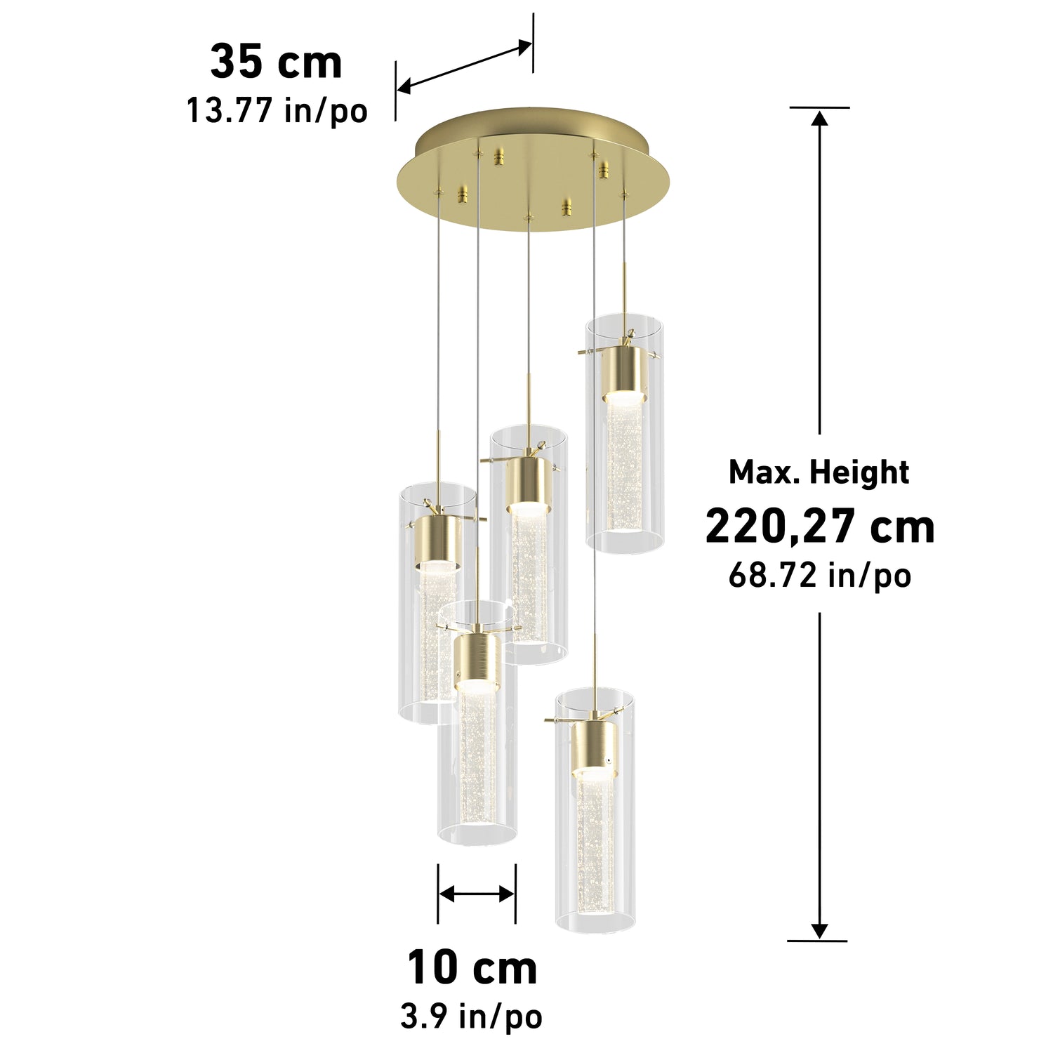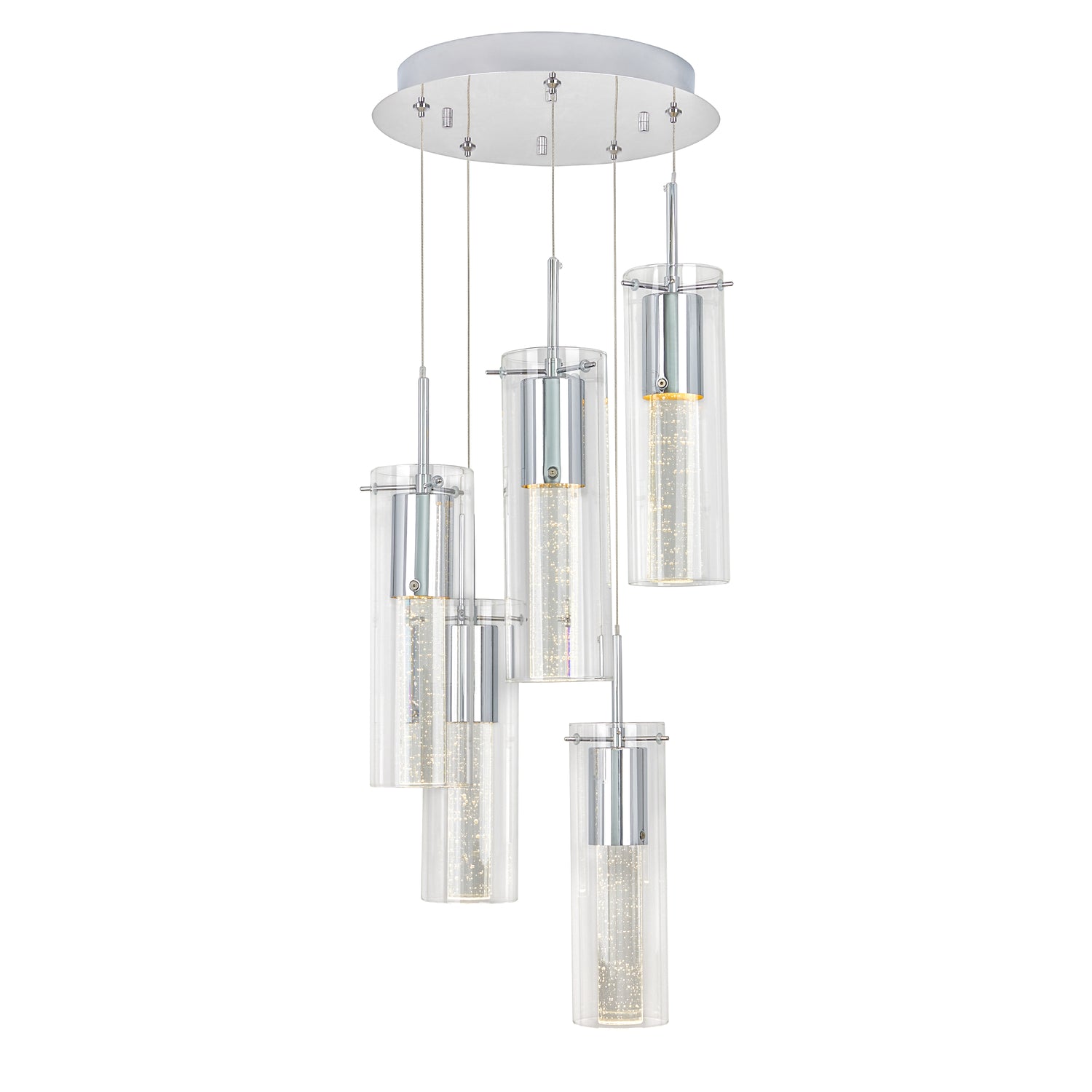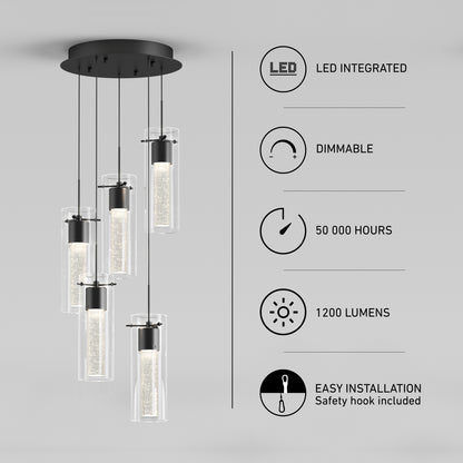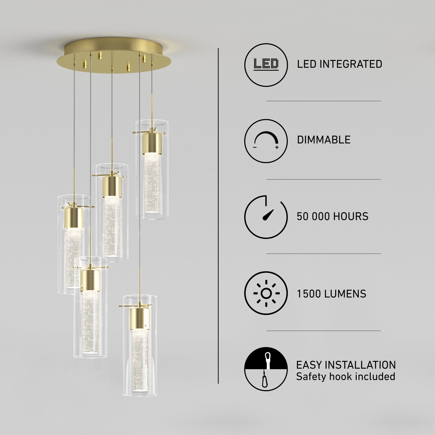 Esta lámpara colgante de 5 focos con luz led integrada trascenderá con gracia en la entrada, en el hueco de la escalera o en el comedor. Sus difusores cilíndricos de vidrio contienen hermosas burbujas de aire que se iluminan con suavidad, cubiertas por una campana de vidrio transparente aumentan el volumen.