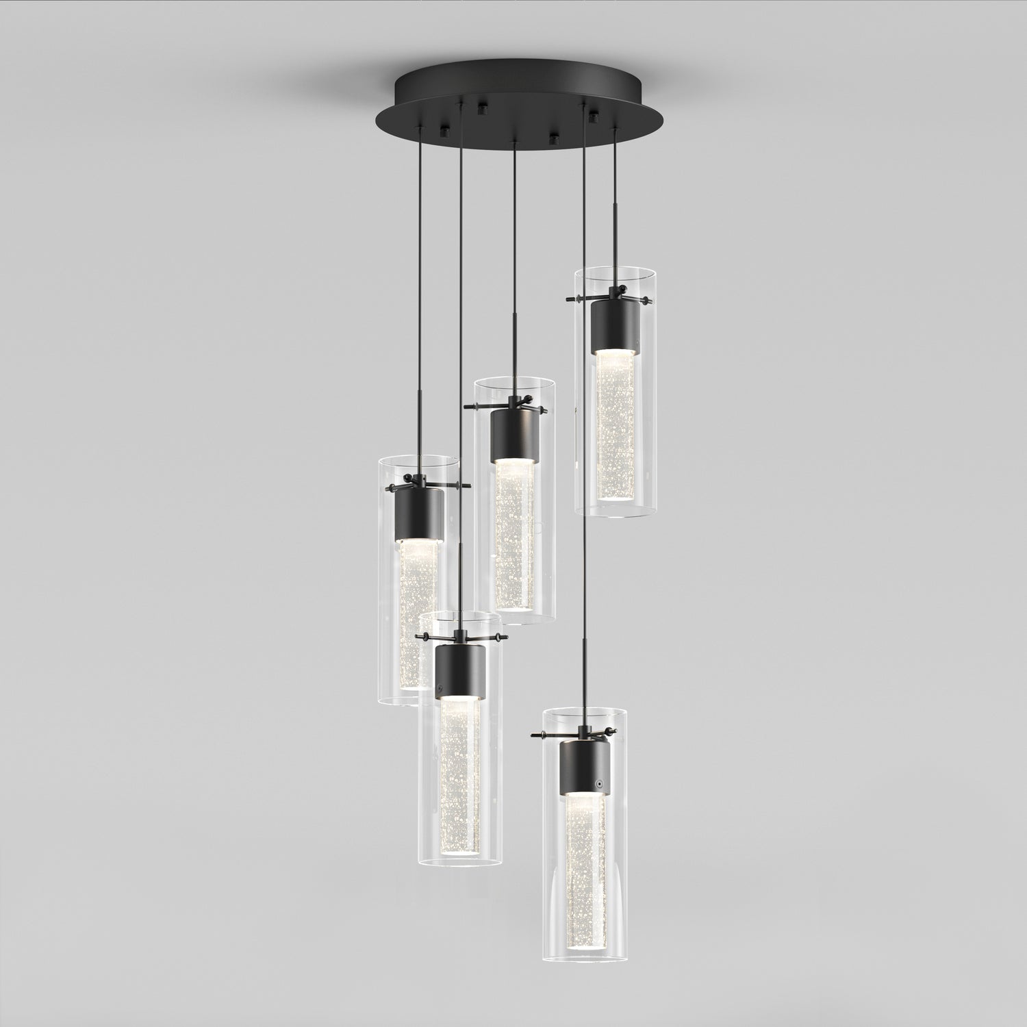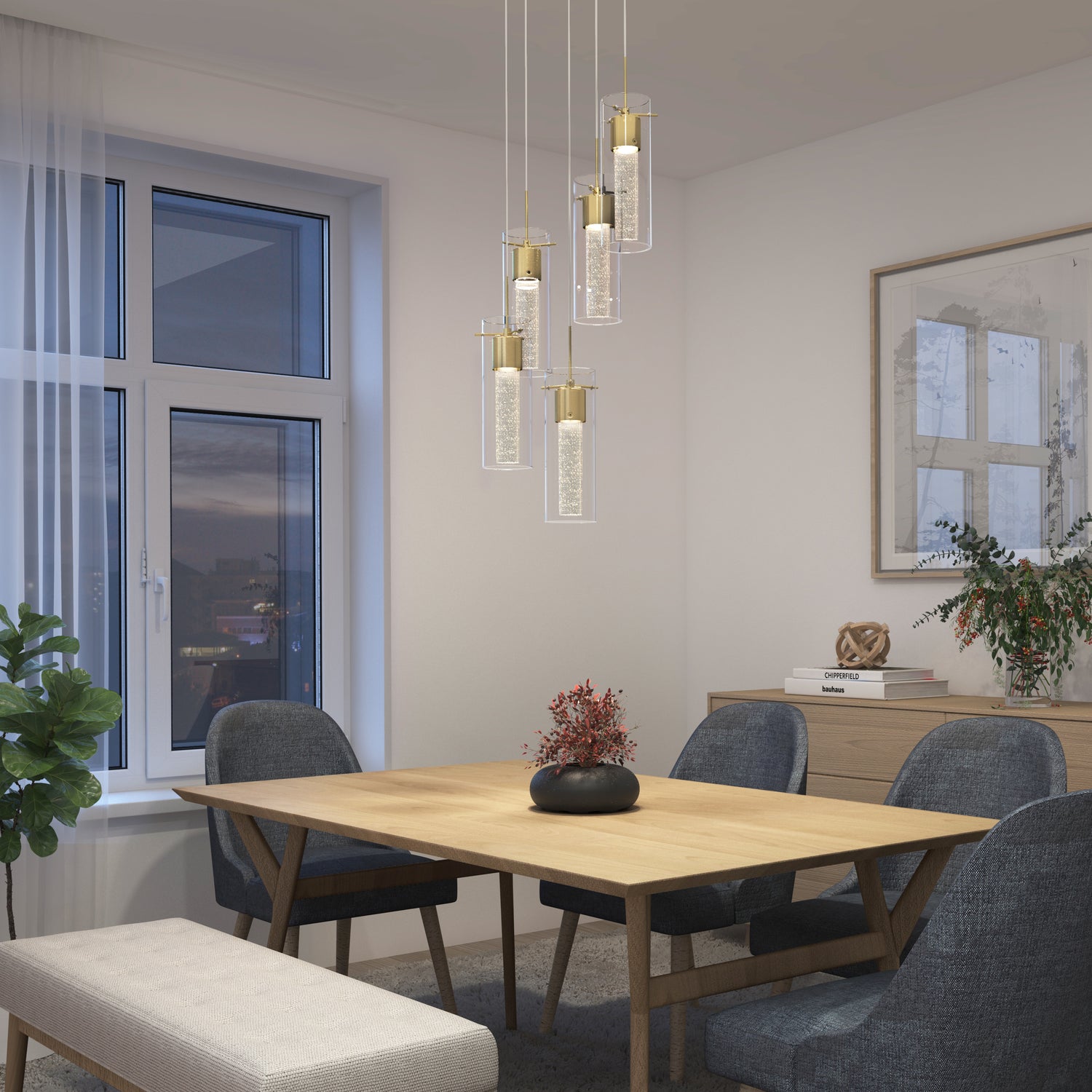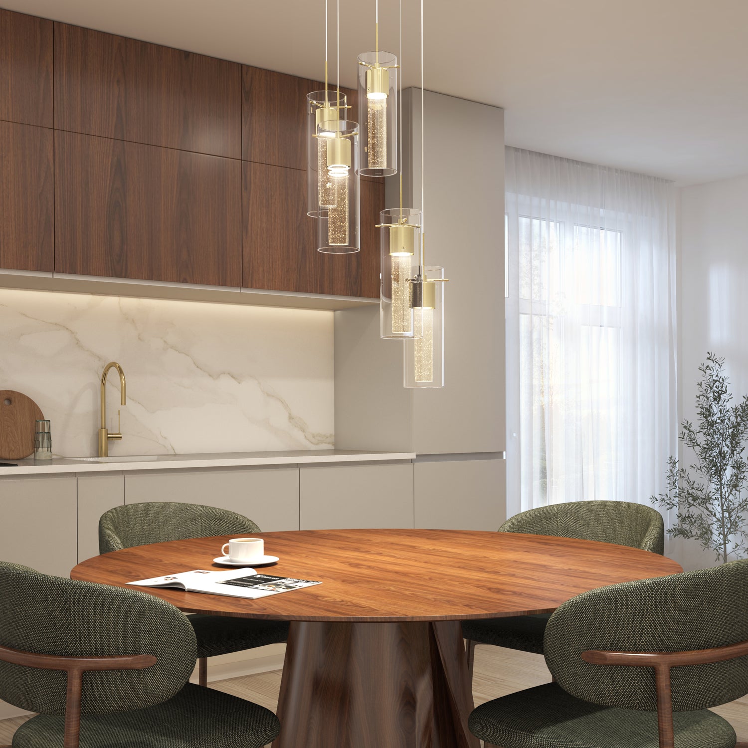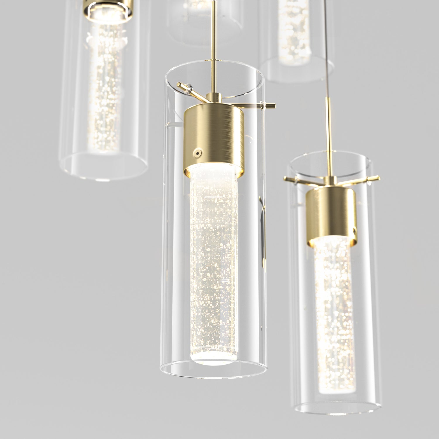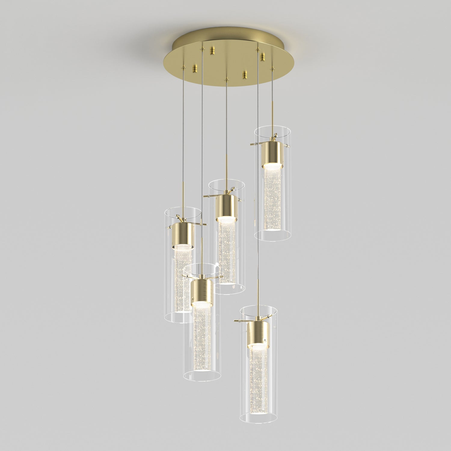 Esta lámpara colgante de 5 focos con luz led integrada trascenderá con gracia en la entrada, en el hueco de la escalera o en el comedor. Sus difusores cilíndricos de vidrio contienen hermosas burbujas de aire que se iluminan con suavidad, cubiertas por una campana de vidrio transparente aumentan el volumen.