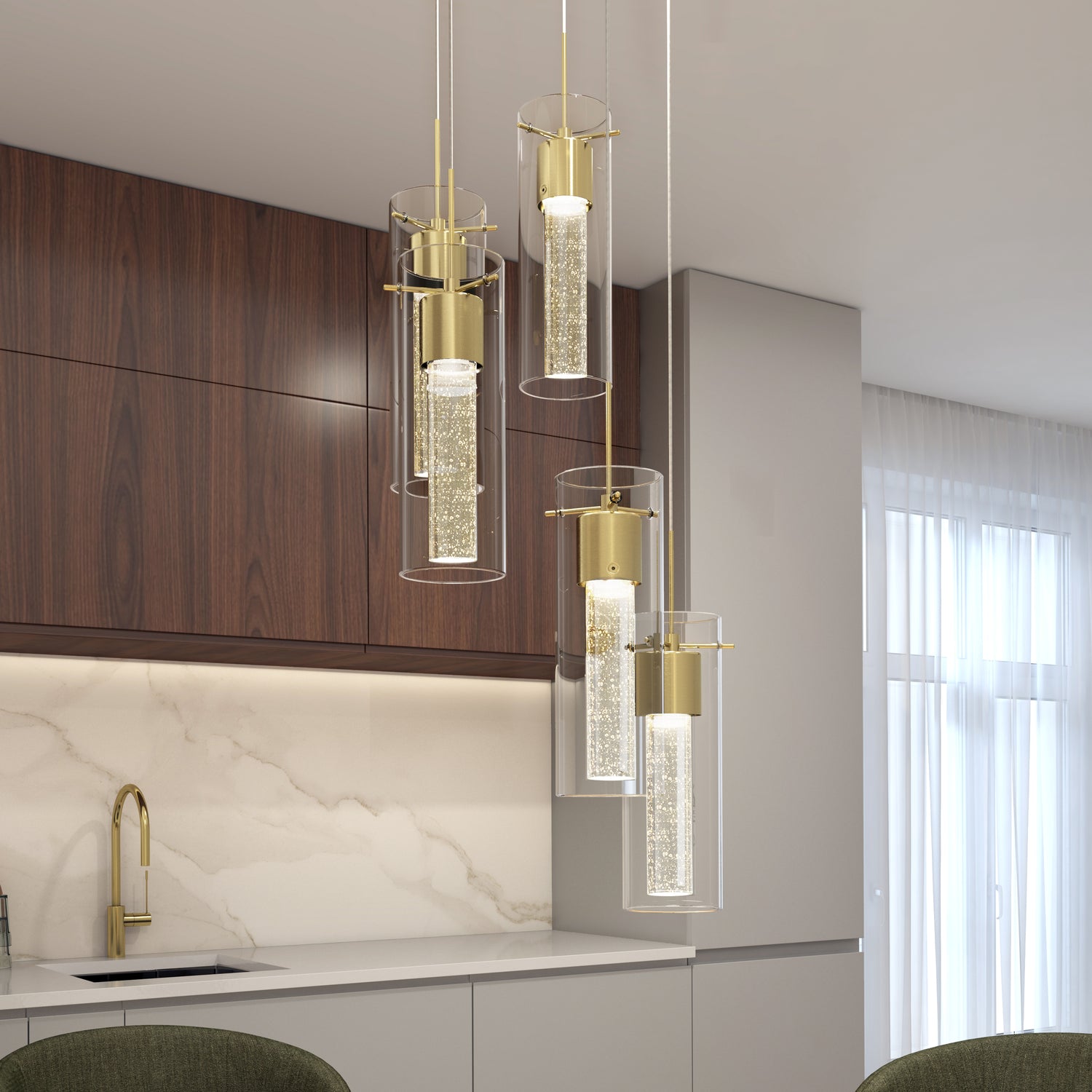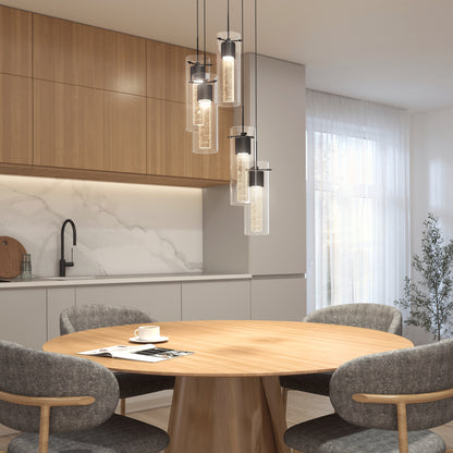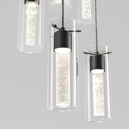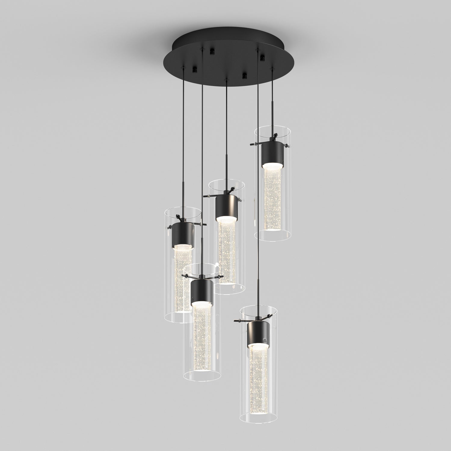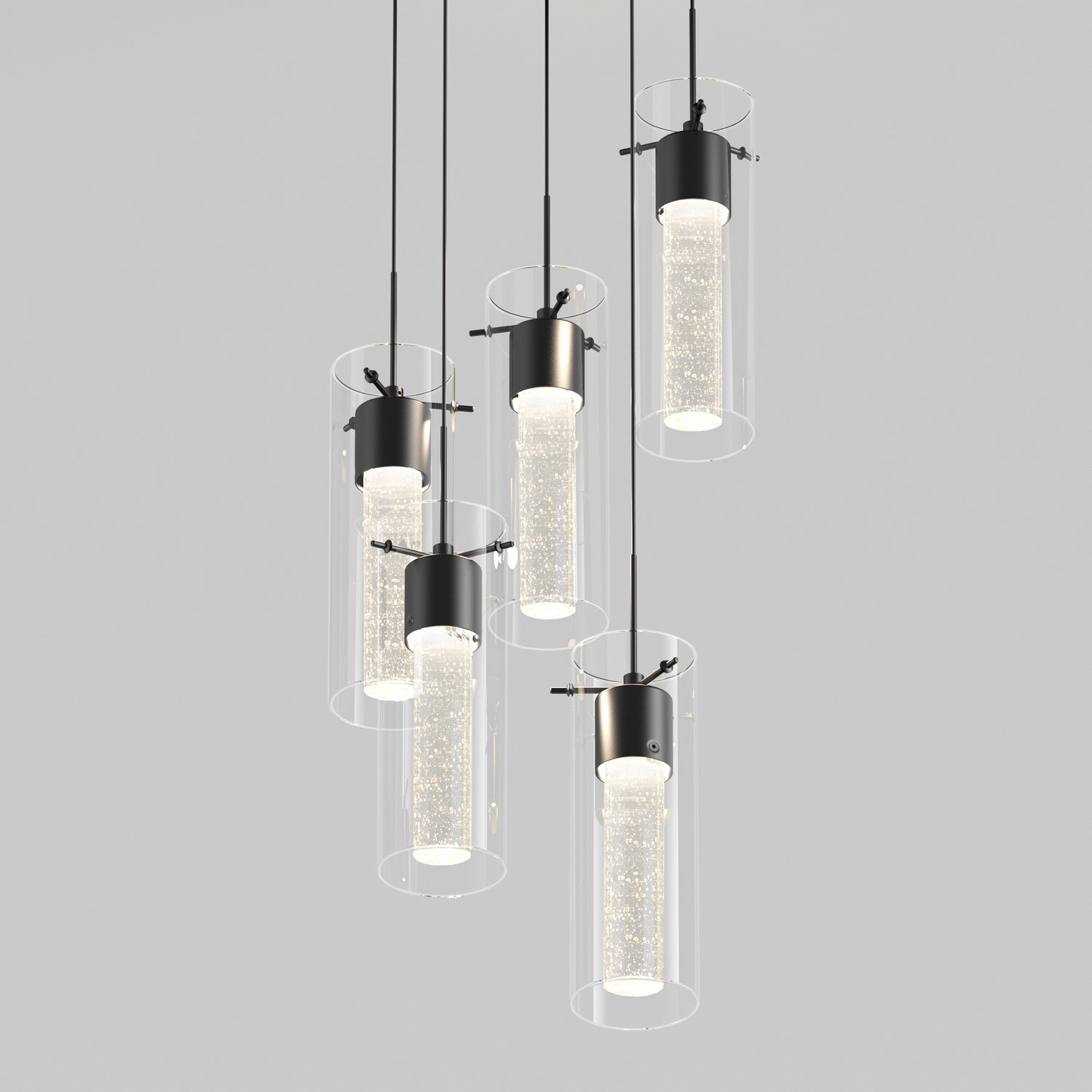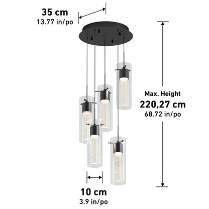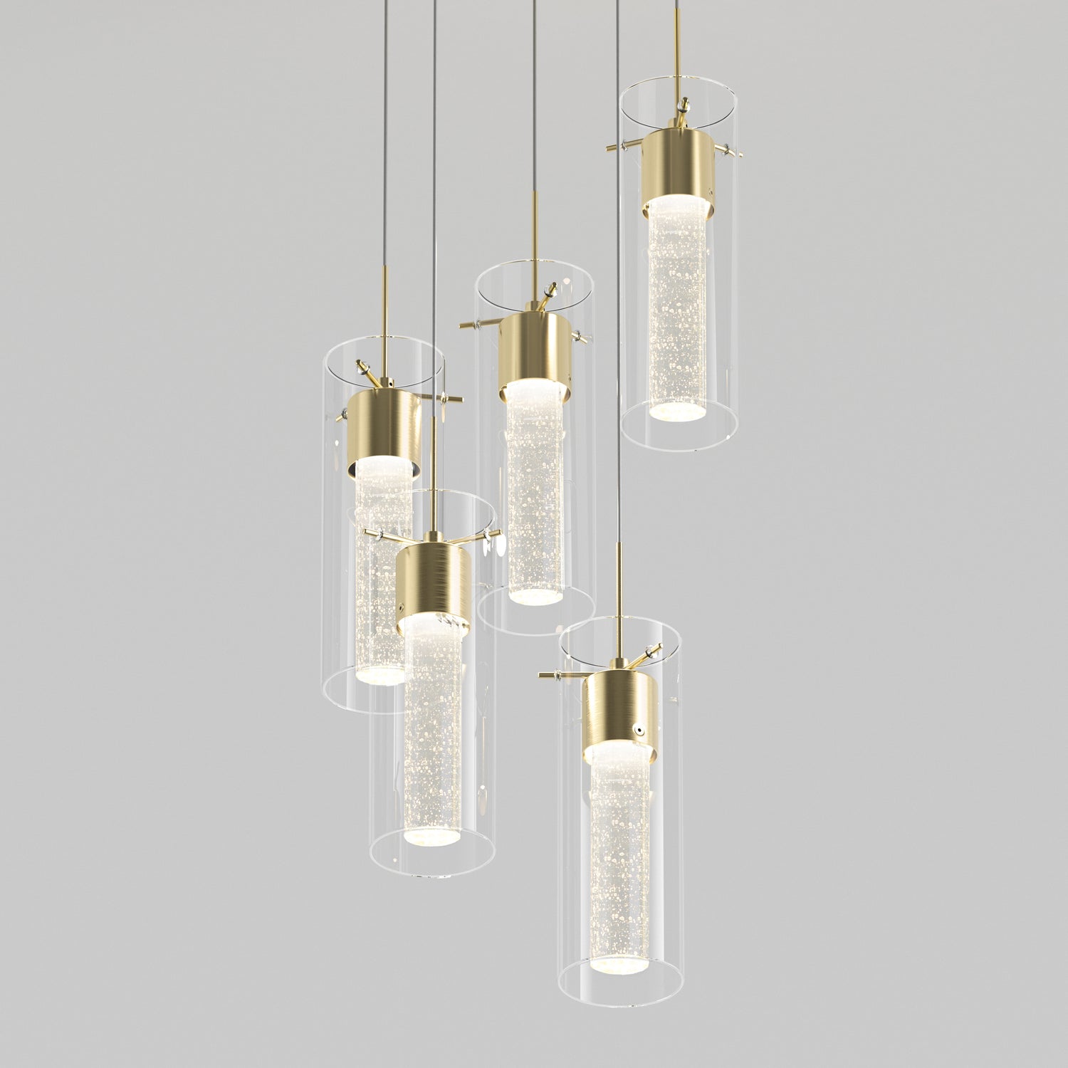 Esta lámpara colgante de 5 focos con luz led integrada trascenderá con gracia en la entrada, en el hueco de la escalera o en el comedor. Sus difusores cilíndricos de vidrio contienen hermosas burbujas de aire que se iluminan con suavidad, cubiertas por una campana de vidrio transparente aumentan el volumen.