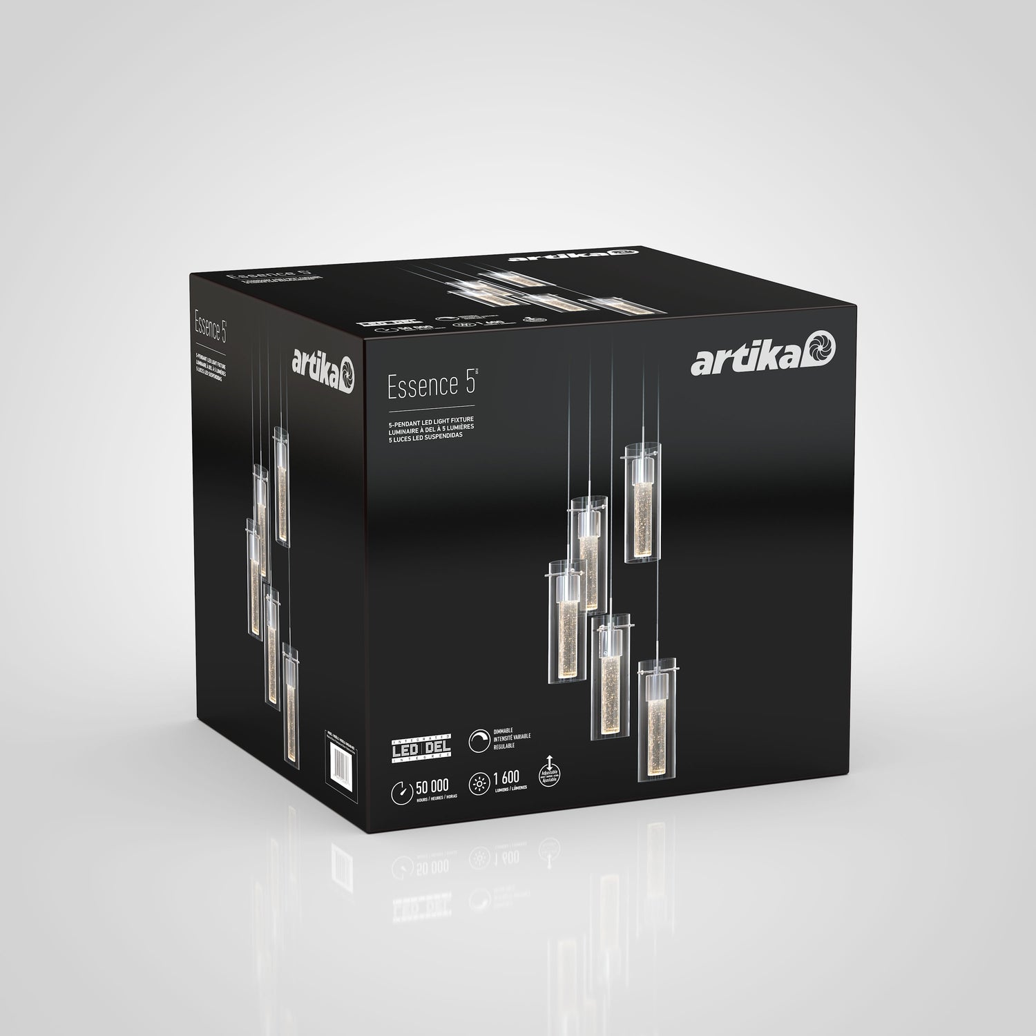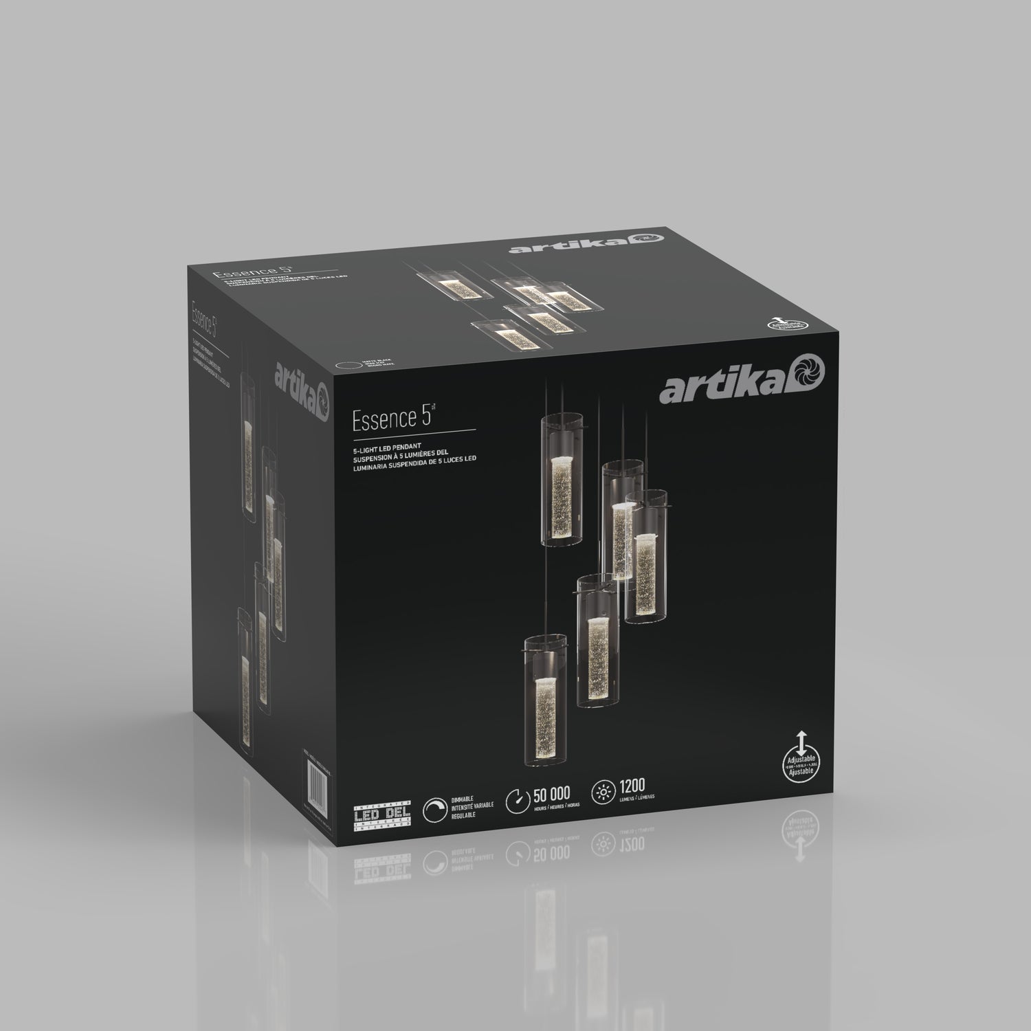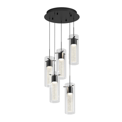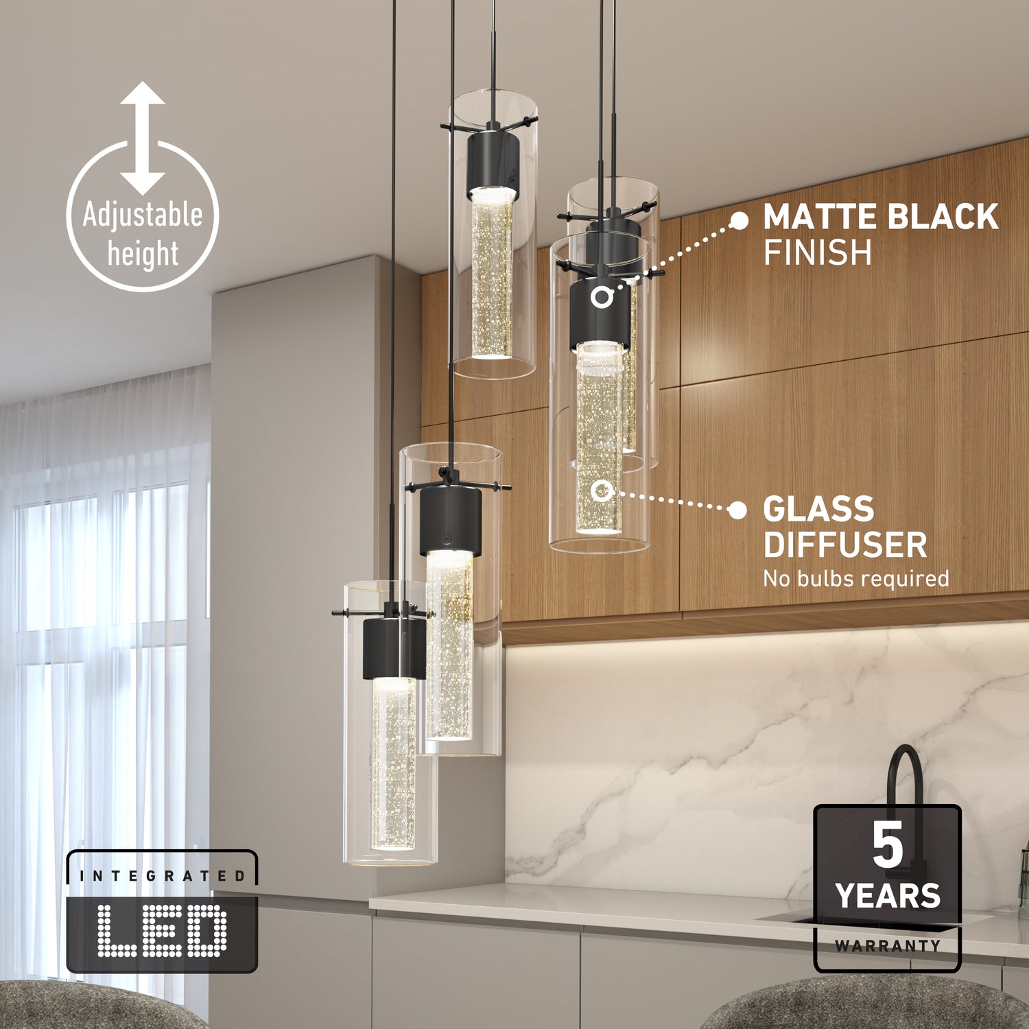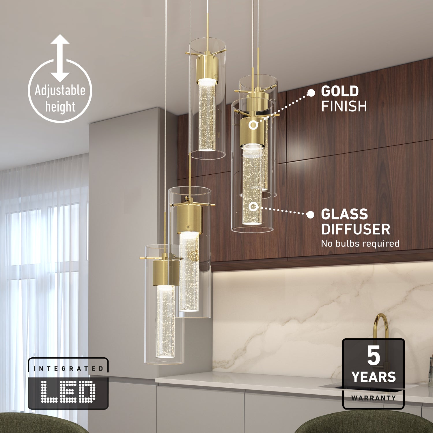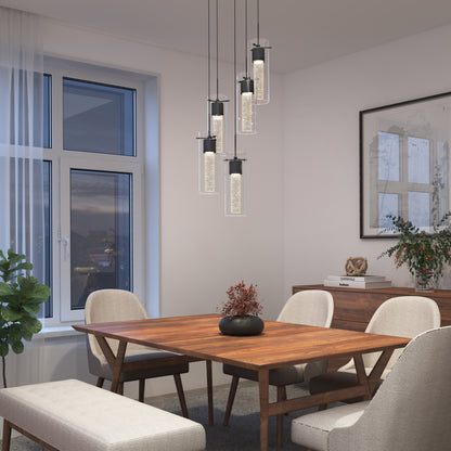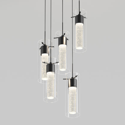 Esta lámpara colgante de 5 focos con luz led integrada trascenderá con gracia en la entrada, en el hueco de la escalera o en el comedor. Sus difusores cilíndricos de vidrio contienen hermosas burbujas de aire que se iluminan con suavidad, cubiertas por una campana de vidrio transparente aumentan el volumen.