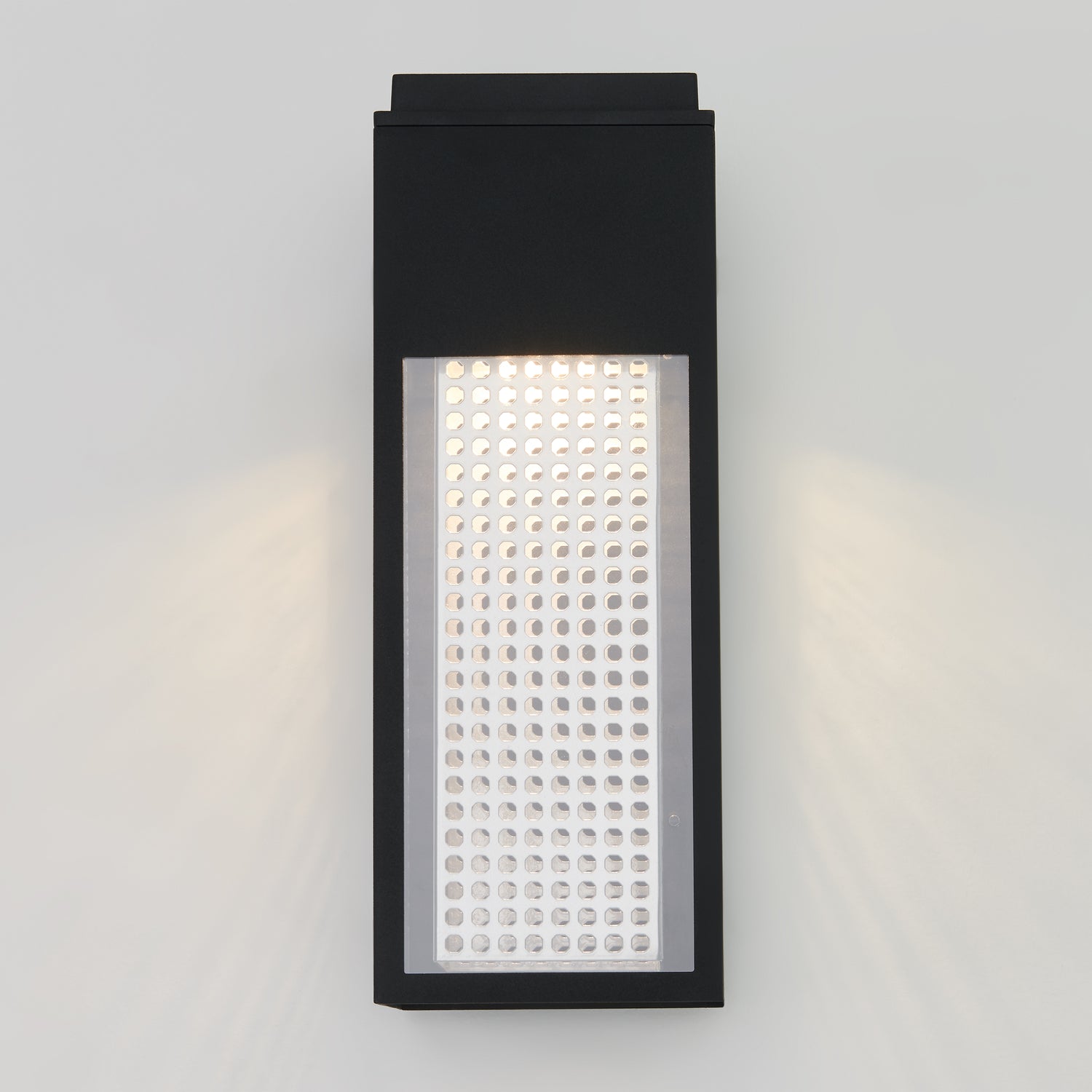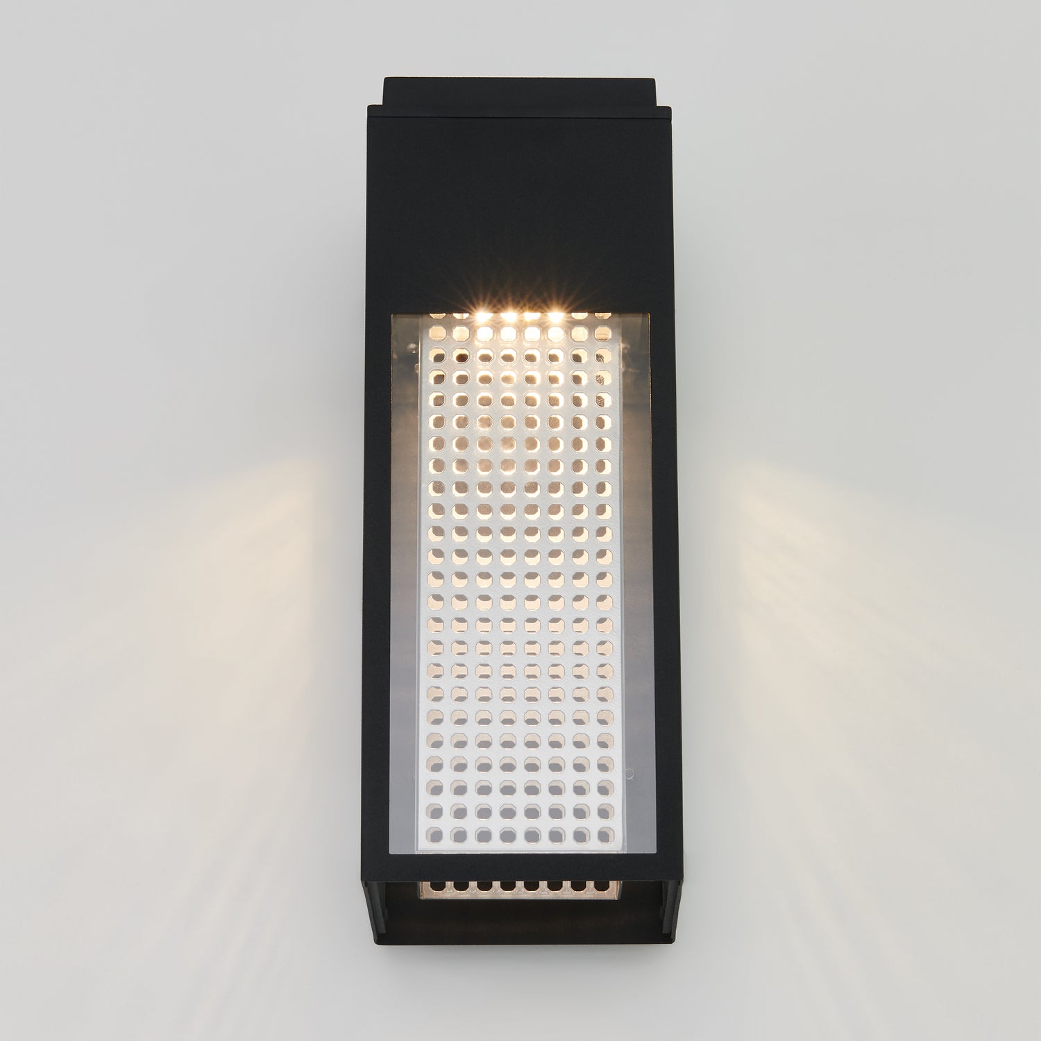 The Artika Meteor LED indoor-outdoor wall light features a modern black rectangular design with clear side panels and a perforated metal backplate, casting upward light against a light gray wall.