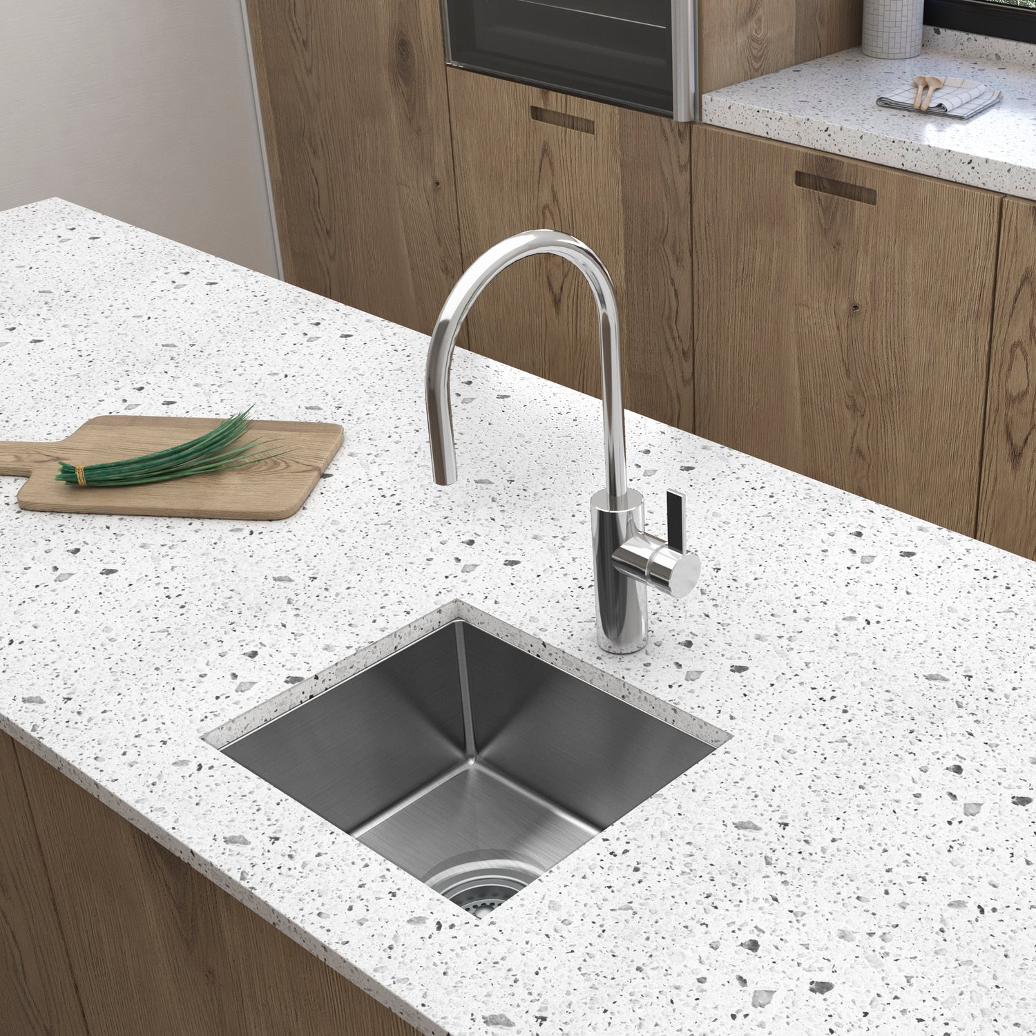 The Artika Plaza Bar Single Bowl Sink is a stainless steel square kitchen sink with a central drain strainer and a pre-drilled faucet hole, shown against a white background.