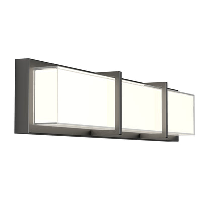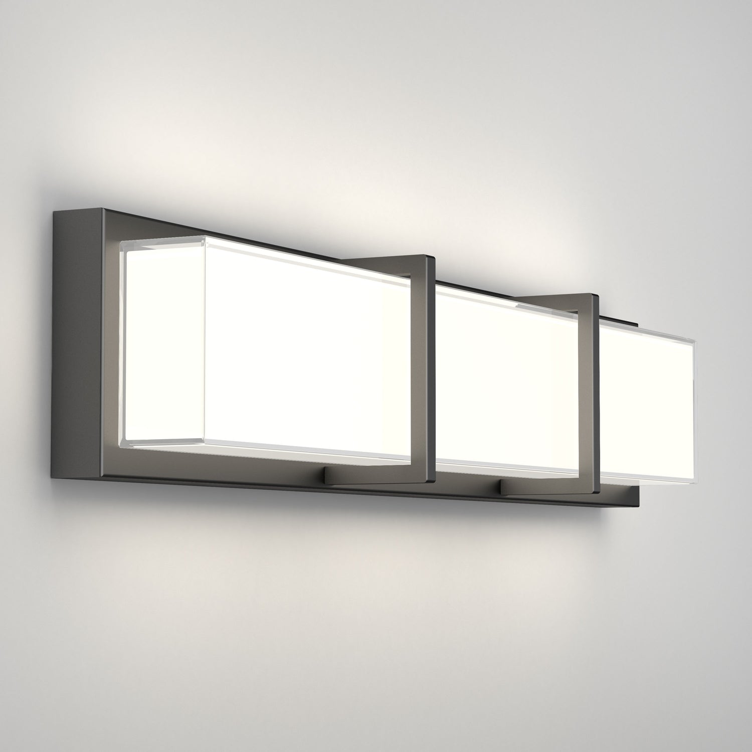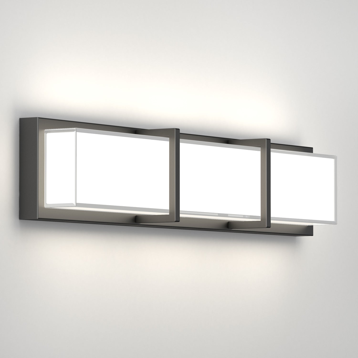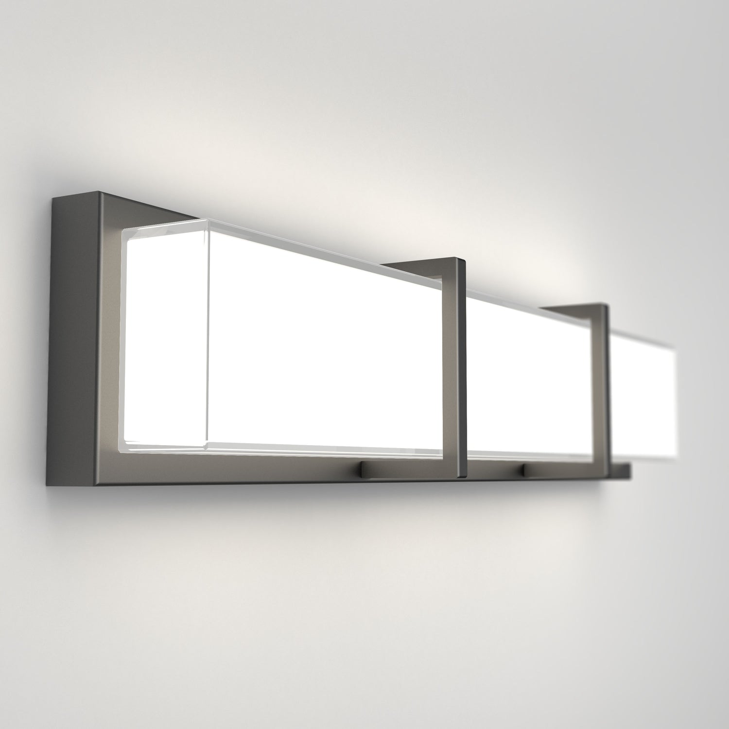 Modern bathroom featuring an Artika Subway LED vanity light above a rectangular mirror, wooden vanity, toothbrush holder, and a bathtub with glass screen against a herringbone tile wall.