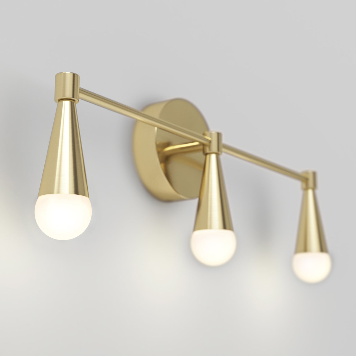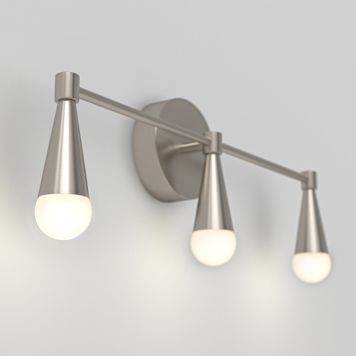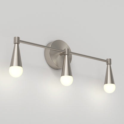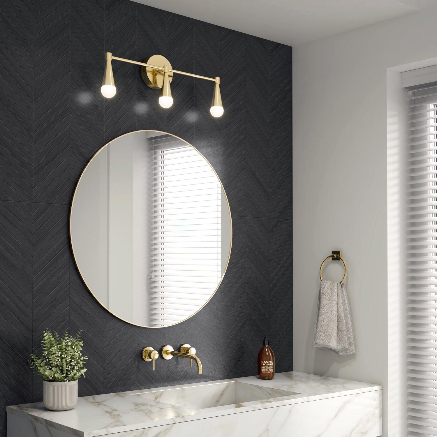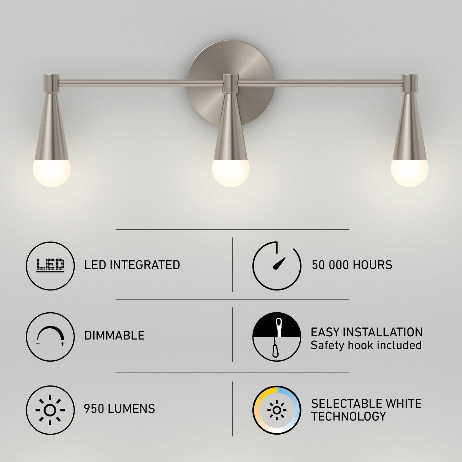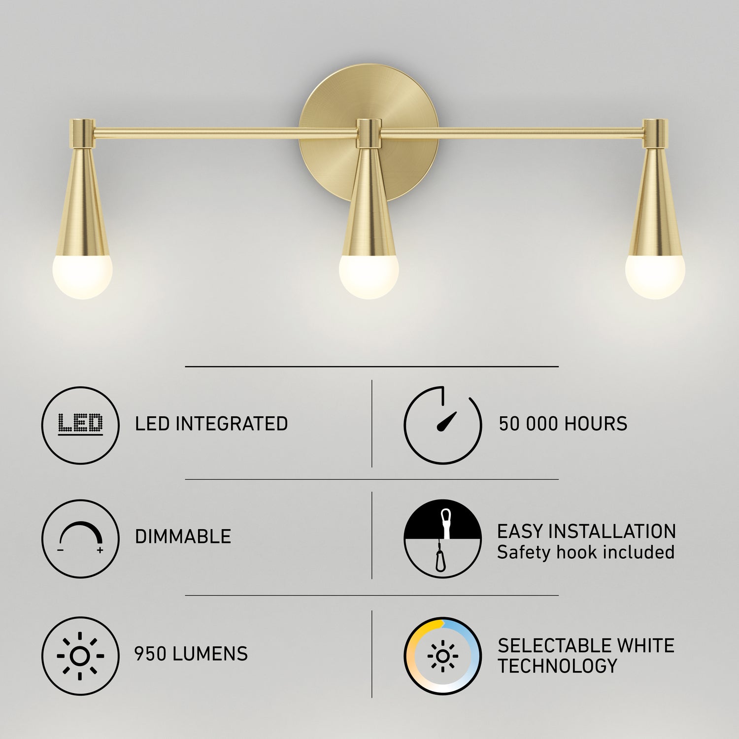 Este aplique de pared con luz led integrada consiste en 3 focos en forma de conos invertidos que se adaptan tanto a los decorados modernos como a los contemporáneos, transicionales o clásicos. Lucirá sobre el mueble de tocador de un baño pequeño o aseo.