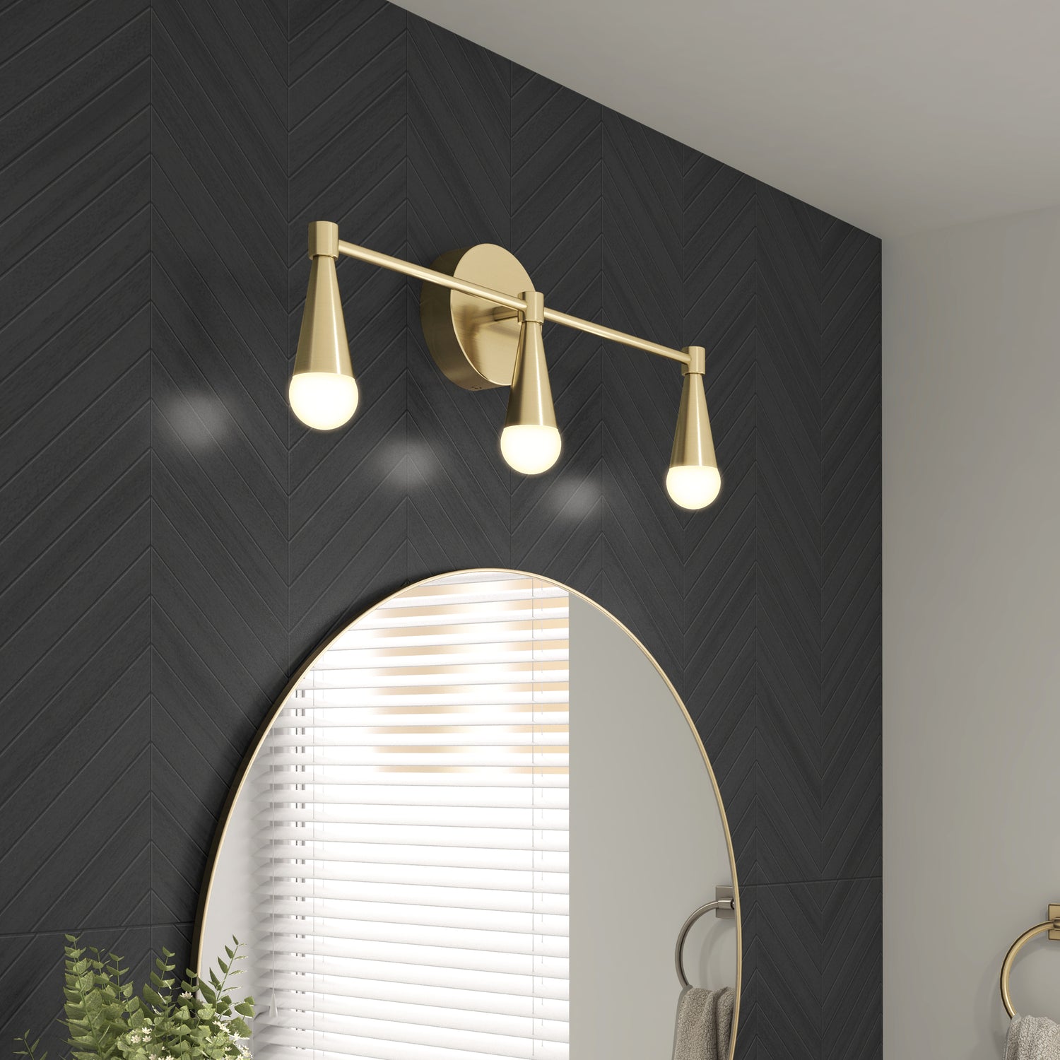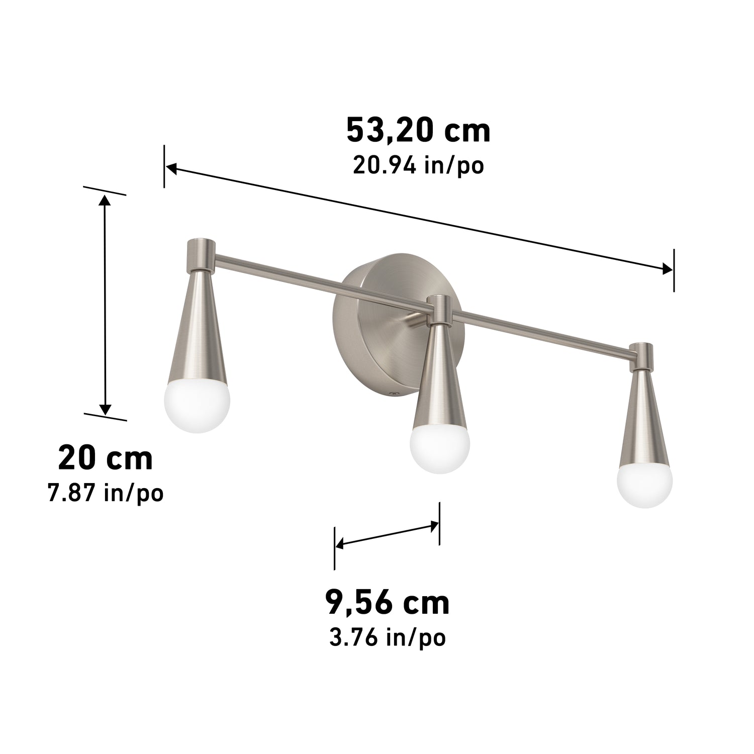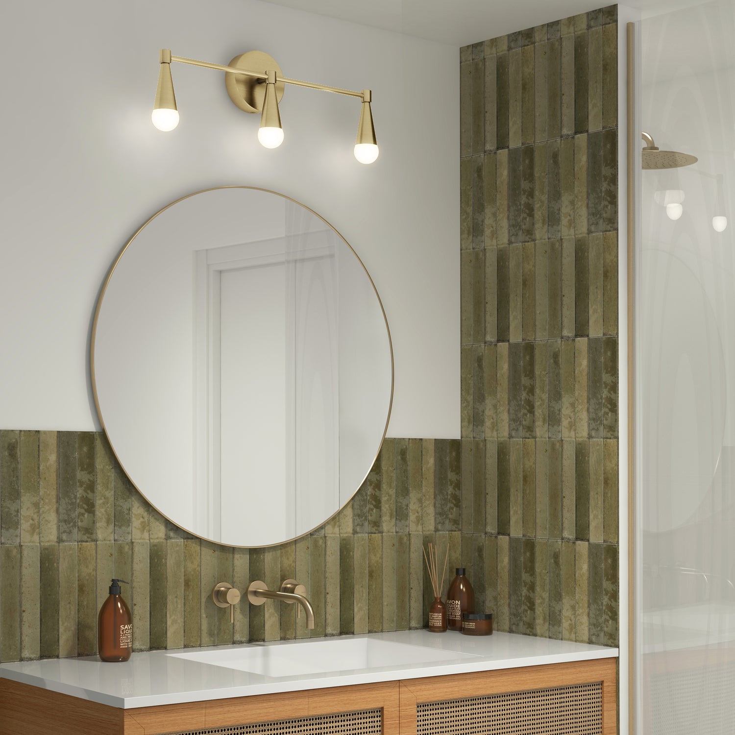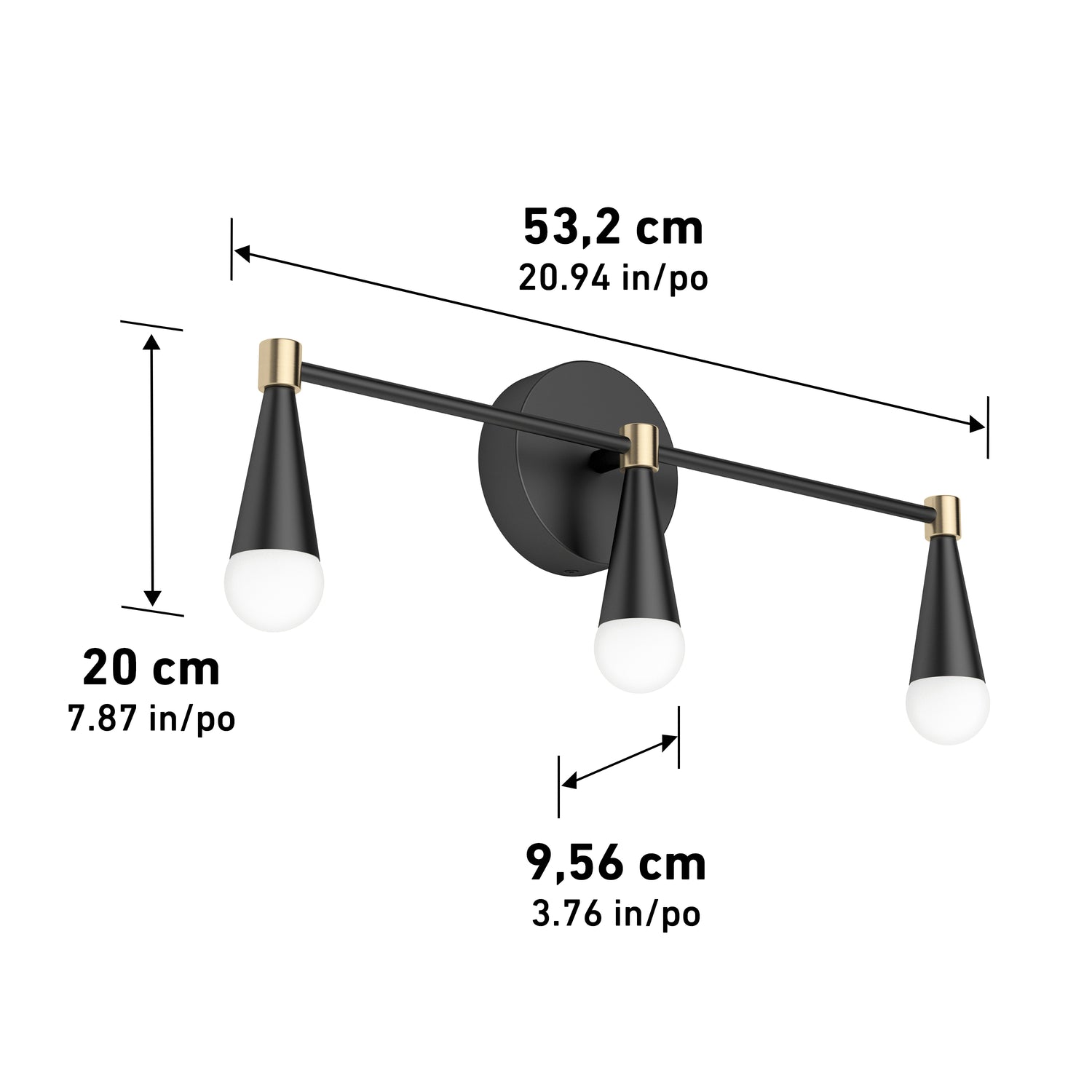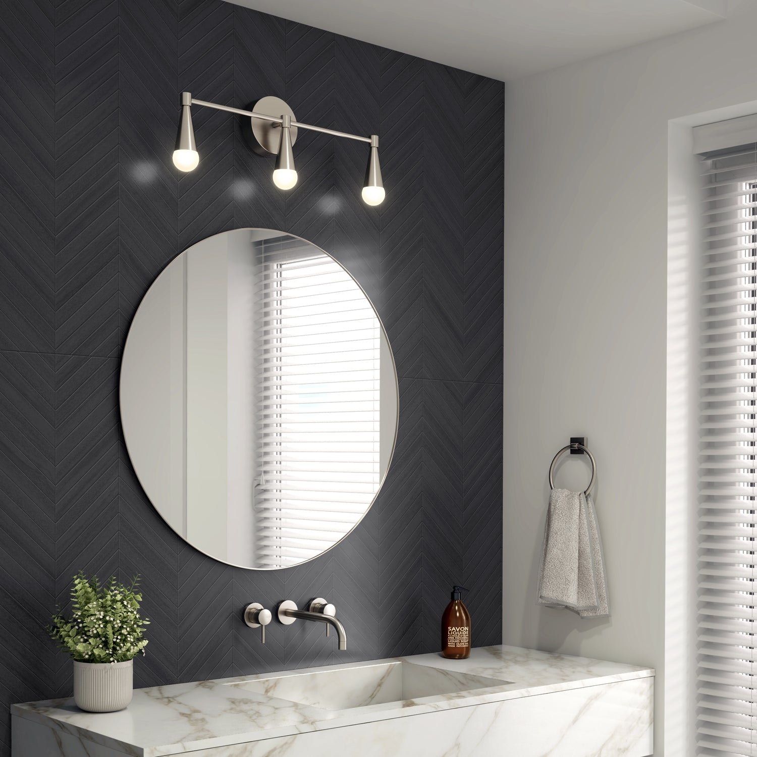 Este aplique de pared con luz led integrada consiste en 3 focos en forma de conos invertidos que se adaptan tanto a los decorados modernos como a los contemporáneos, transicionales o clásicos. Lucirá sobre el mueble de tocador de un baño pequeño o aseo.