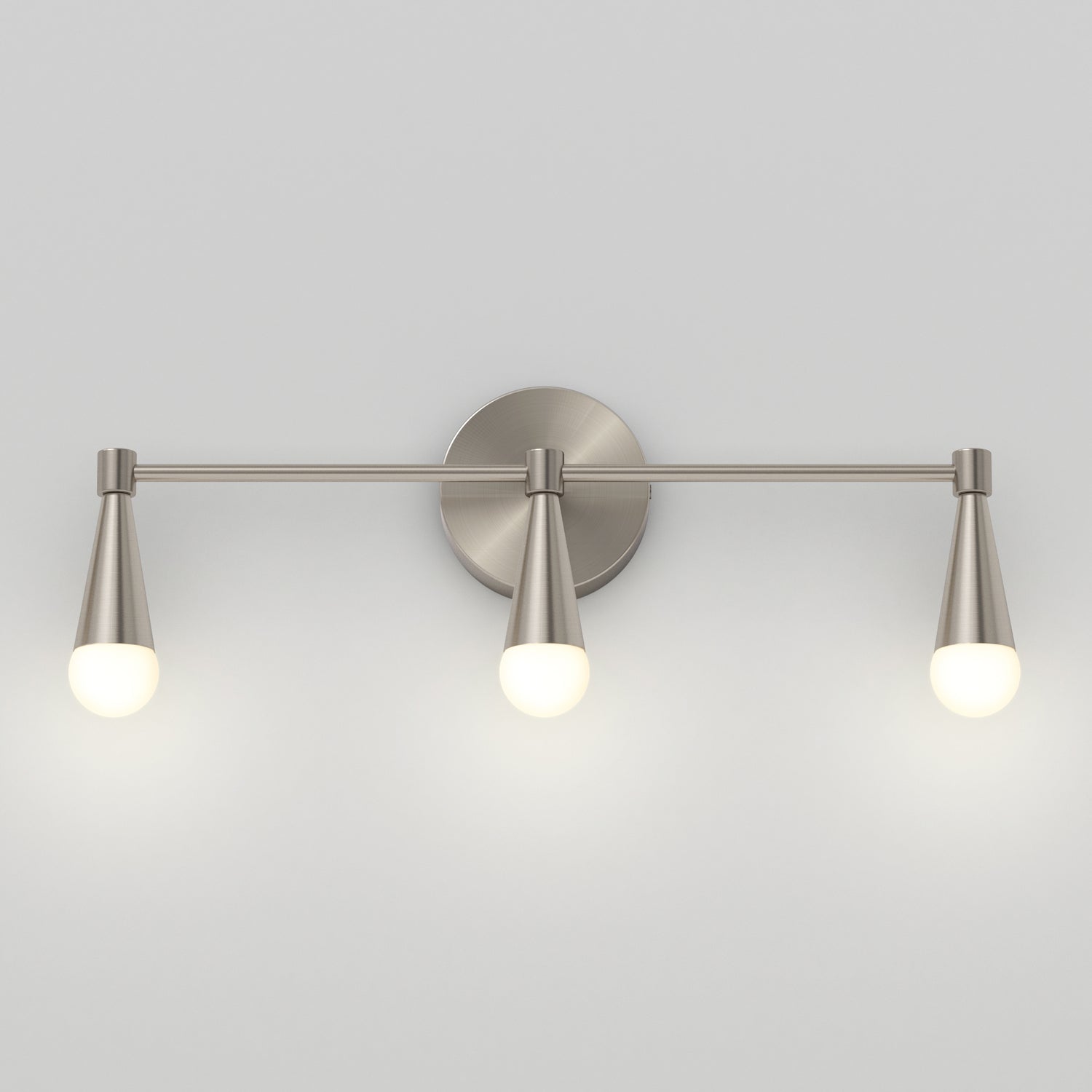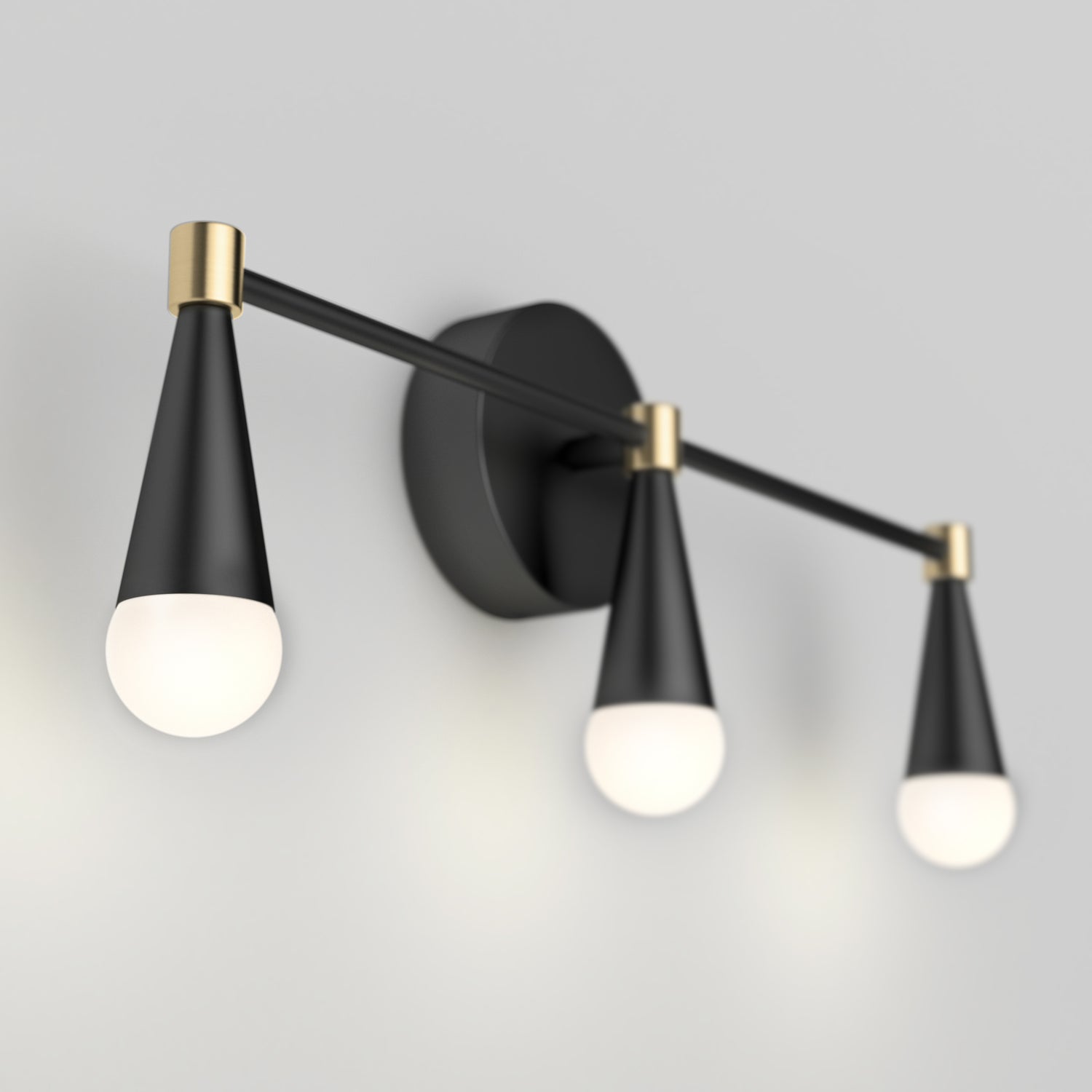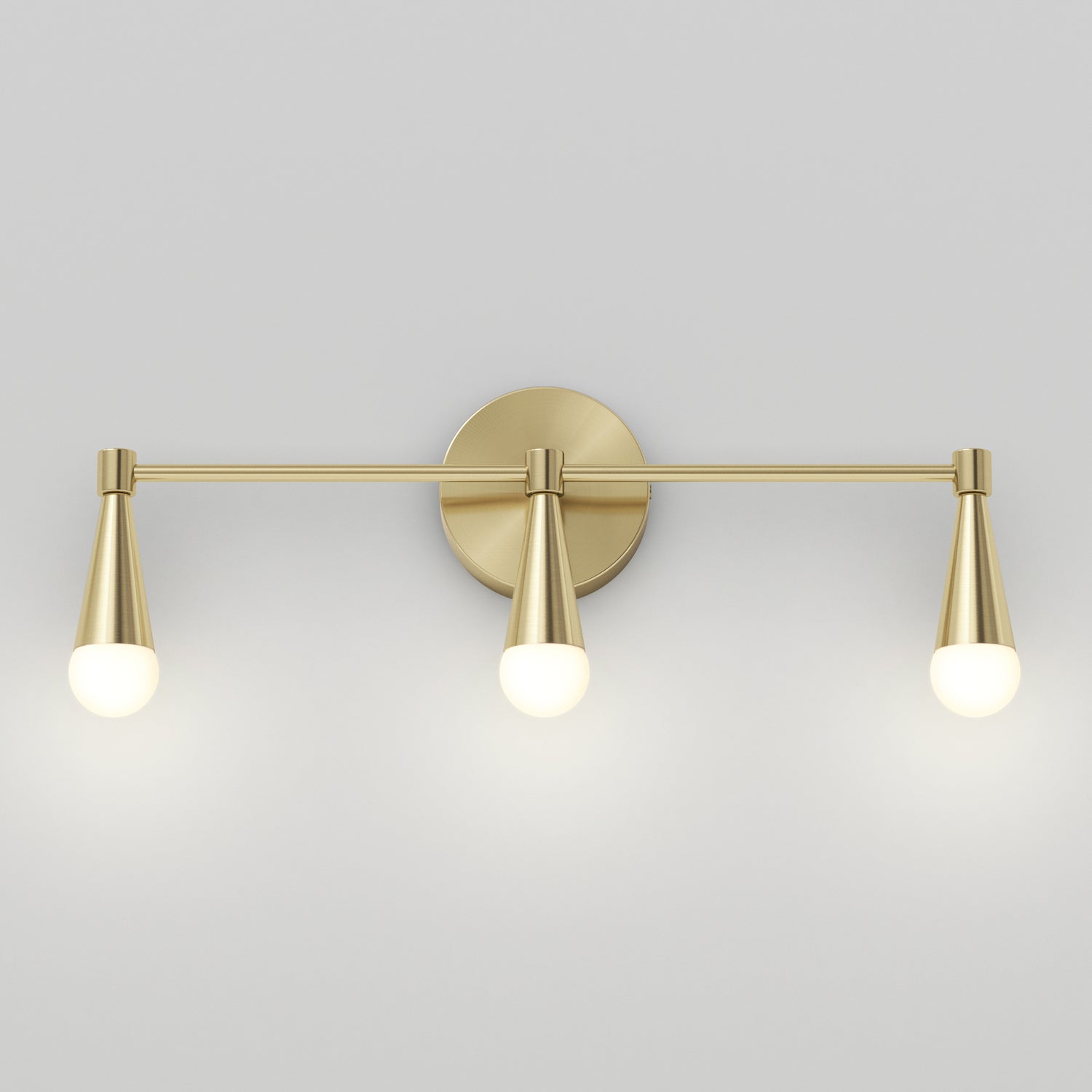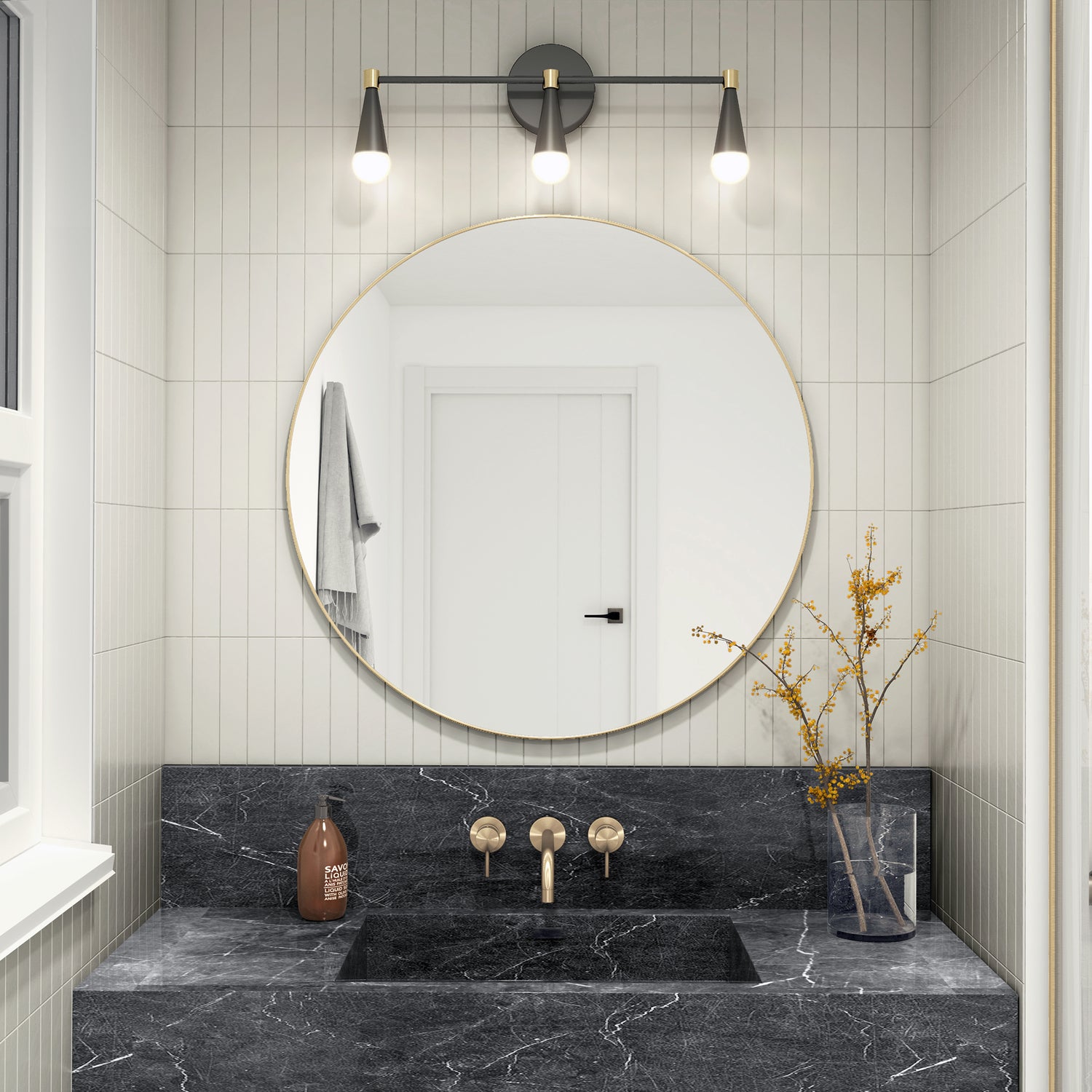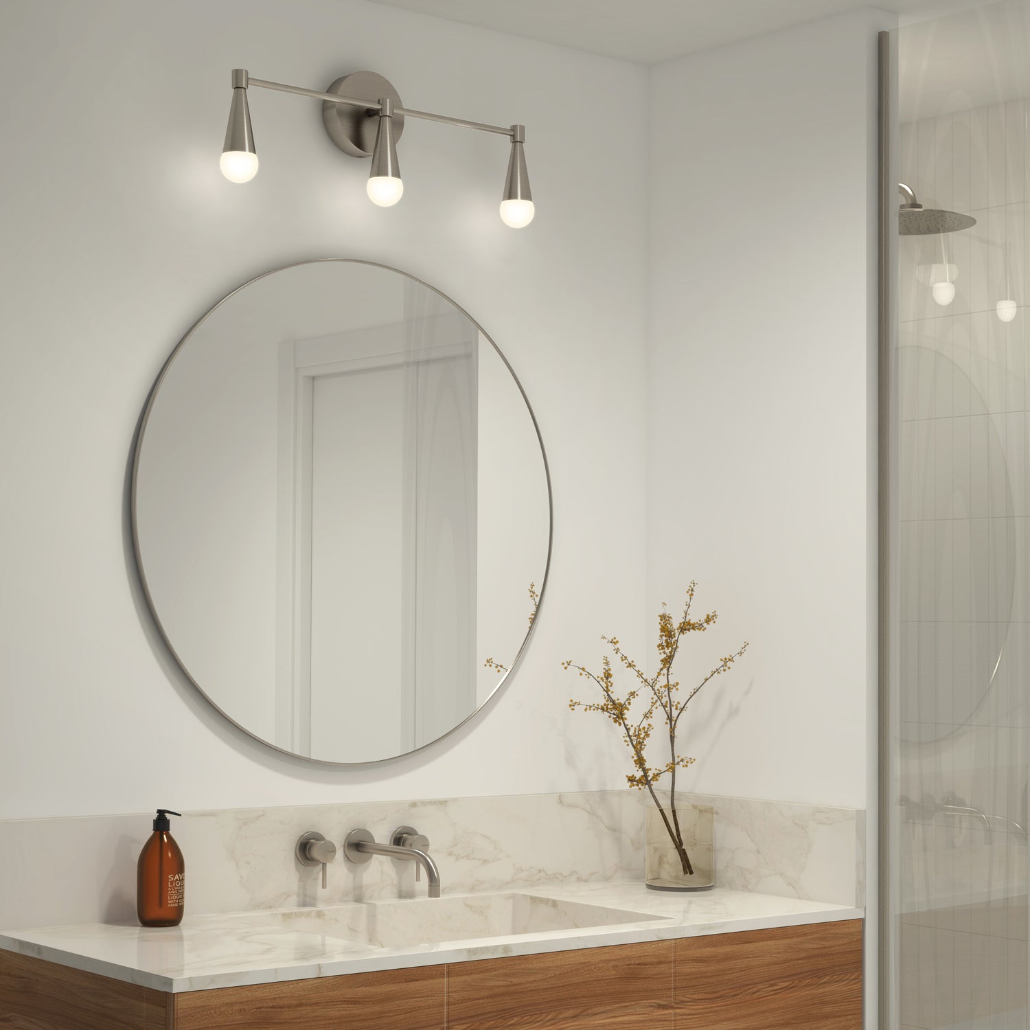 Este aplique de pared con luz led integrada consiste en 3 focos en forma de conos invertidos que se adaptan tanto a los decorados modernos como a los contemporáneos, transicionales o clásicos. Lucirá sobre el mueble de tocador de un baño pequeño o aseo.