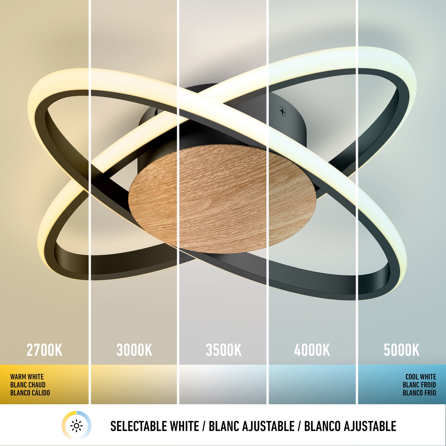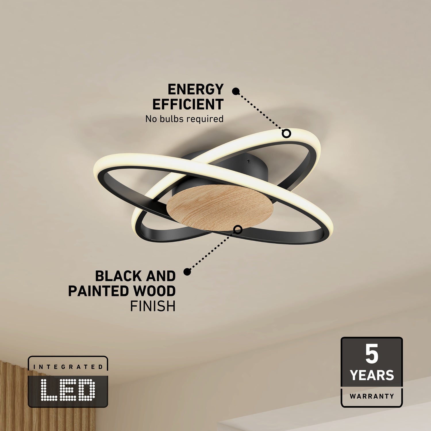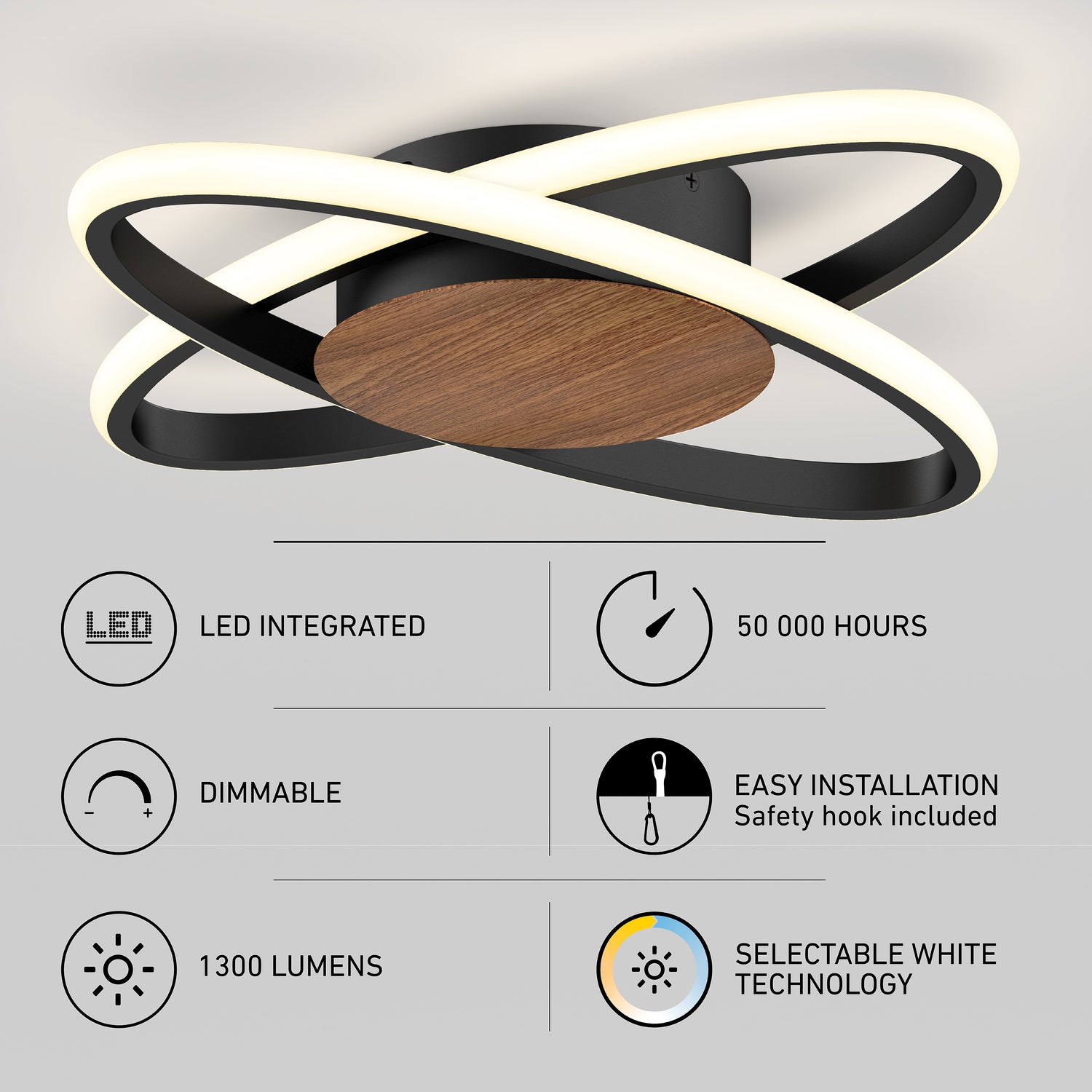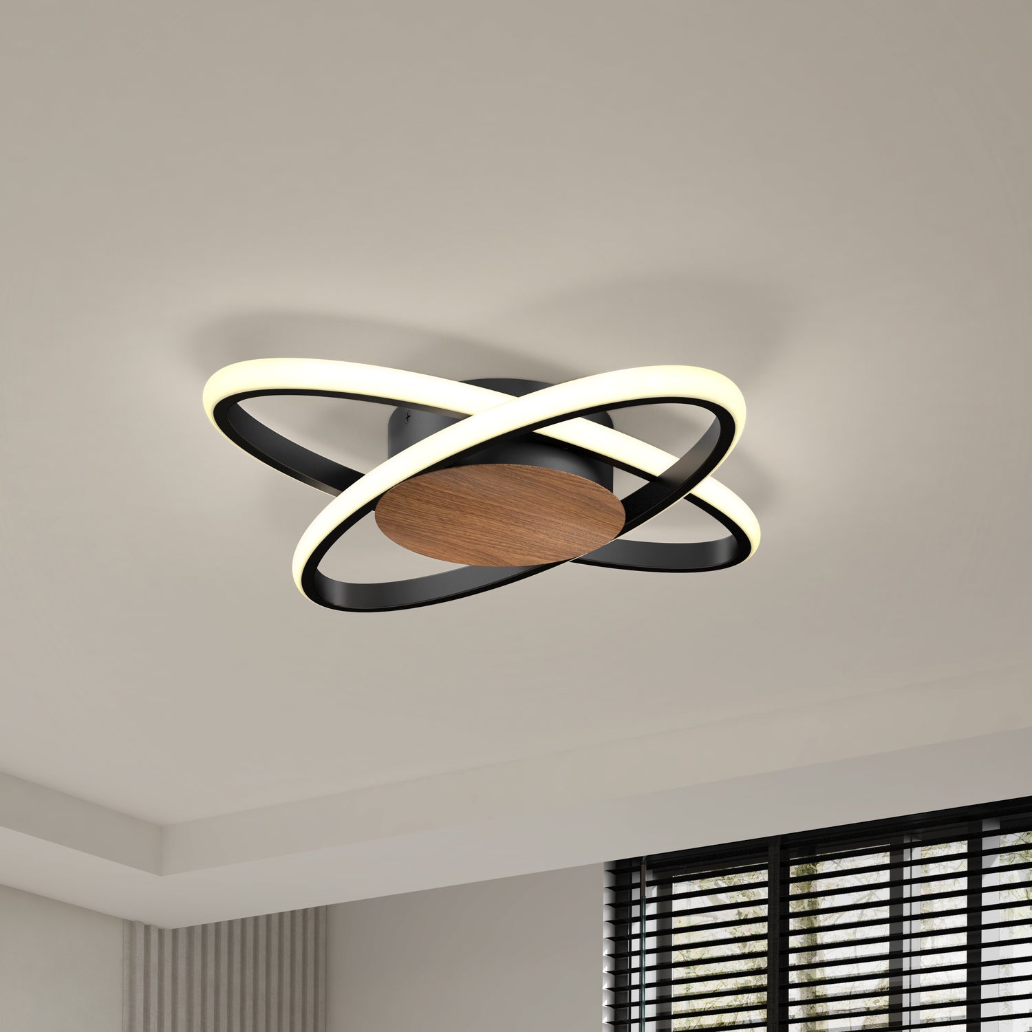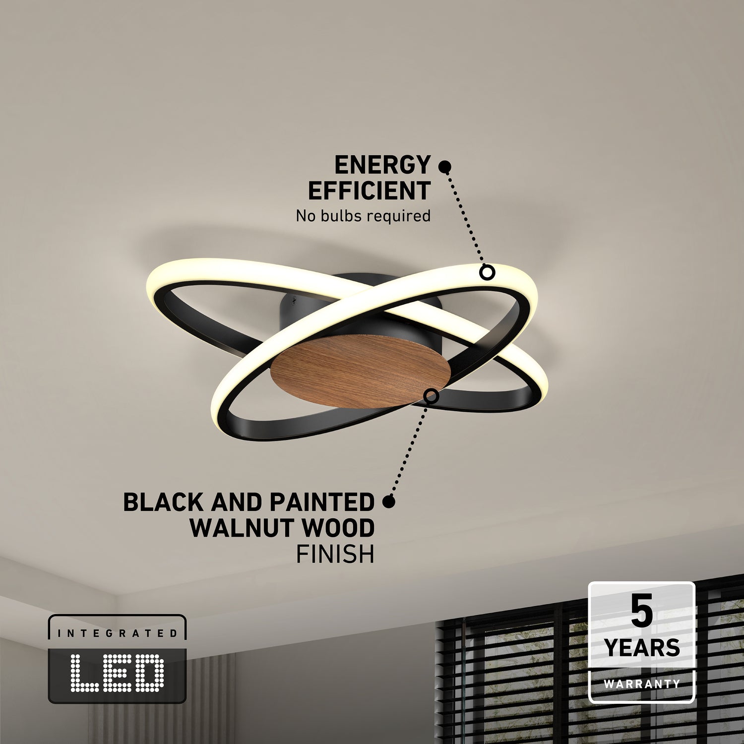 Inspiré de l’atome, le design de ce plafonnier à DEL intégrée envoûtera par ses anneaux illuminés entrecroisés, retenus par leur centre au fini bois peint. Installez-le dans les chambres à coucher, le bureau, la salle d’eau ou dans toute autre pièce de petite ou moyenne dimensions nécessitant un éclairage uniforme.