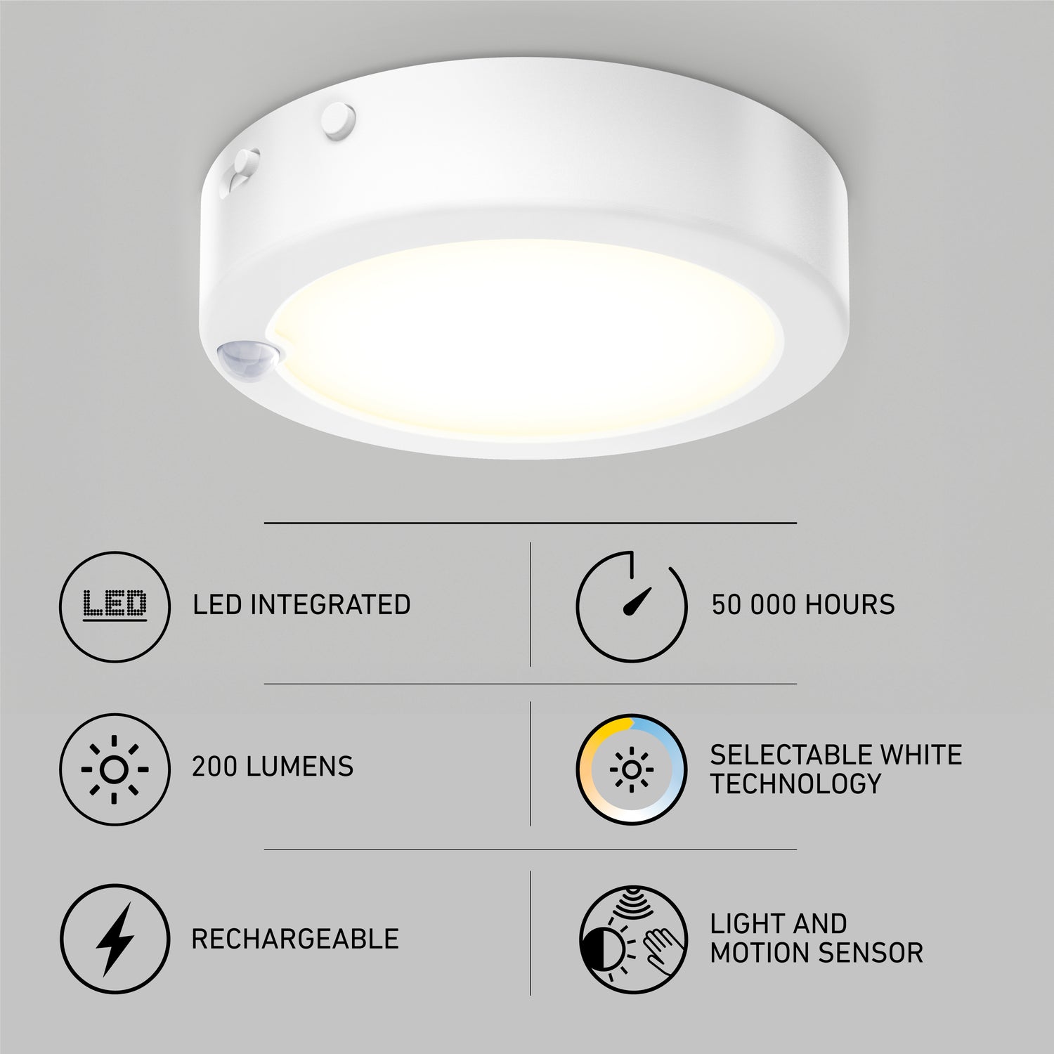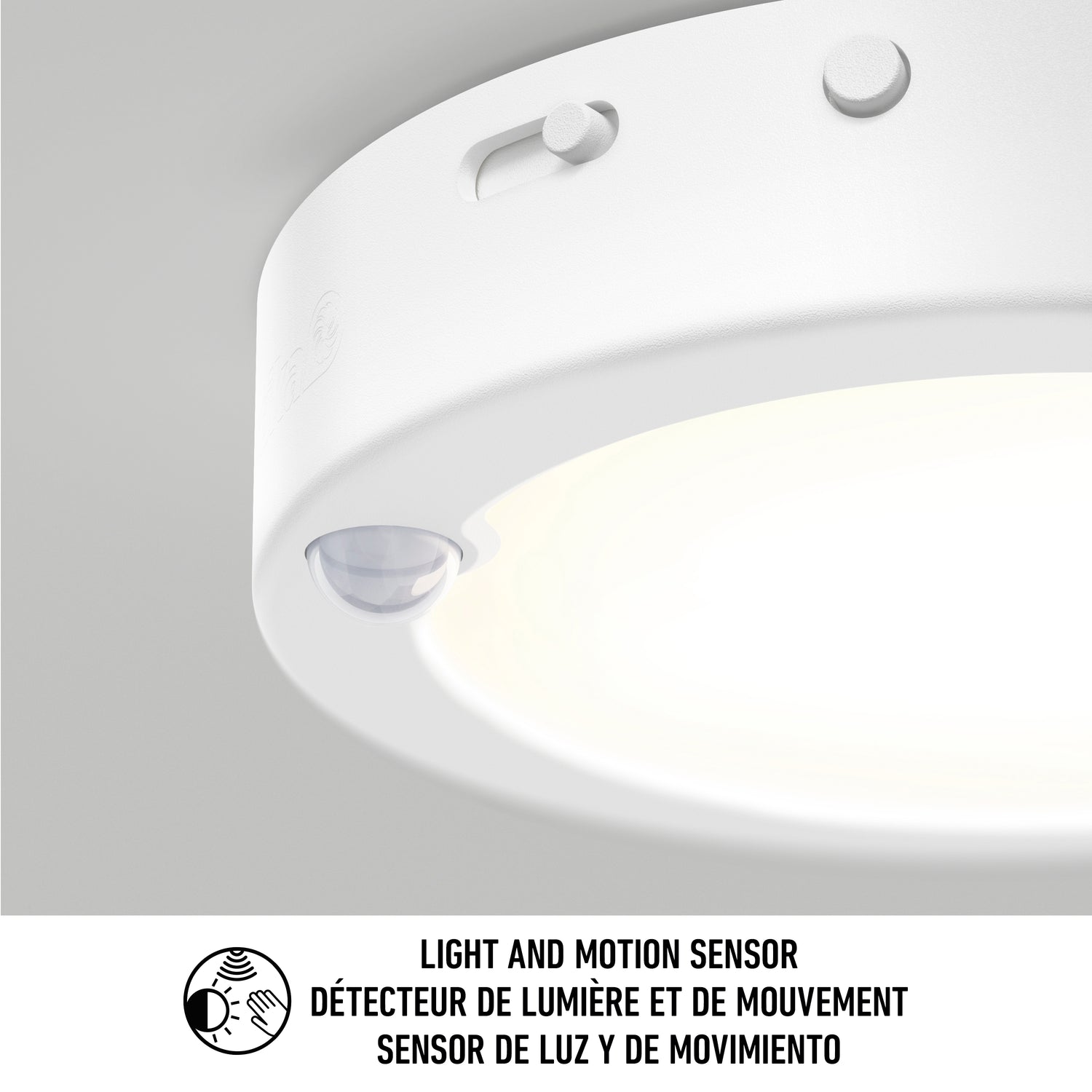 Each light offers 200 lumens of balanced illumination, with three adjustable shades of white, from warm to cool. They recharge with an included USB-C cable and provide up to four hours of light per charge. A light and motion sensor ensures they activate only when needed. Lifespan: 50,000 hours.