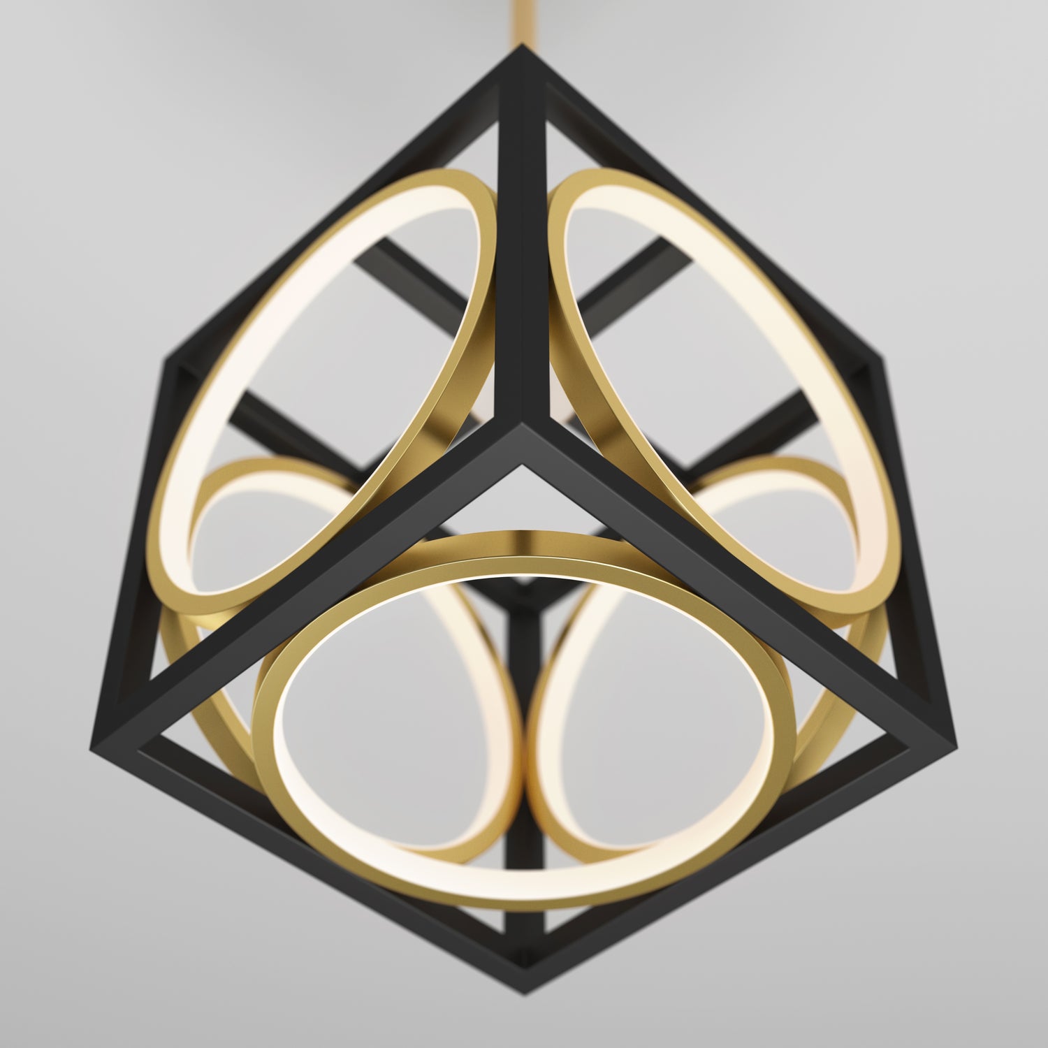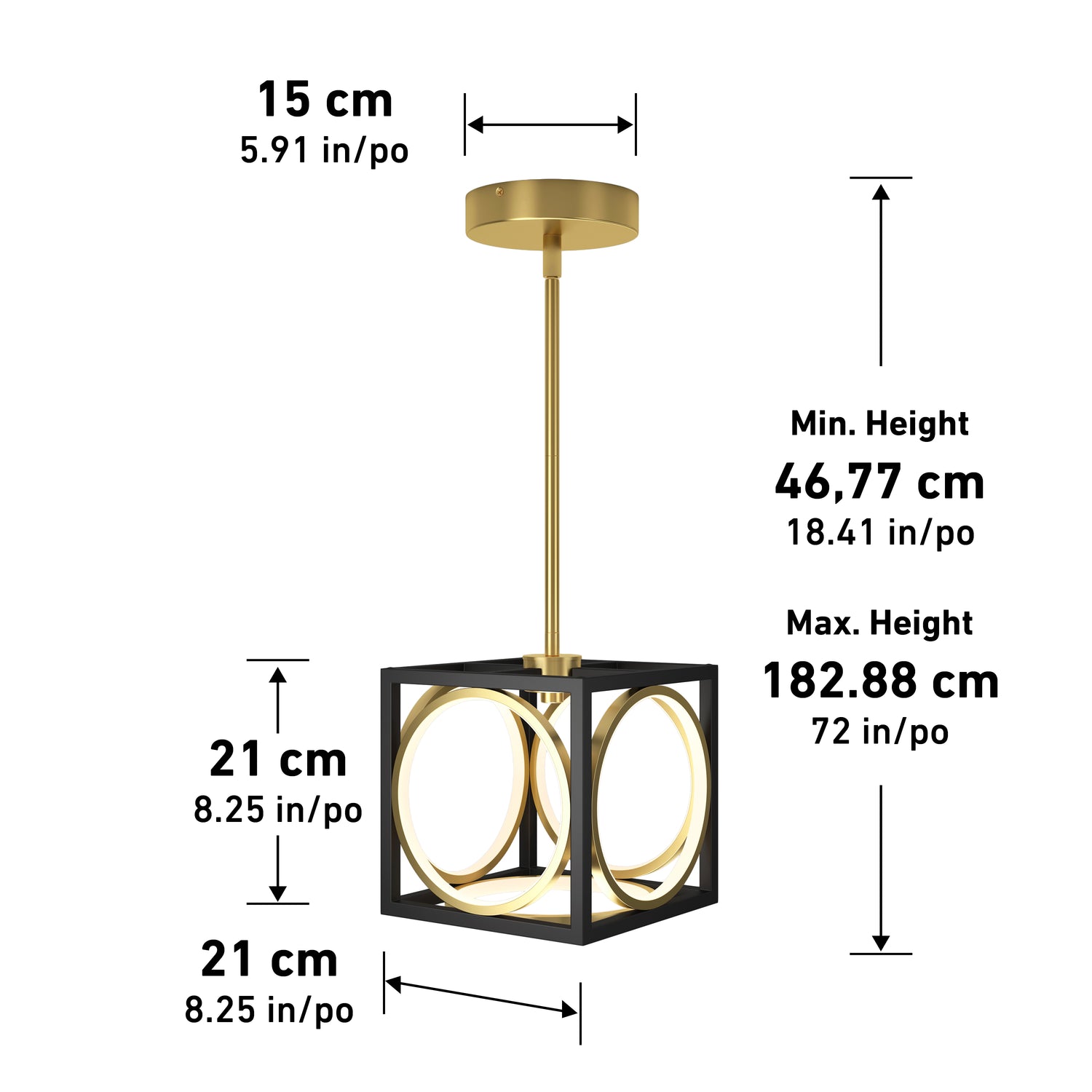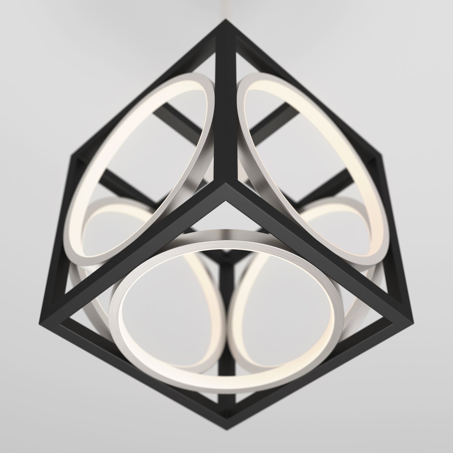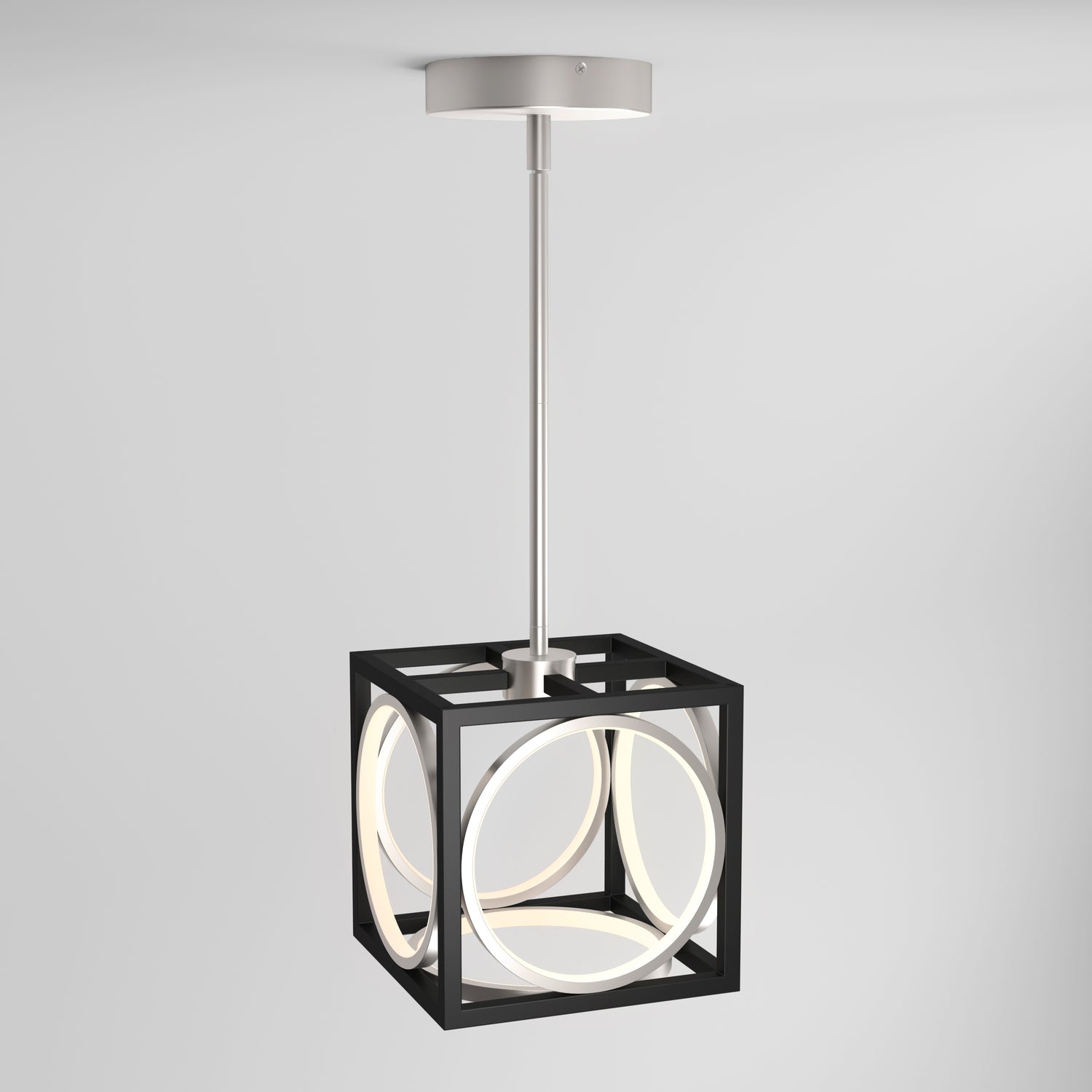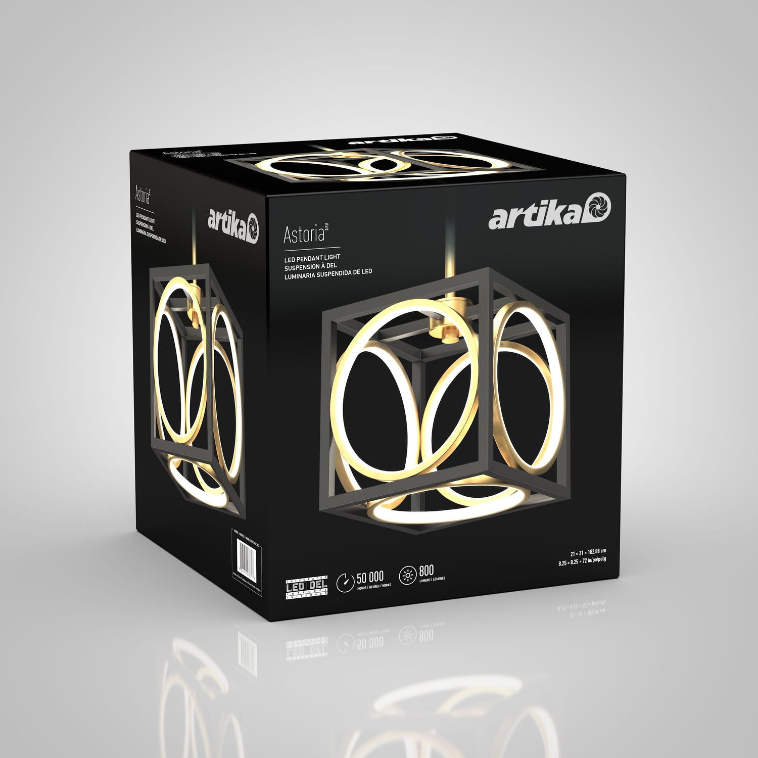 The Artika Astoria LED modern pendant light features a black cube frame with a circular LED inside, suspended from a silver ceiling mount against a plain white background.