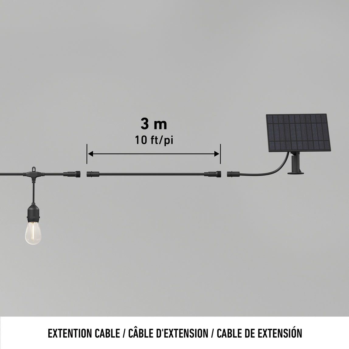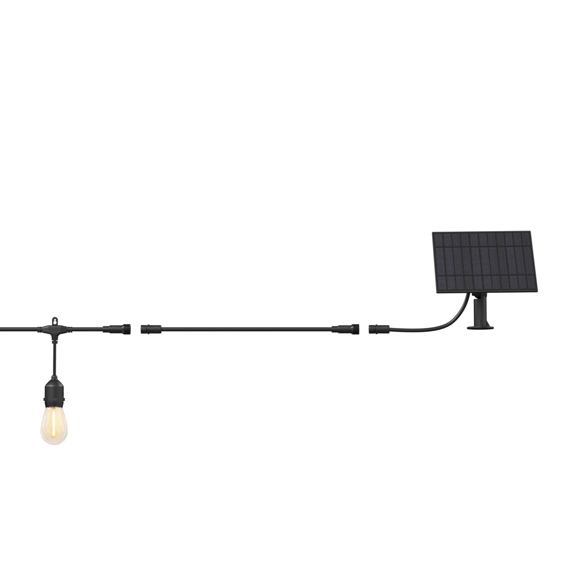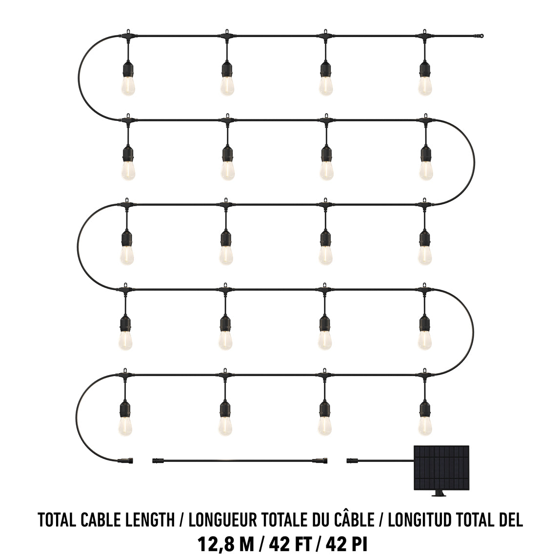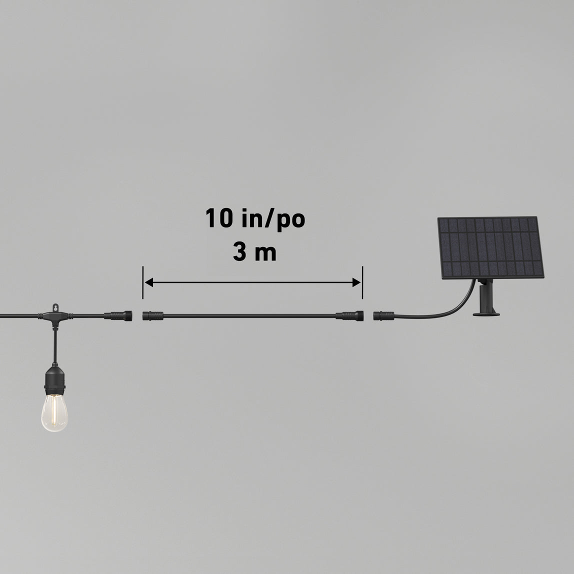 With a 12.8 m (42 ft) length, it can illuminate large areas using any of its 4 lighting modes. The 3 m (10 ft) extension cord allows the solar panel to be placed in the sunniest spot of your yard. It mounts on a wall (with screws), in the ground (with a stake), or on a panel (with its mounting clip). It can also be recharged via USB-C.
