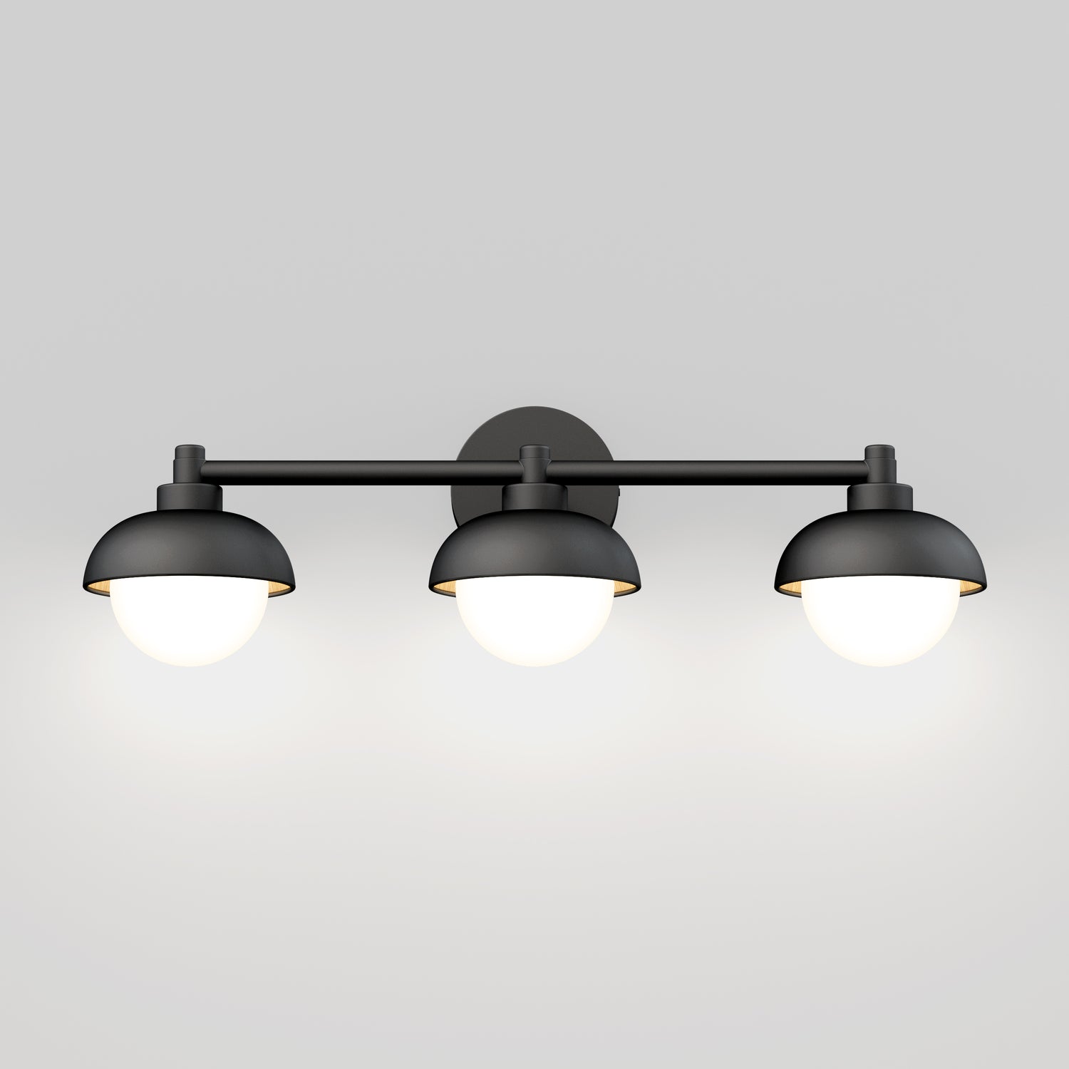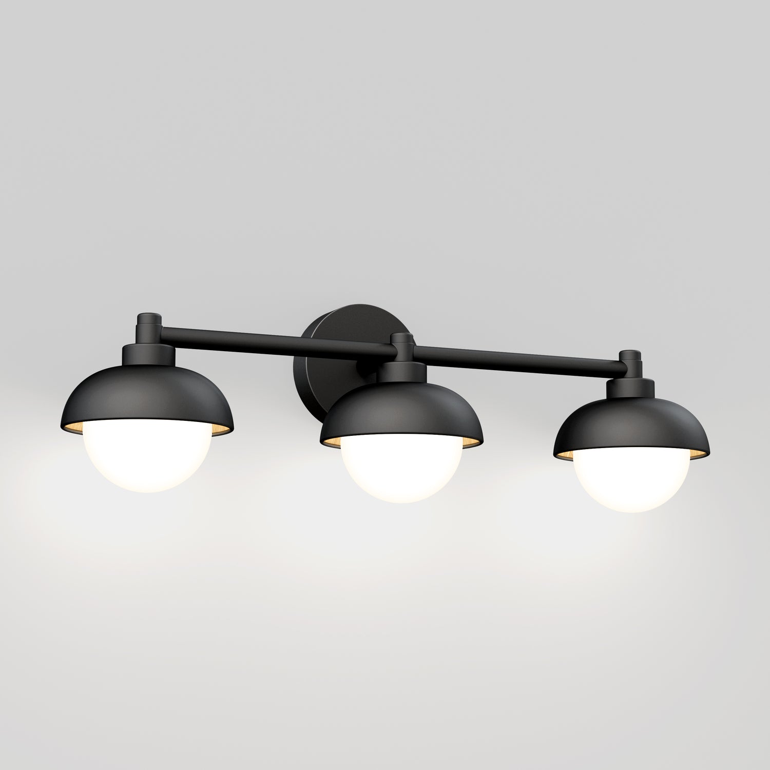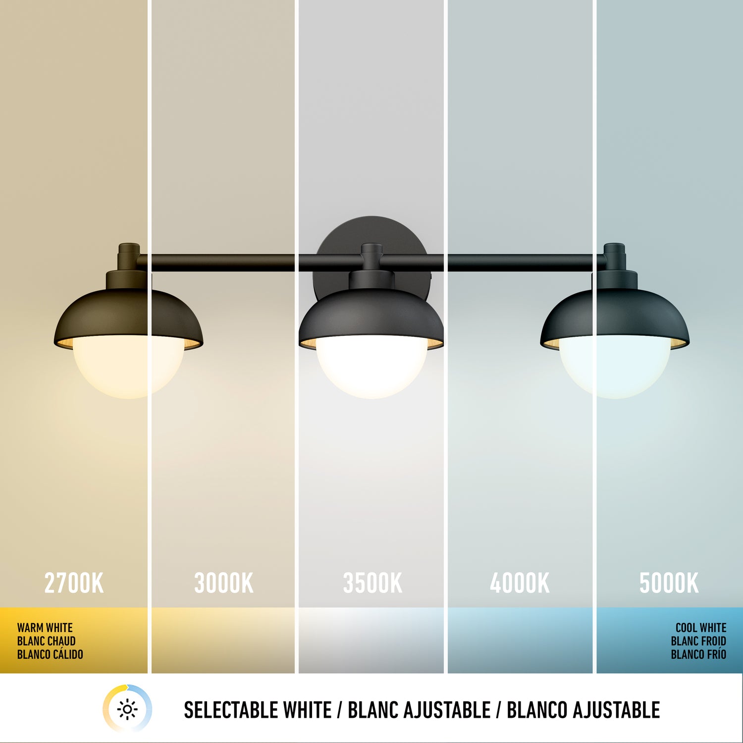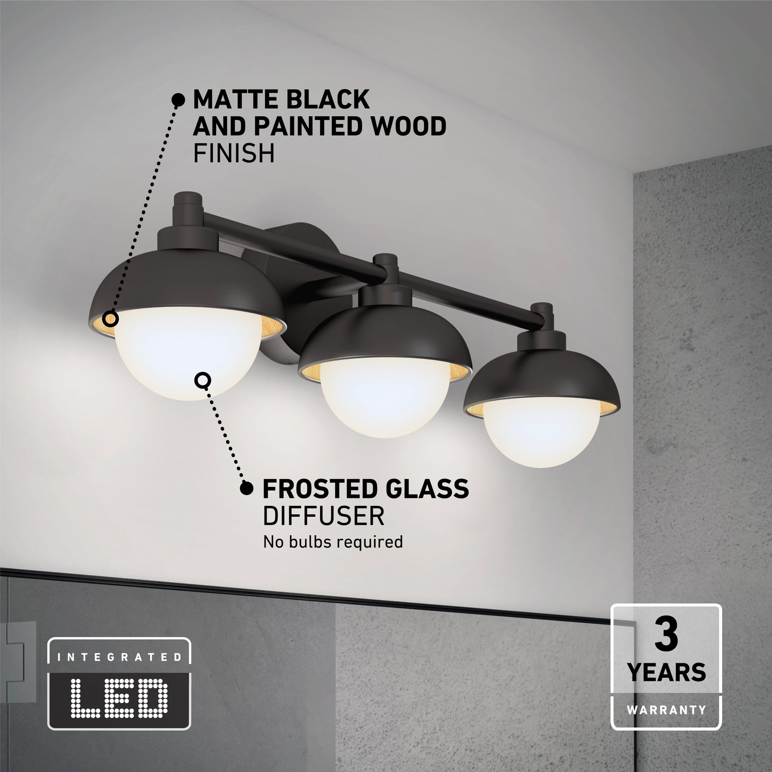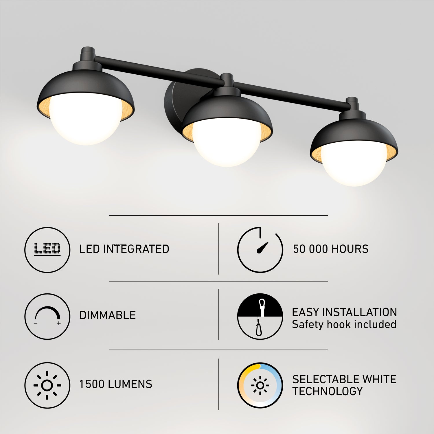 Equipped with three spherical lights, this LED wall sconce mounts above the bathroom sink to gently illuminate faces. Its curves, wood finish, and retro touches add warmth and softness to any modern interior. With an output of 1,500 lumens, it's compatible with most LED dimmers. The luminaire features adjustable colour-temperature technology that lets you select from five shades, ranging from warm to cool. Lifespan: 50,000 hours.