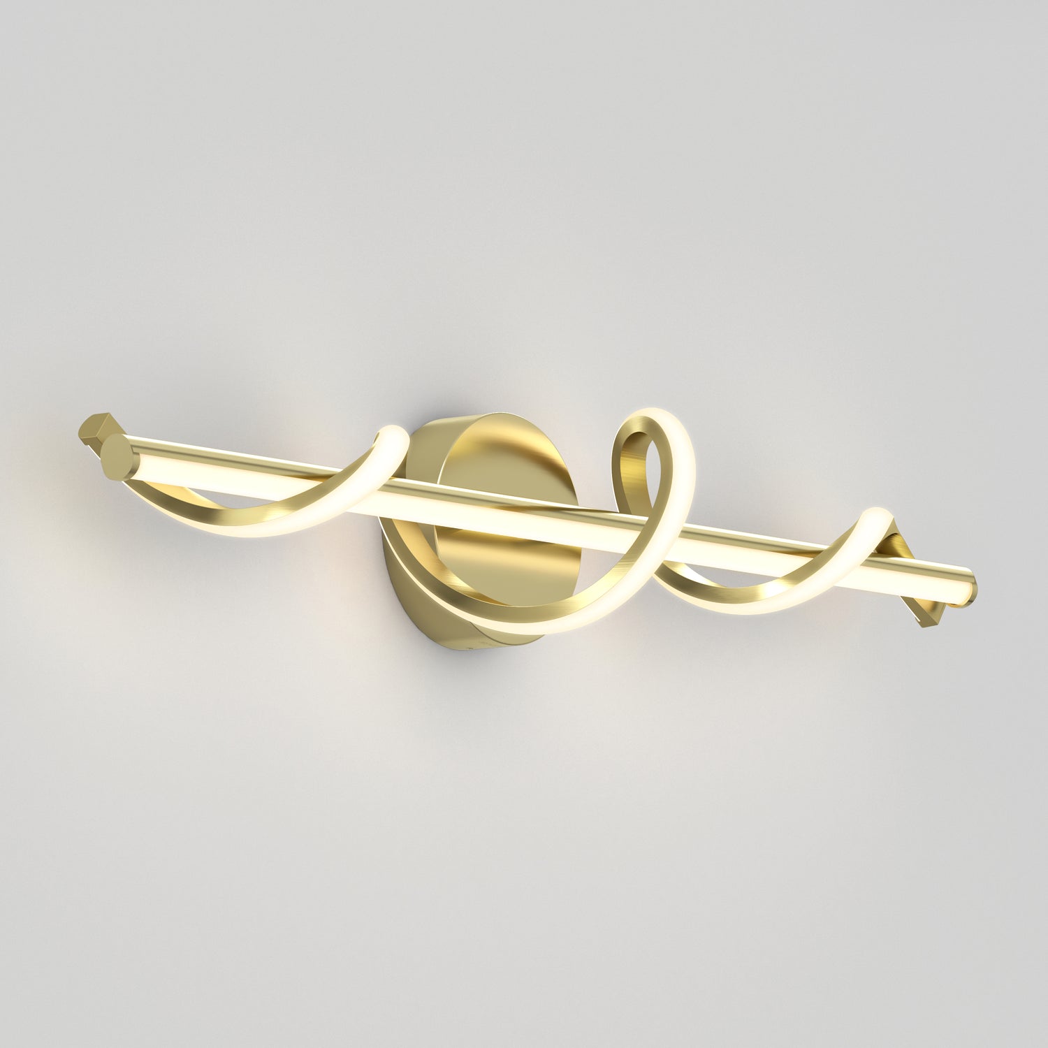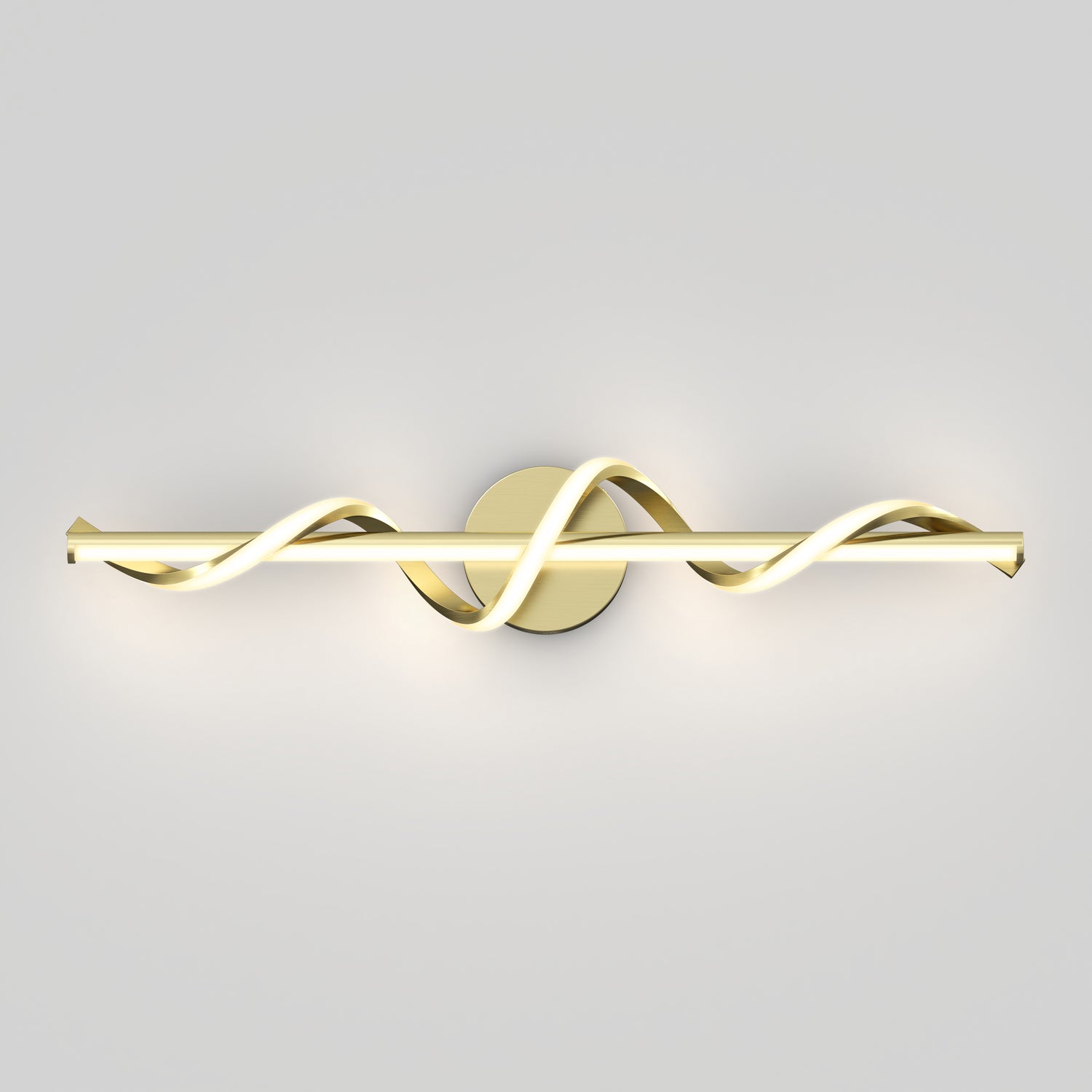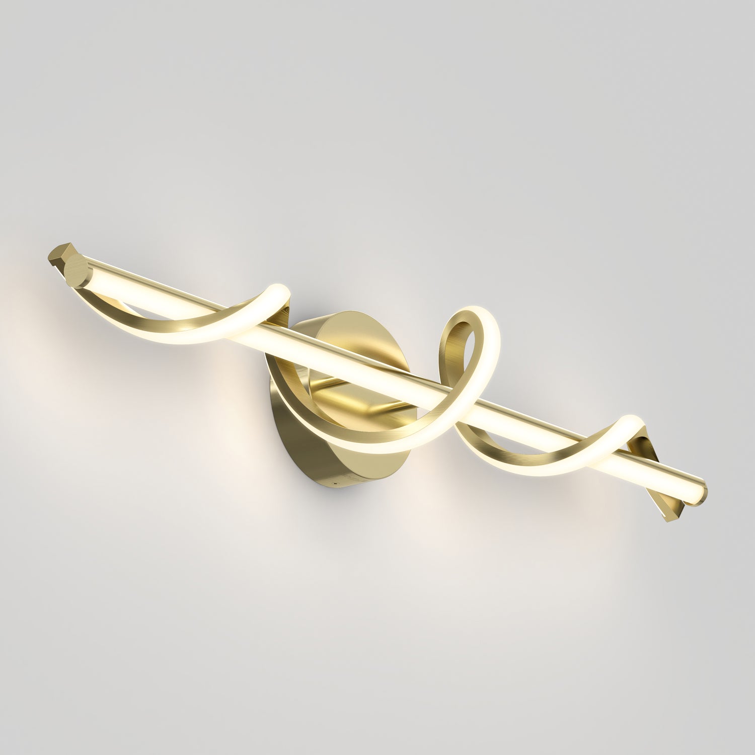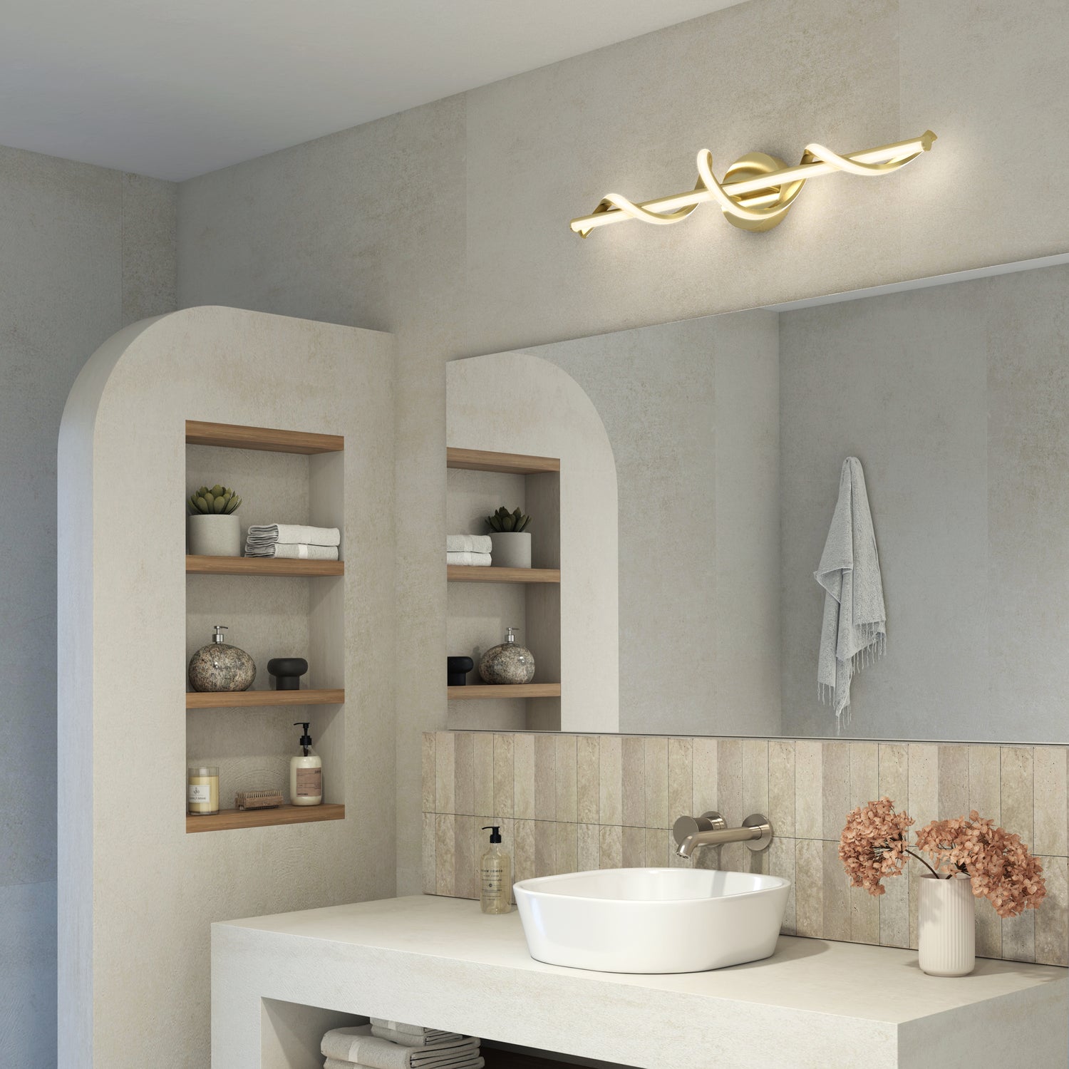 This sculptural wall sconce features a straight illuminated bar wrapped in a softly lit spiral, creating a bold yet elegant statement. Its contemporary design is a natural fit for minimalist bathrooms, casting a warm, ambient light above the mirror.