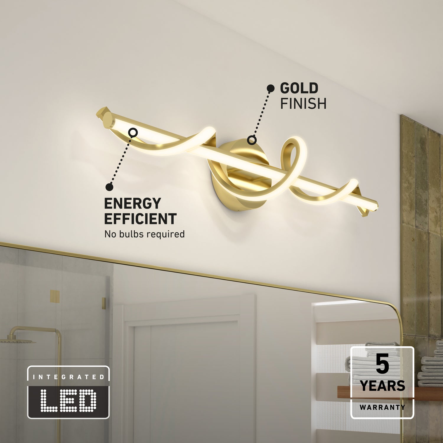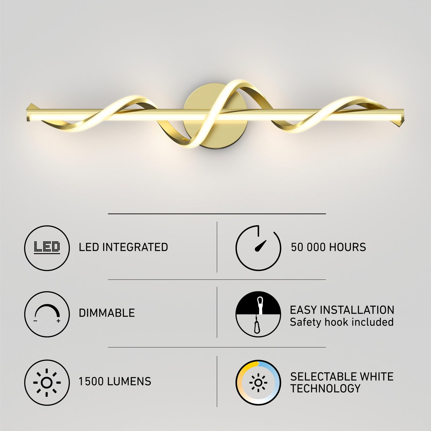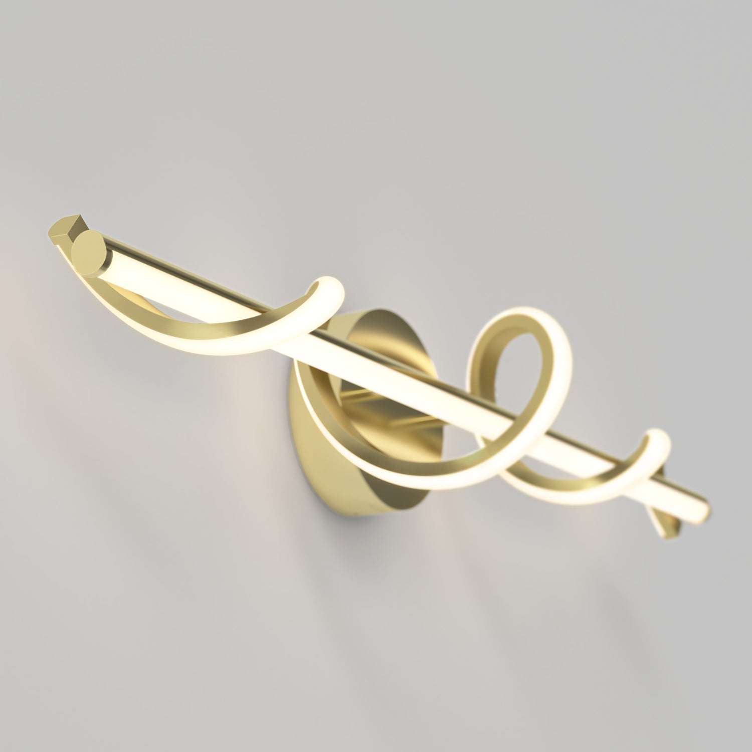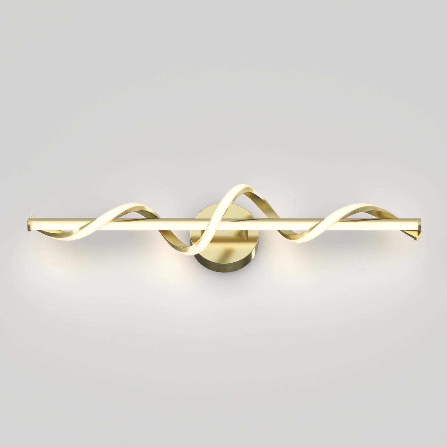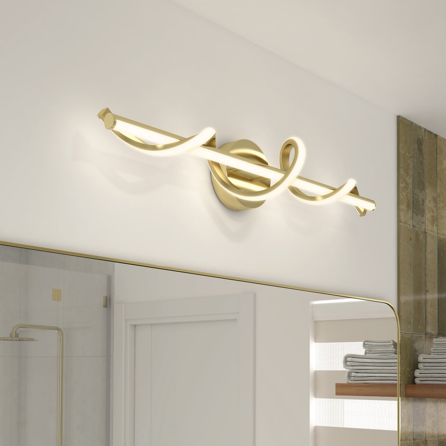 This sculptural wall sconce features a straight illuminated bar wrapped in a softly lit spiral, creating a bold yet elegant statement. Its contemporary design is a natural fit for minimalist bathrooms, casting a warm, ambient light above the mirror.