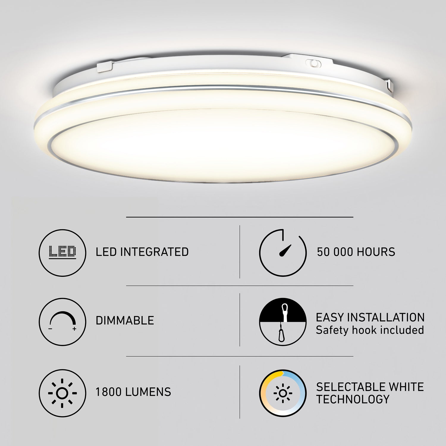 With a brightness of 1,800 lumens, it’s well-suited for medium-sized rooms. The light can be dimmed using an LED-compatible dimmer, and you can easily select from three white tones to suit your space. Lifespan: 50,000 hours.