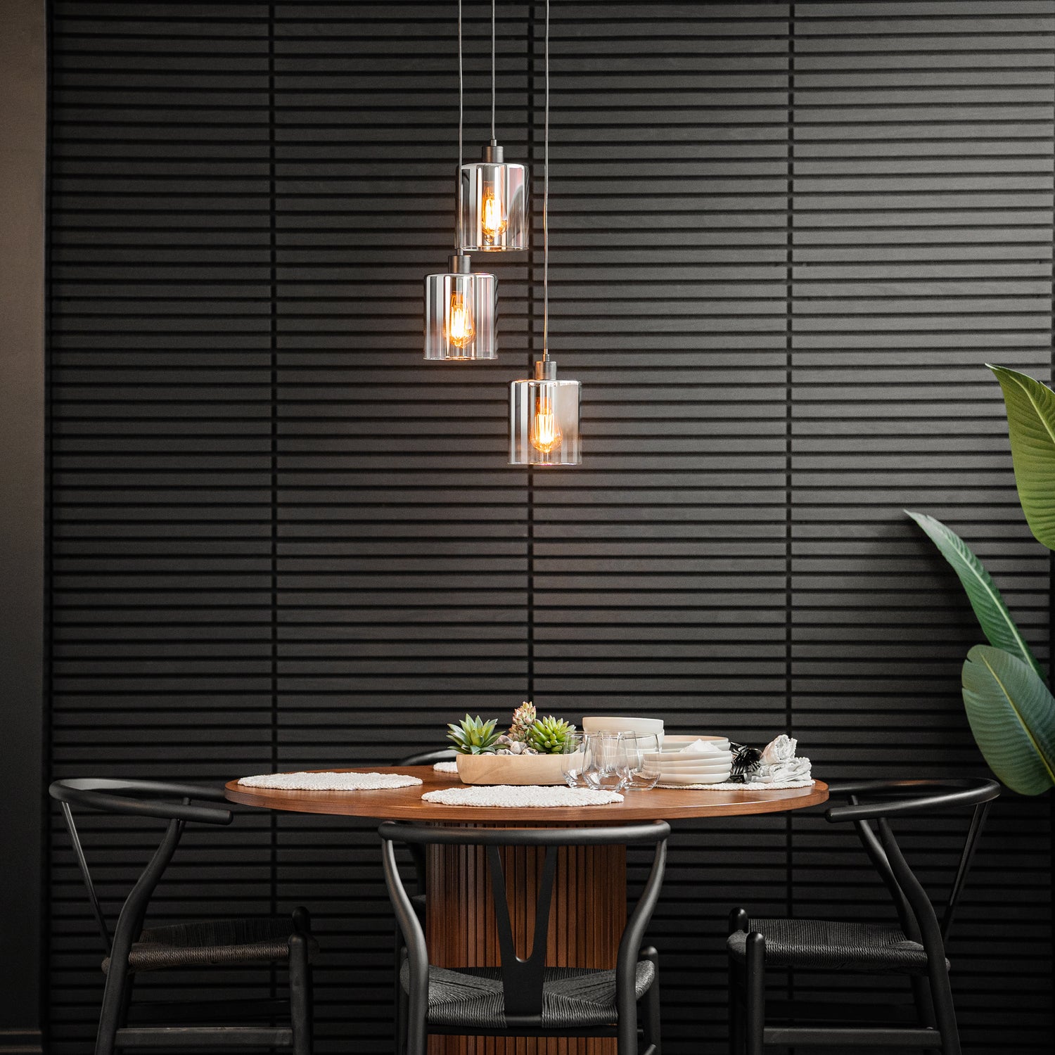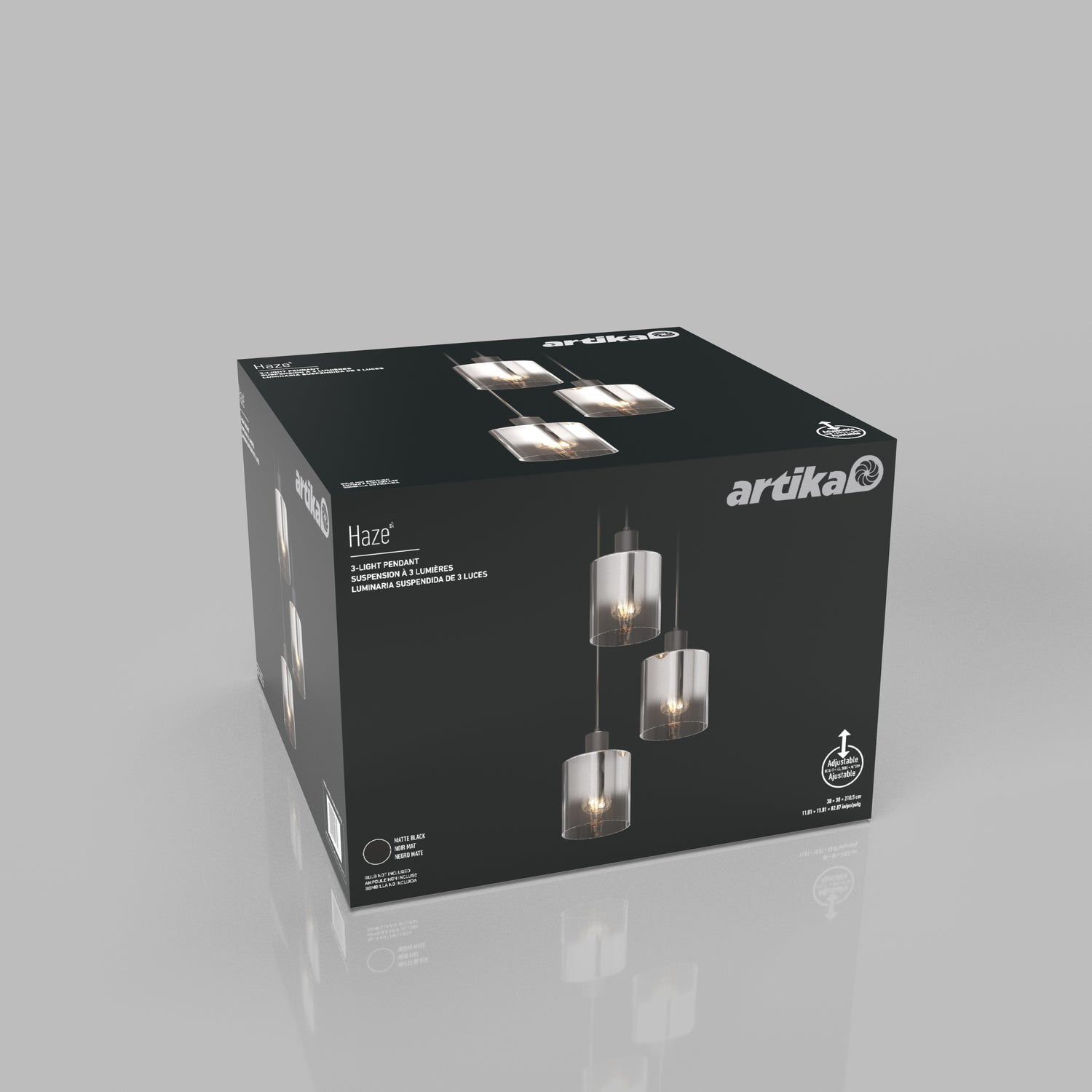 The Artika Haze modern 3-light pendant features three clear glass shades with visible bulbs, each hanging at different lengths from a round black canopy.