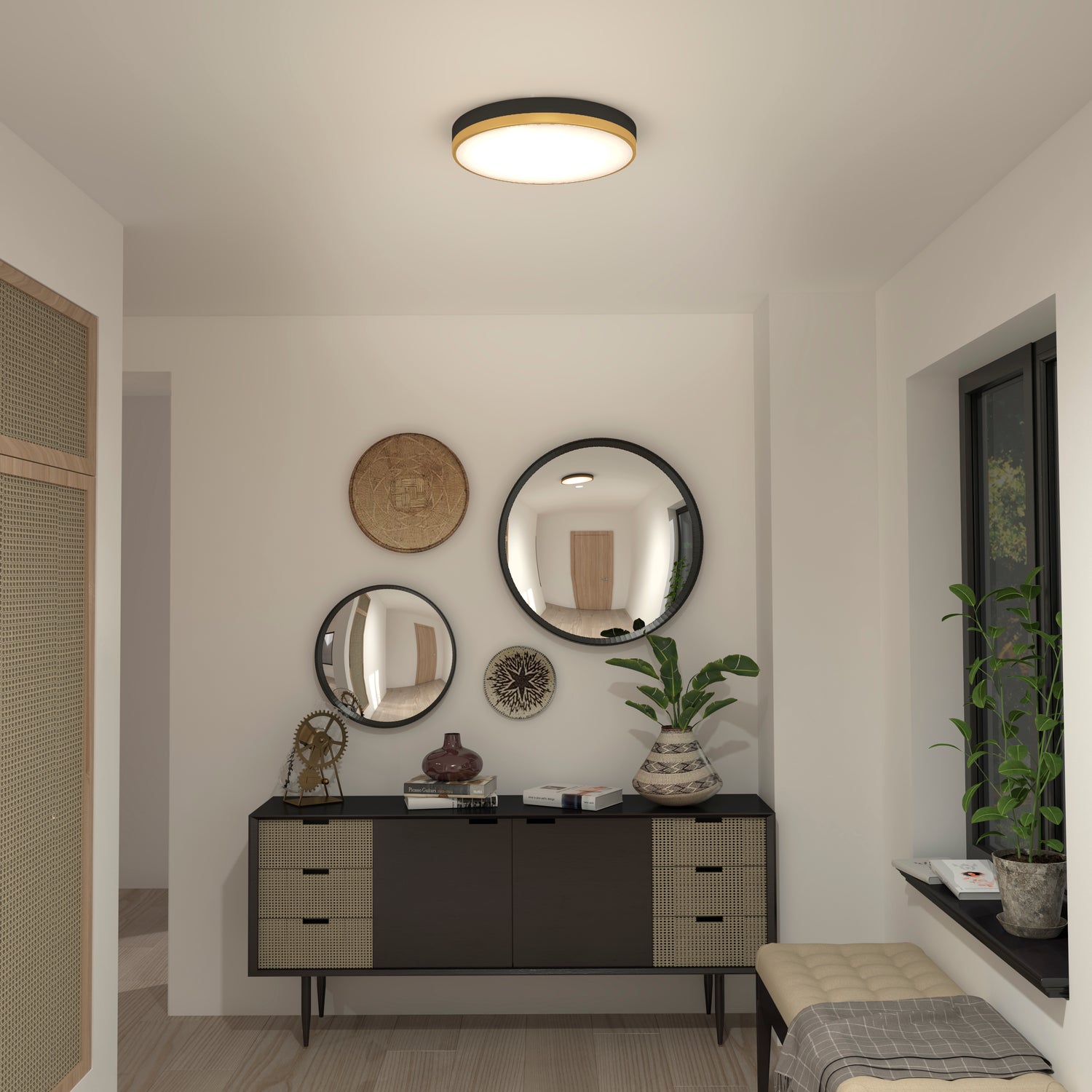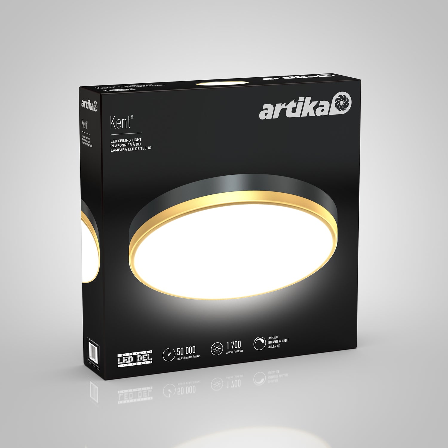 Choosing the Kent LED ceiling light means choosing a luminaire that's as chic as it is functional. The curved design emphasizes its light sources, while a black finish enhances its brightness. Modern, minimal, and styled with a golden ring, it provides your living space with that little je ne sais quoi, amazing all your guests. Simply put, this ceiling light takes your ambiance to the next level.The Kent LED ceiling light is easy to install and compatible with most dimmers. And thanks to its glass diffuser, it offers uniform brightness that's easy on the eyes.