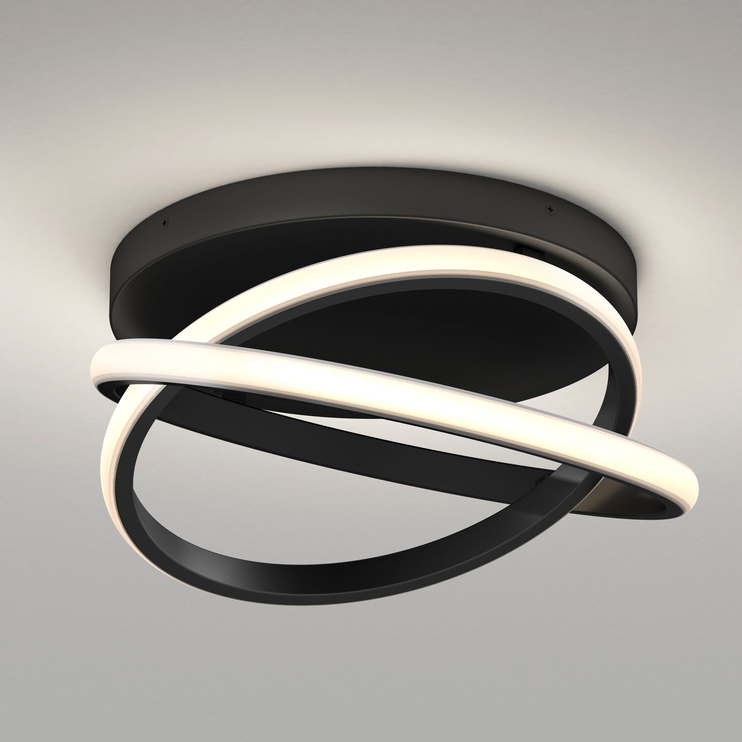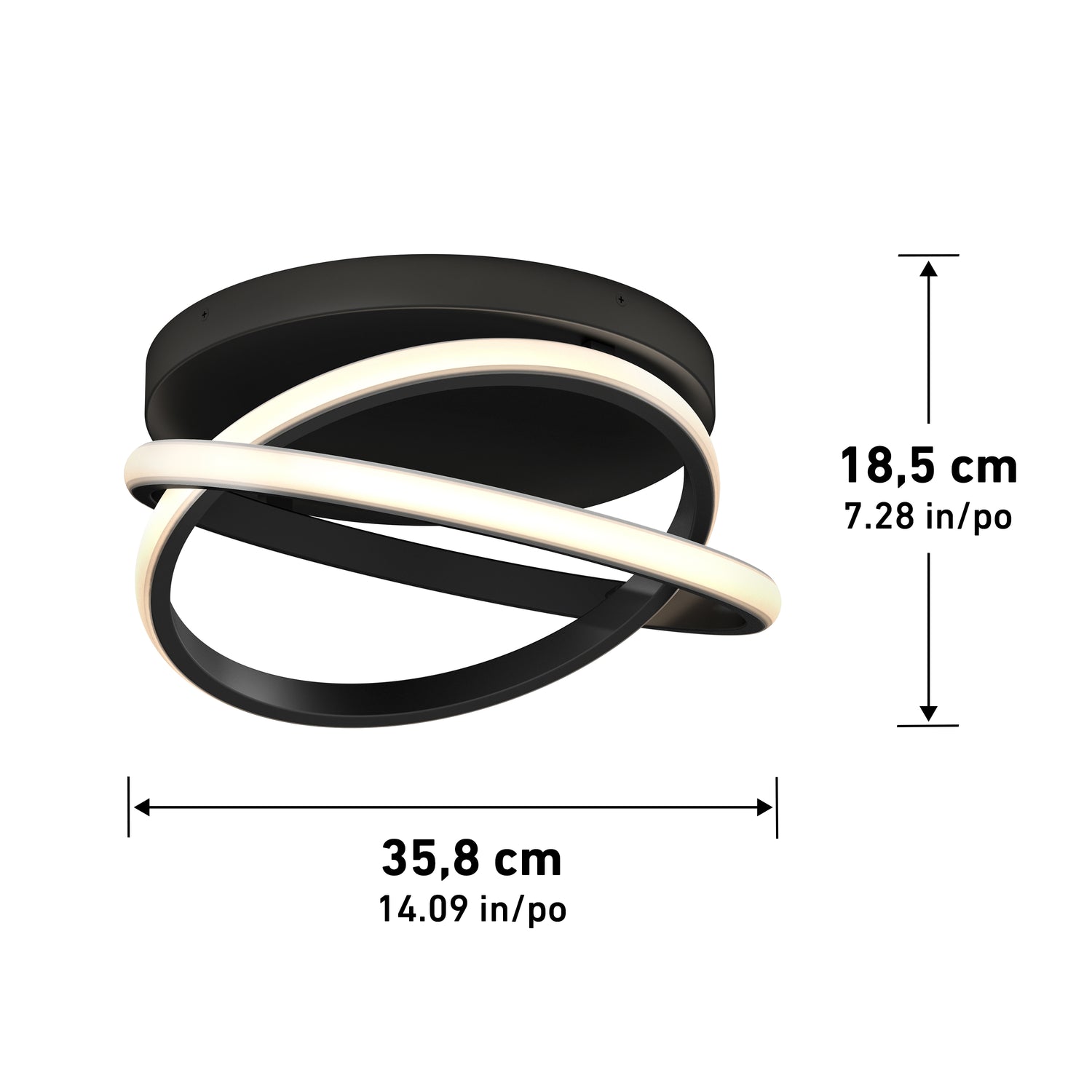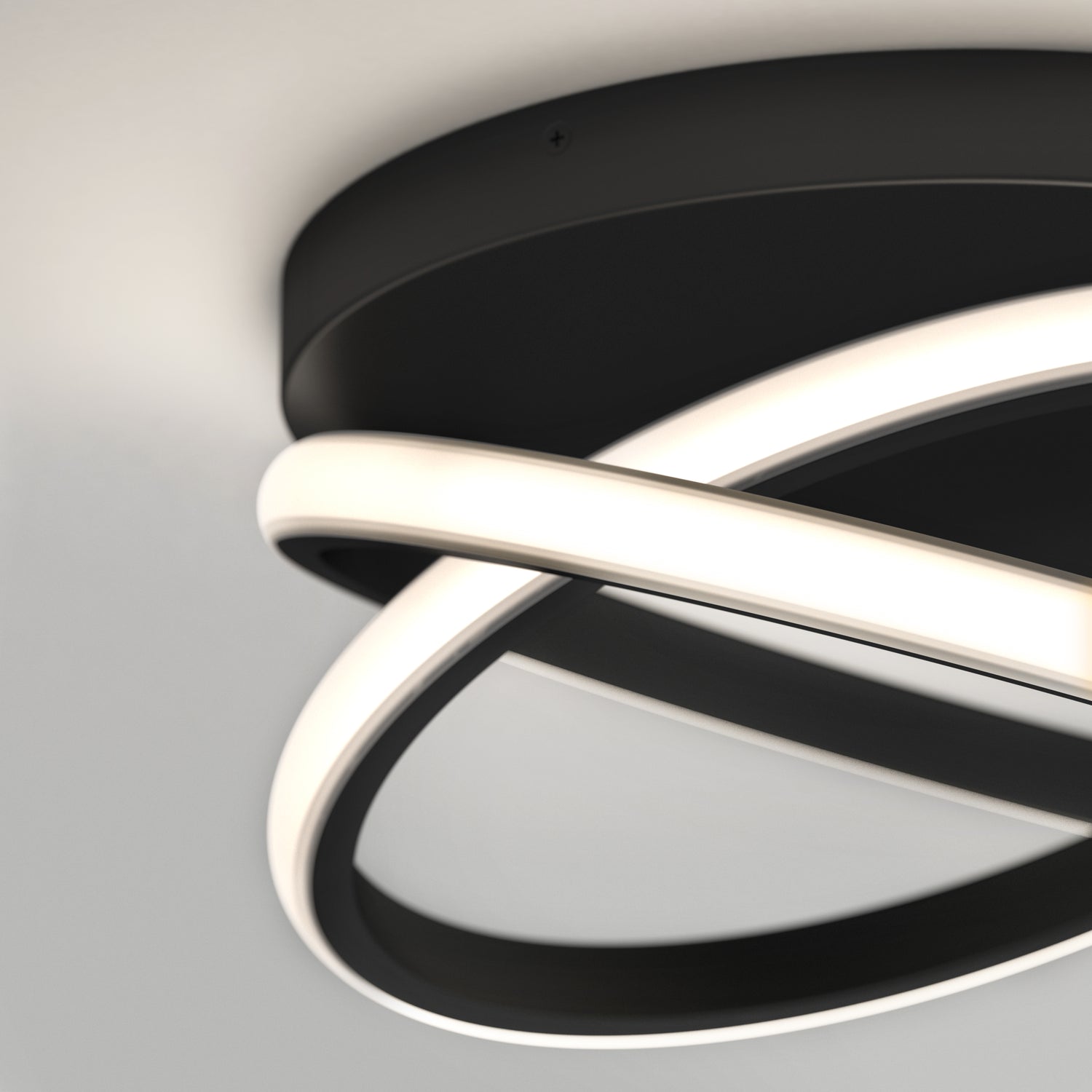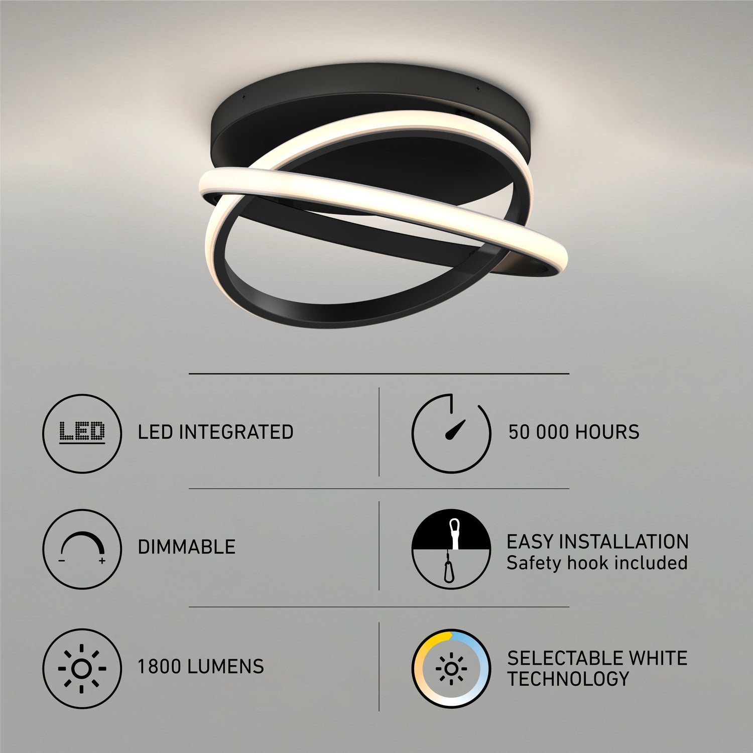 Designed with the themes of infinity and orbital motion in mind, this LED ceiling light showcases two intersecting backlit circles. Its matte black finish makes it a natural fit for contemporary bedrooms and offices. The luminaire emits 1,800 lumens and can be subdued with an LED-compatible dimmer. To integrate smoothly with other lighting, it offers adjustable colour-balance technology, inviting you to choose from three shades of white. Lifespan: 50,000 hours.