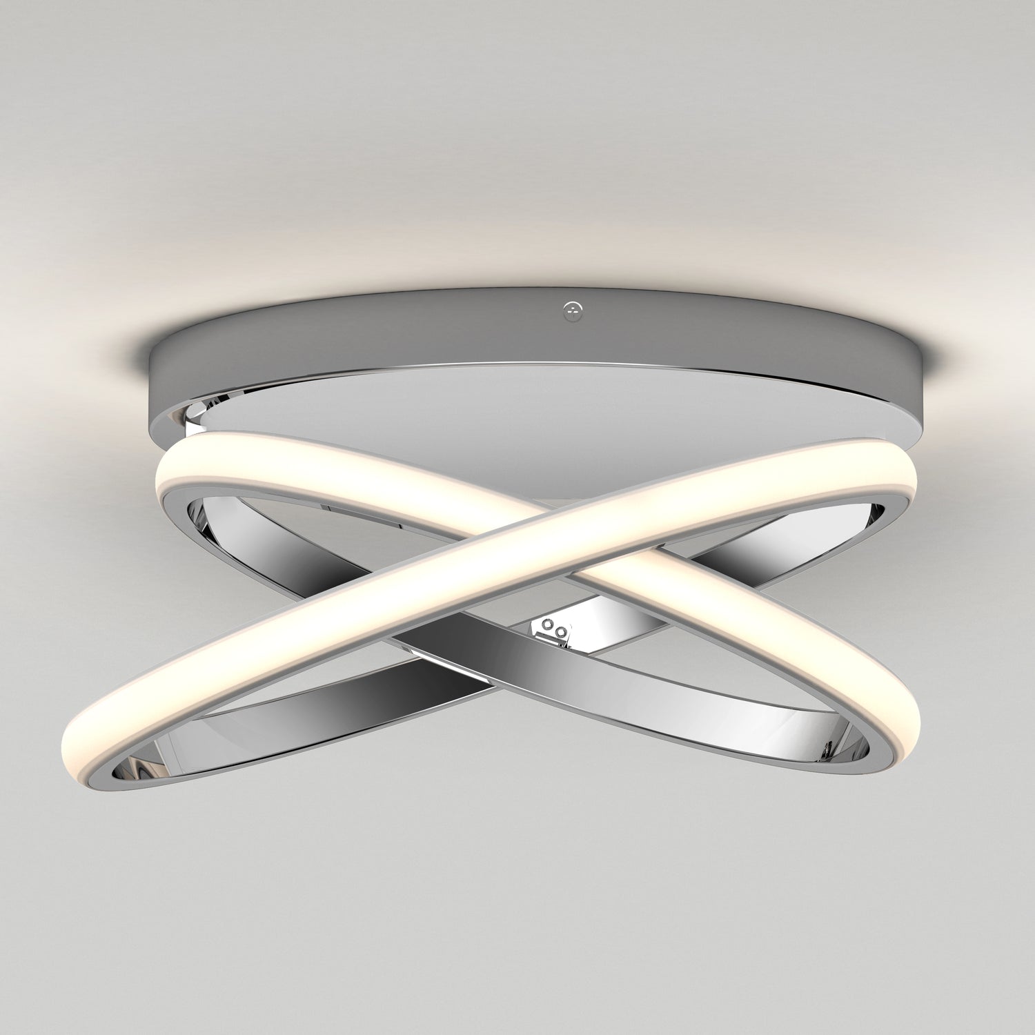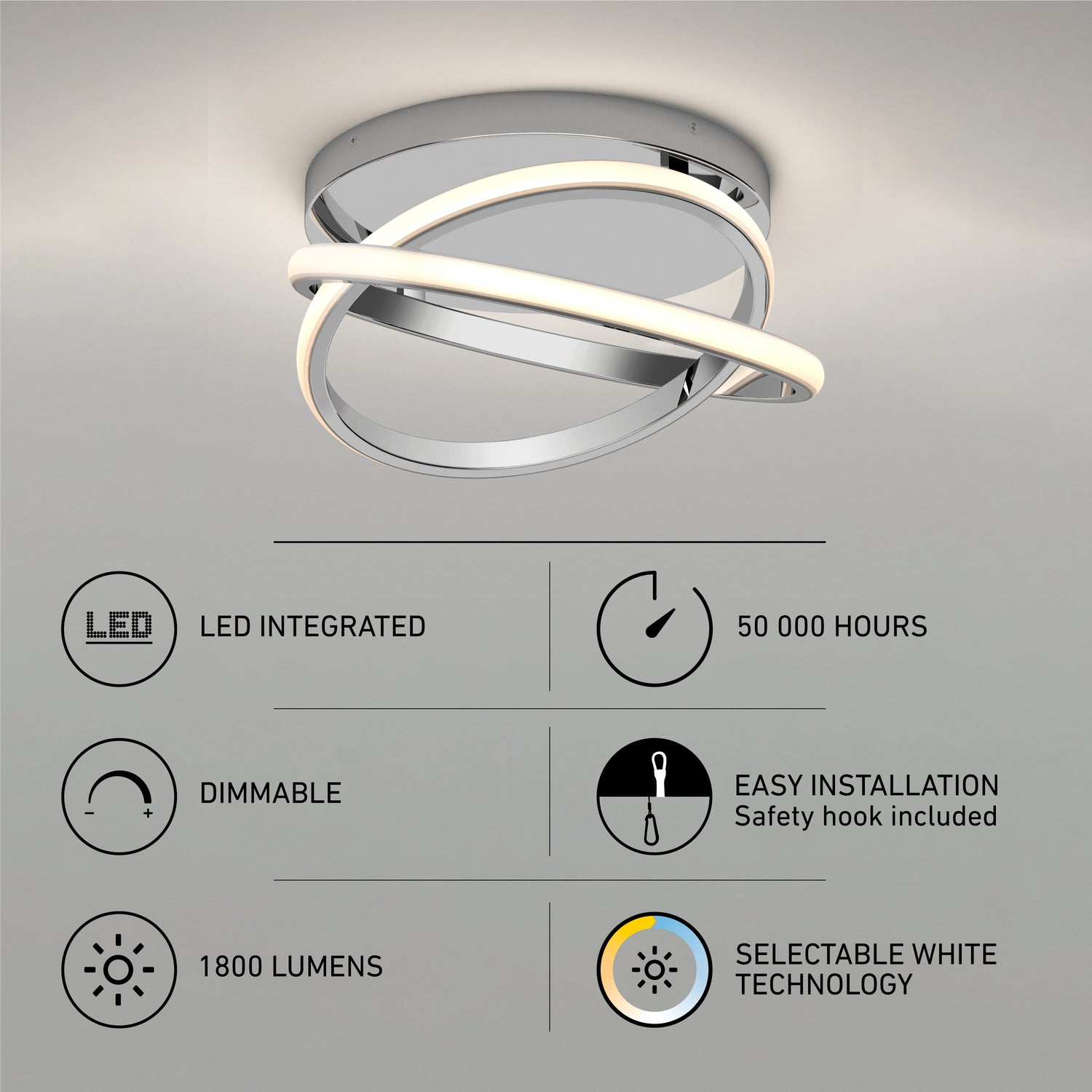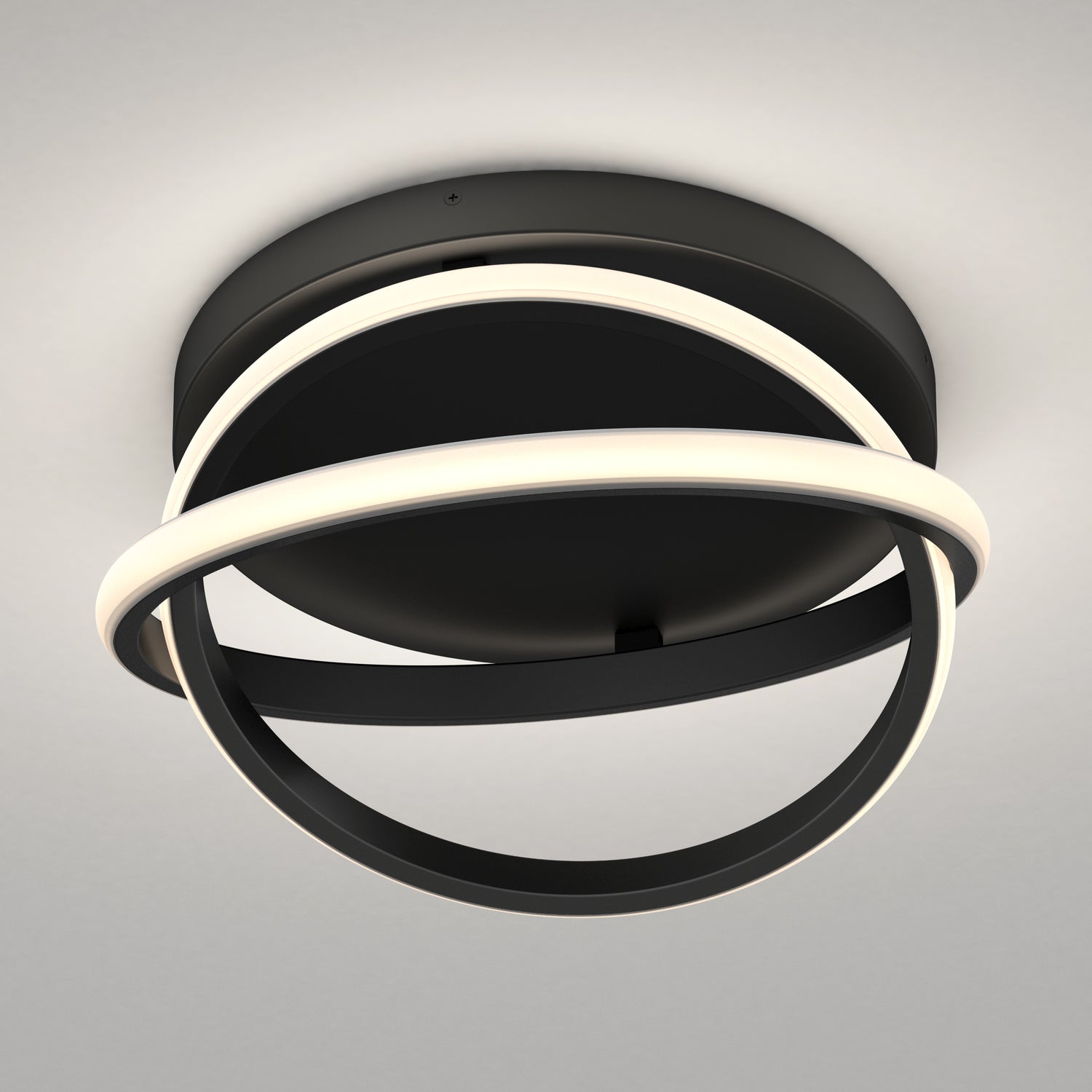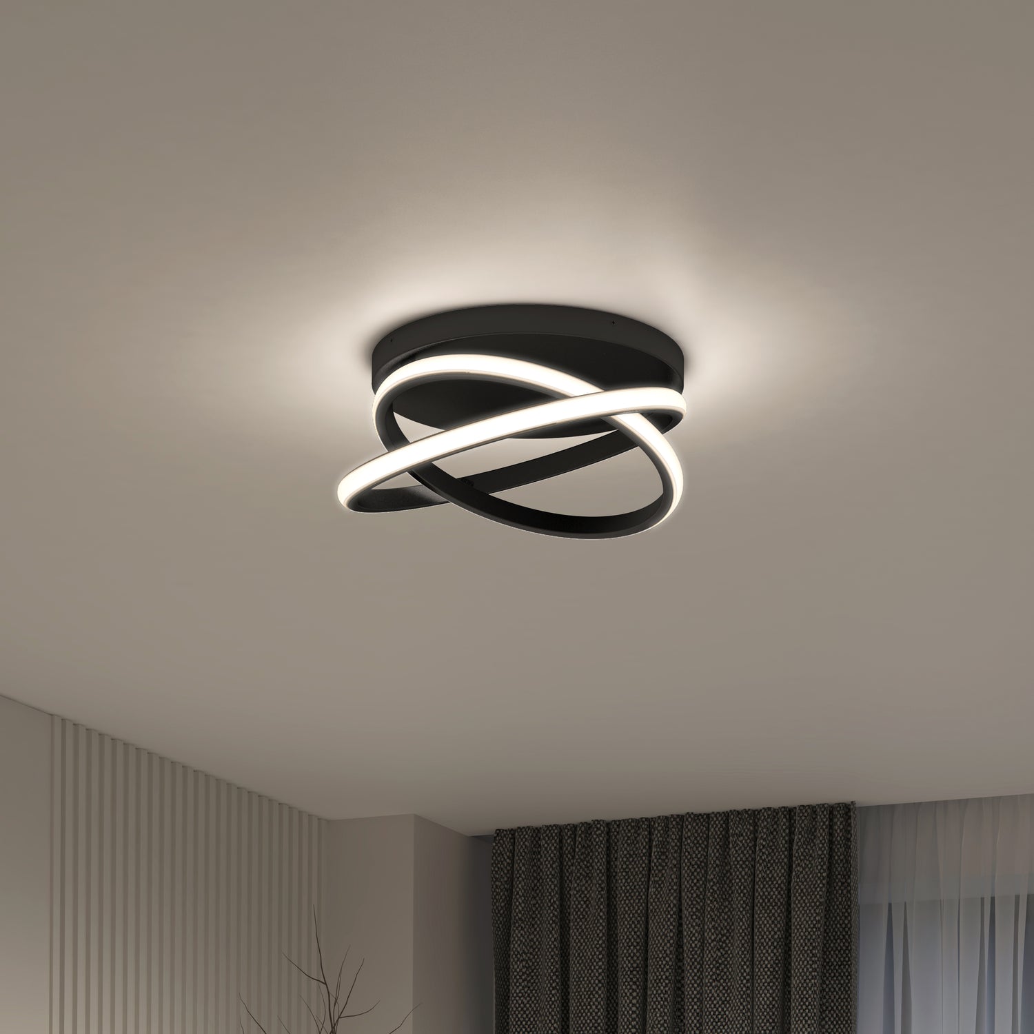Designed with the themes of infinity and orbital motion in mind, this LED ceiling light showcases two intersecting backlit circles. Its matte black finish makes it a natural fit for contemporary bedrooms and offices. The luminaire emits 1,800 lumens and can be subdued with an LED-compatible dimmer. To integrate smoothly with other lighting, it offers adjustable colour-balance technology, inviting you to choose from three shades of white. Lifespan: 50,000 hours.