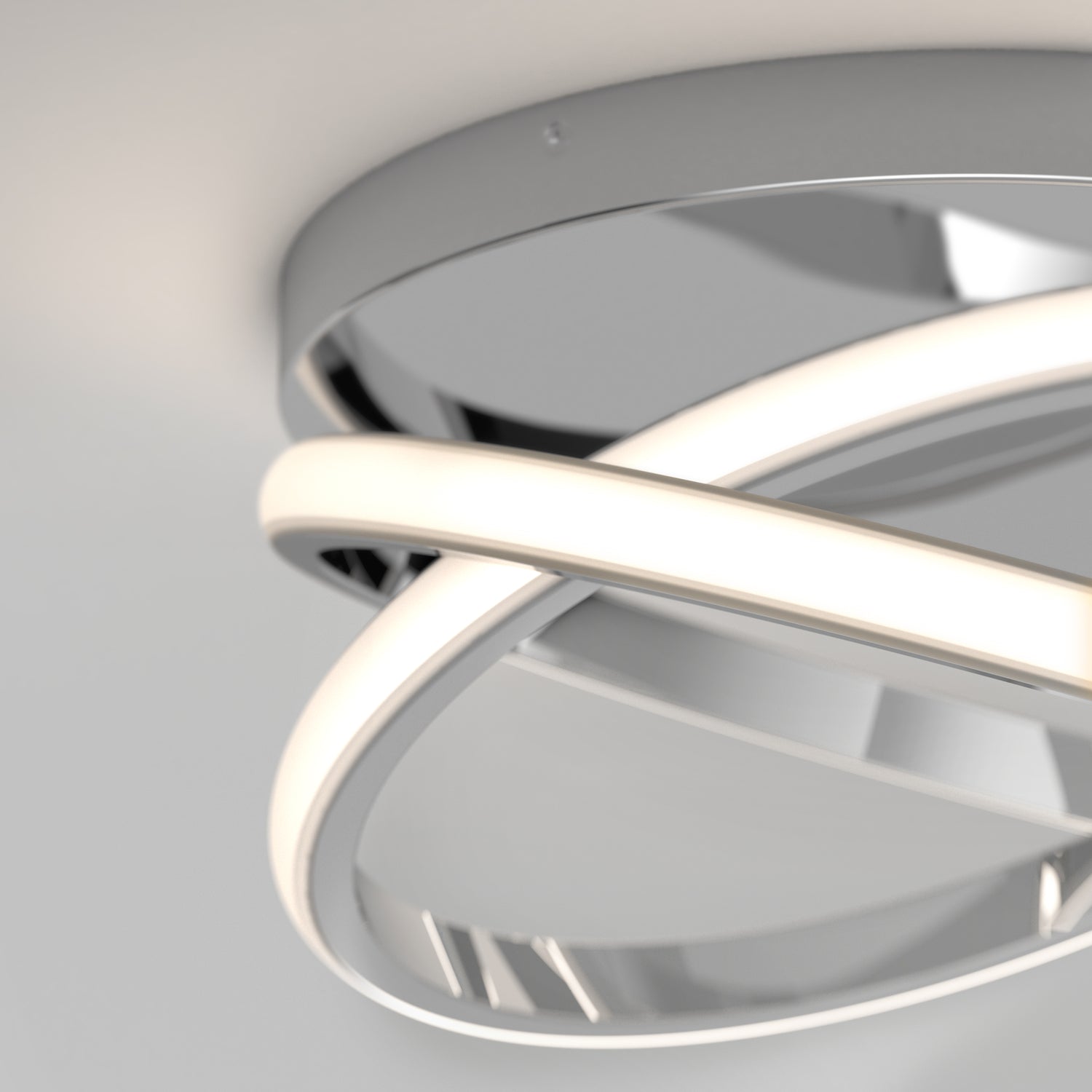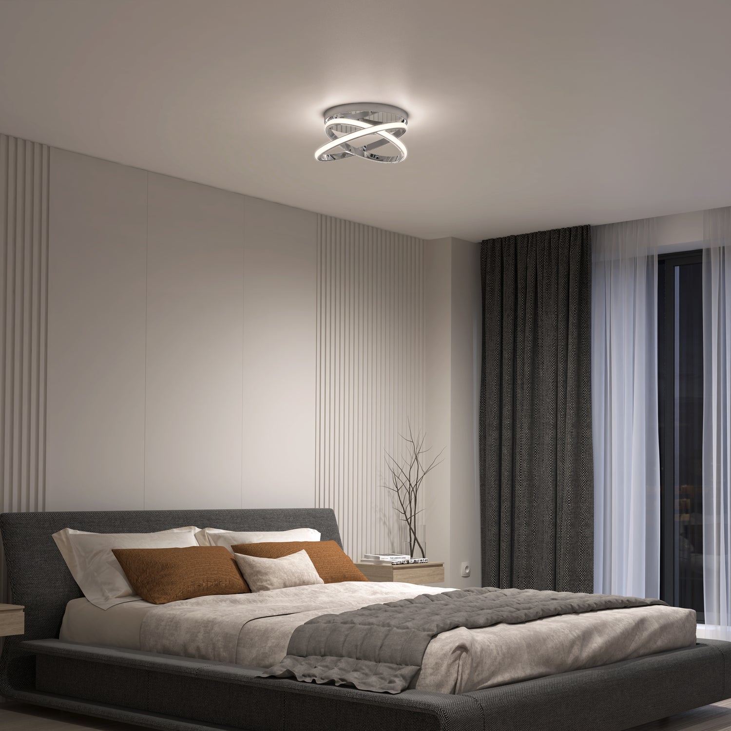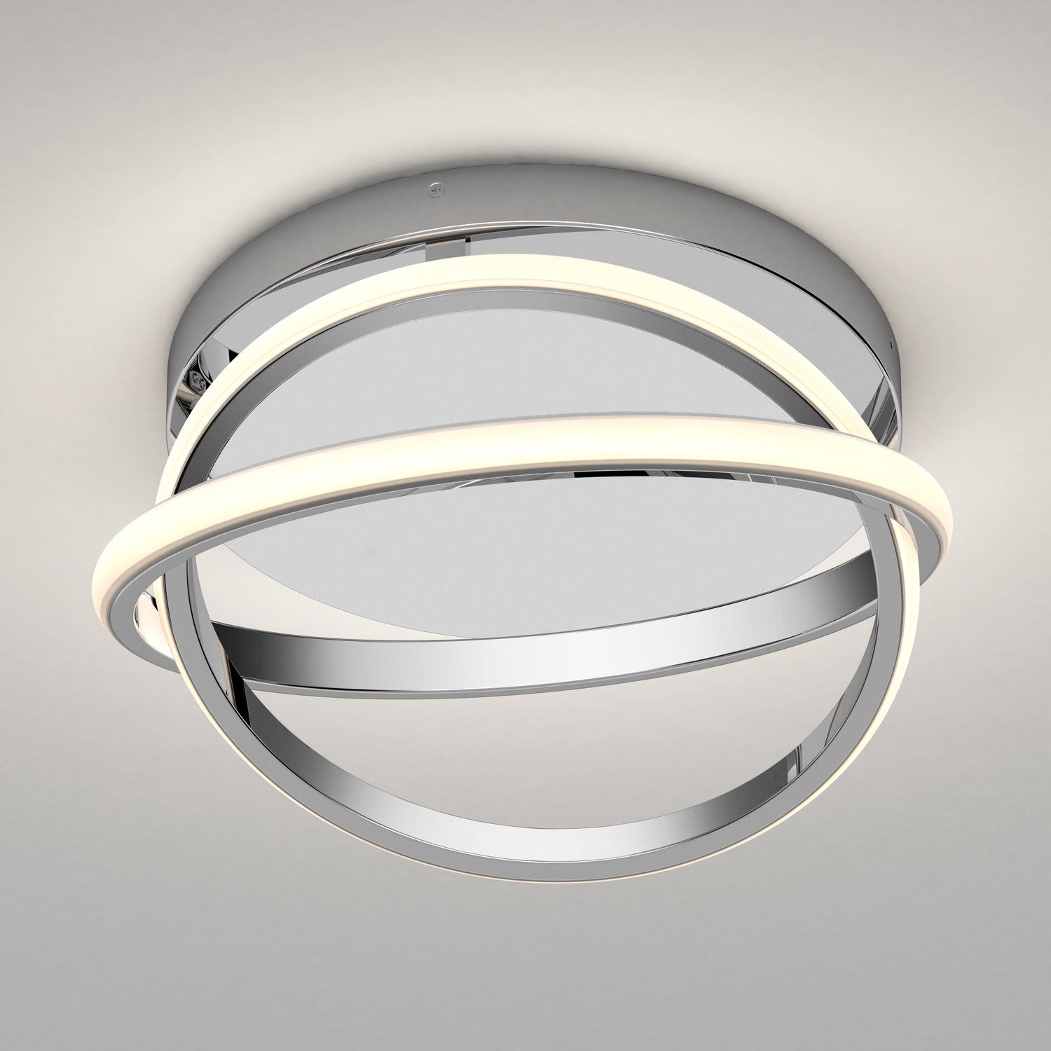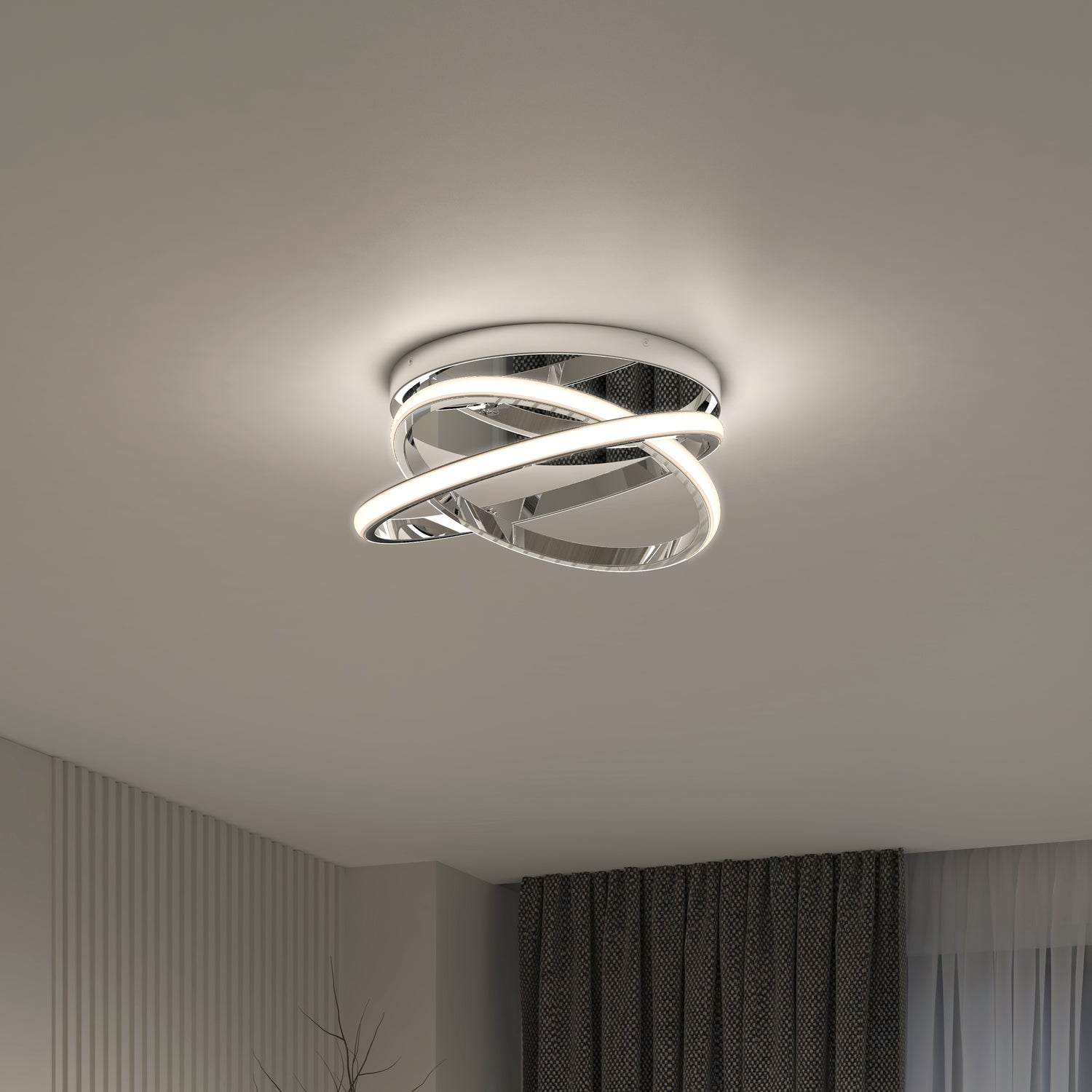 Designed with the themes of infinity and orbital motion in mind, this LED ceiling light showcases two intersecting backlit circles. Its matte black finish makes it a natural fit for contemporary bedrooms and offices. The luminaire emits 1,800 lumens and can be subdued with an LED-compatible dimmer. To integrate smoothly with other lighting, it offers adjustable colour-balance technology, inviting you to choose from three shades of white. Lifespan: 50,000 hours.