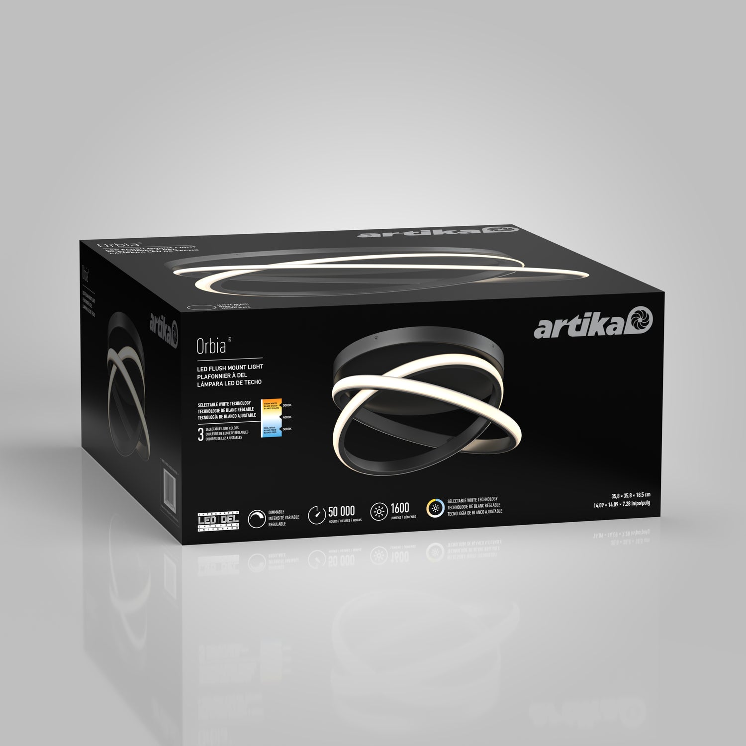 The Artika Orbia modern LED flush mount light 3 CCT features intertwined black and white rings in a sleek, abstract design, mounted on a round black base against a plain light gray ceiling.