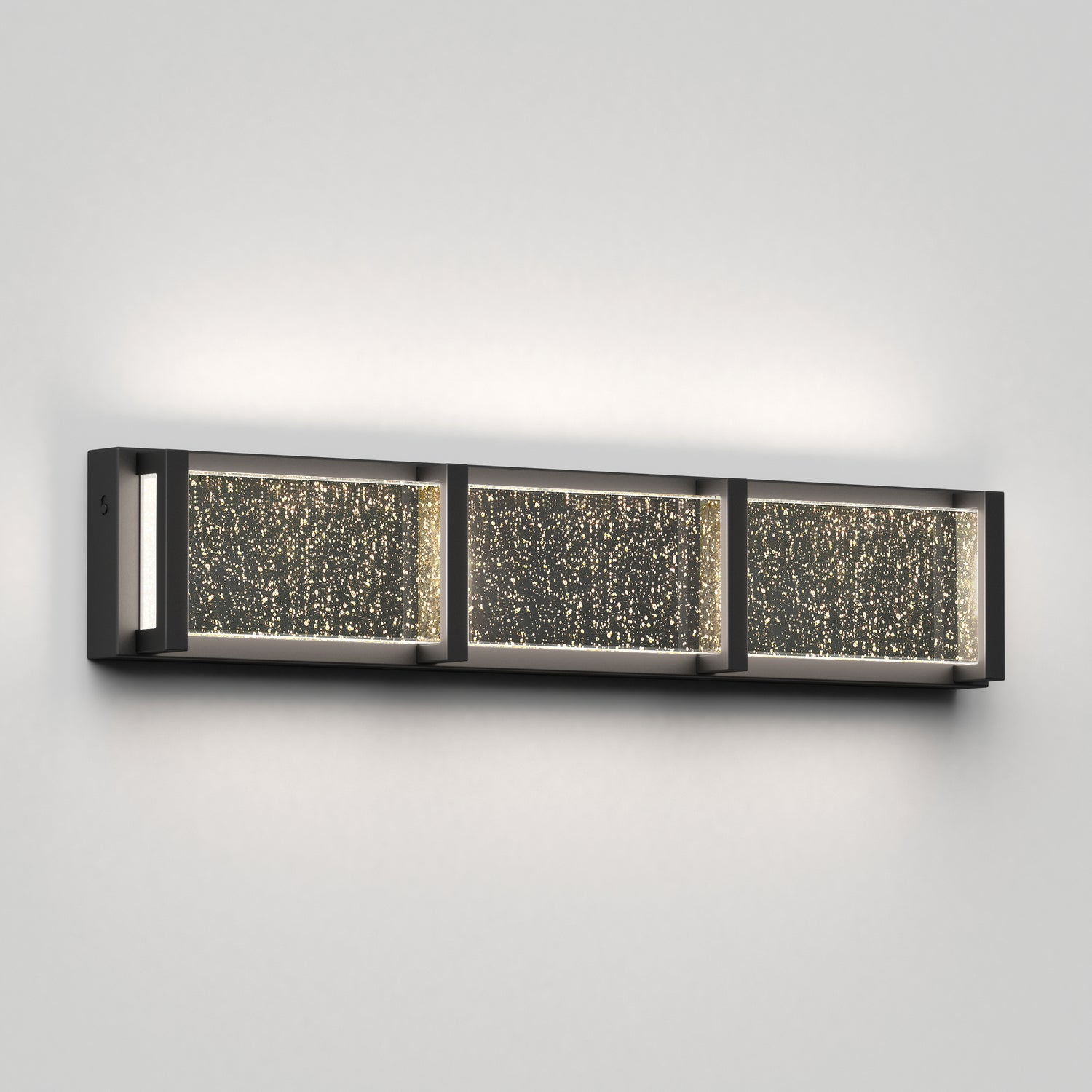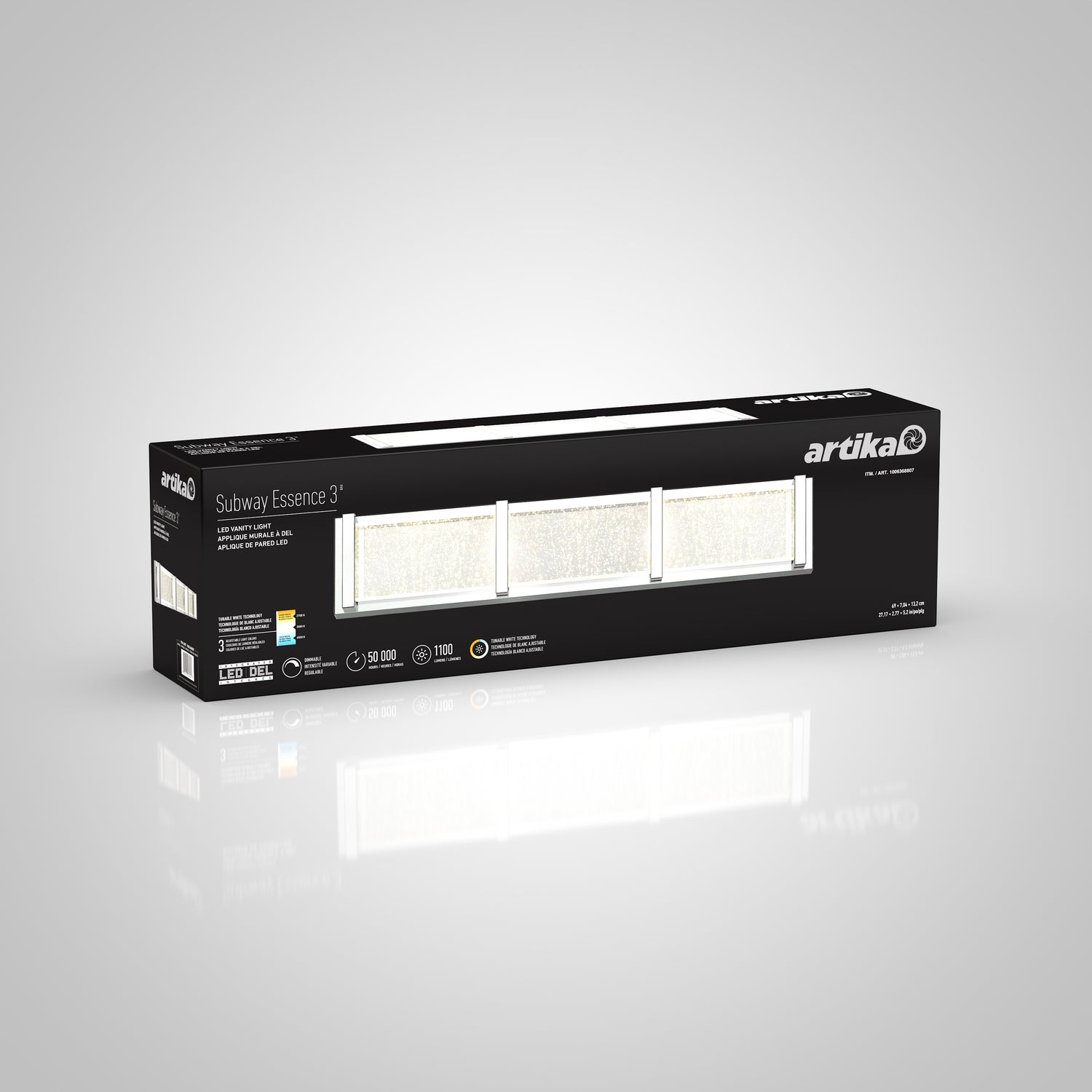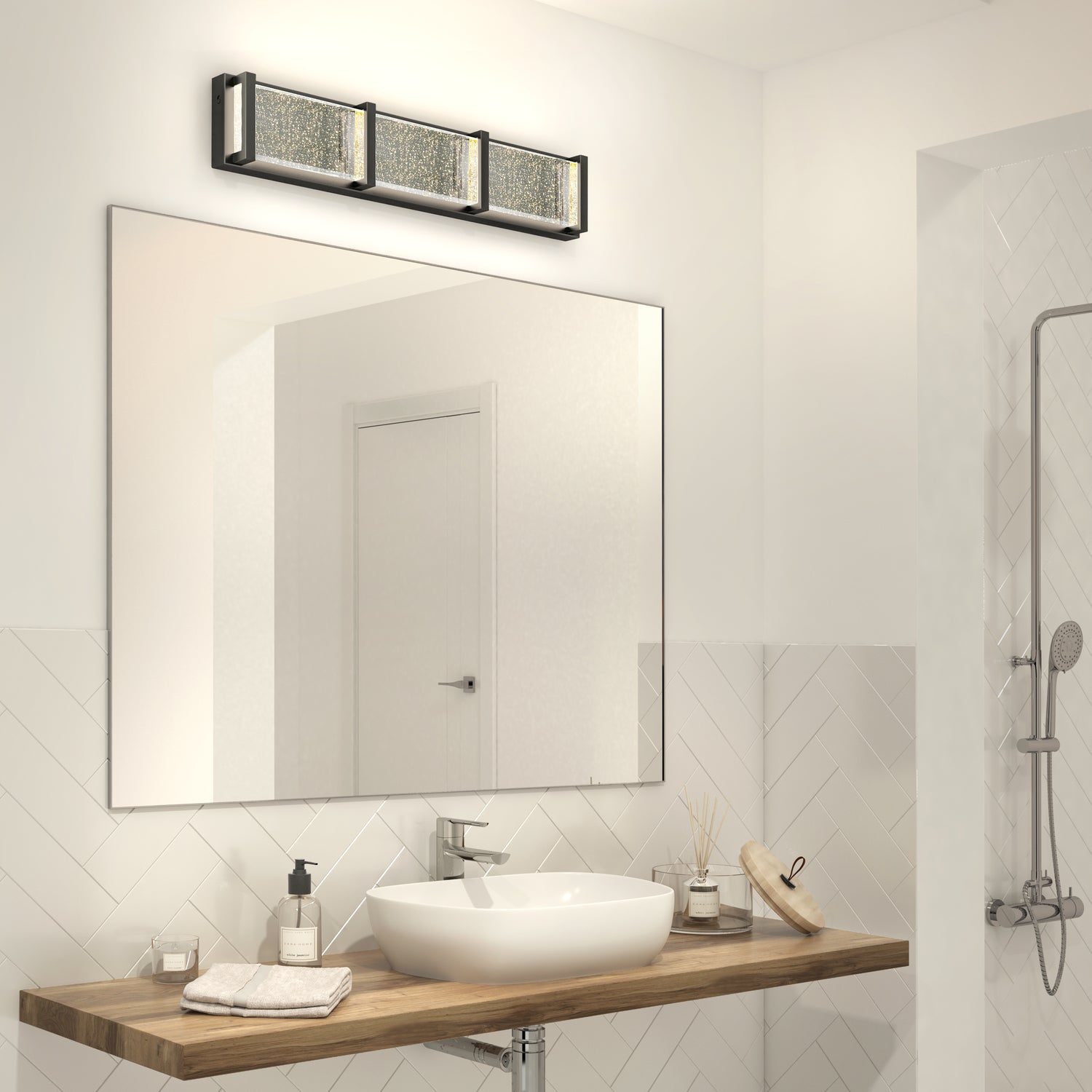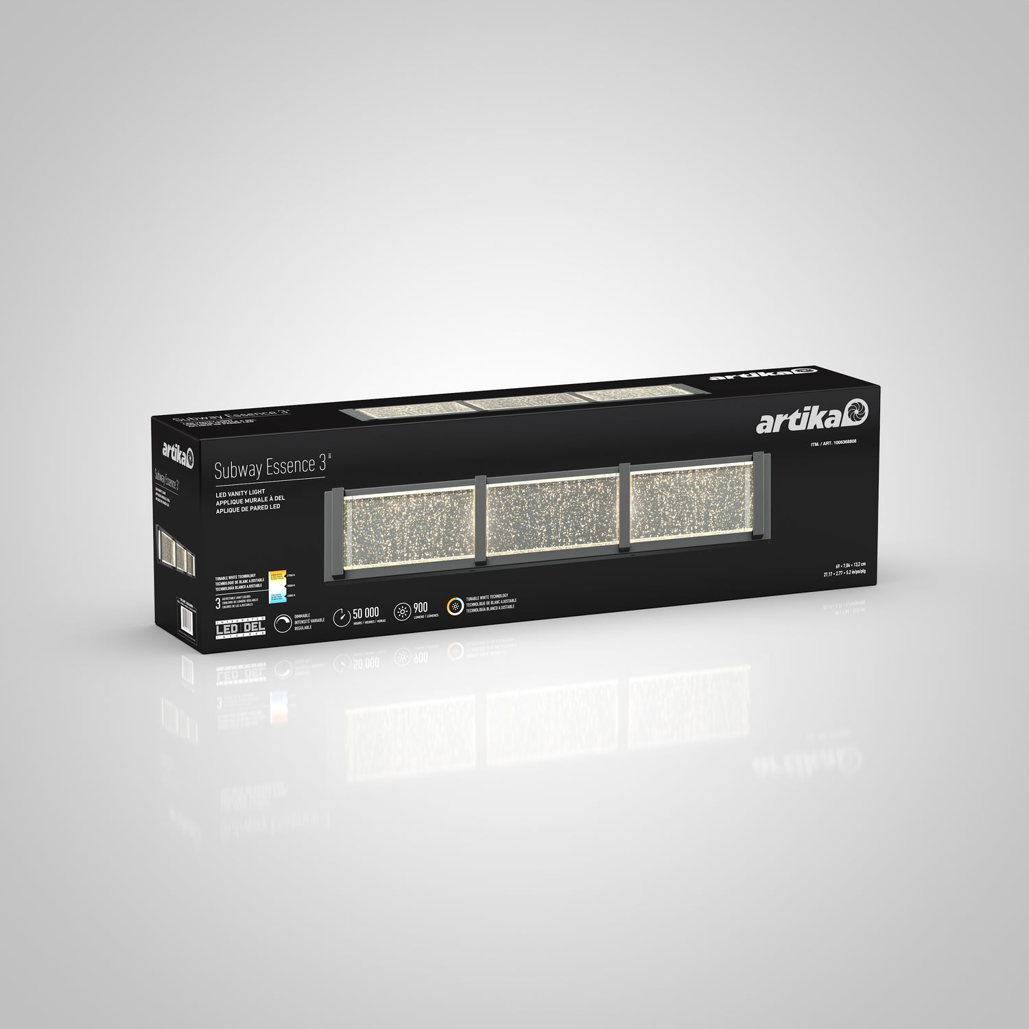 Highlight your contemporary decor with the elegant Subway Essence 3 vanity light in black. Its urban style pairs with a constellation of tiny bubbles to conjure up the dark and mysterious world of the underground. Three adjustable colours allow you to vary the light from warm white to cool white thanks to tunable white technology. Featuring a premium glass diffuser, this fixture with integrated LED lights can be easily installed on the wall of an ultra-modern bathroom. Subway Essence 3 promises 50,000 hours of lighting and an output of 900 lumens. To adjust the brightness, simply install a compatible LED dimmer.
