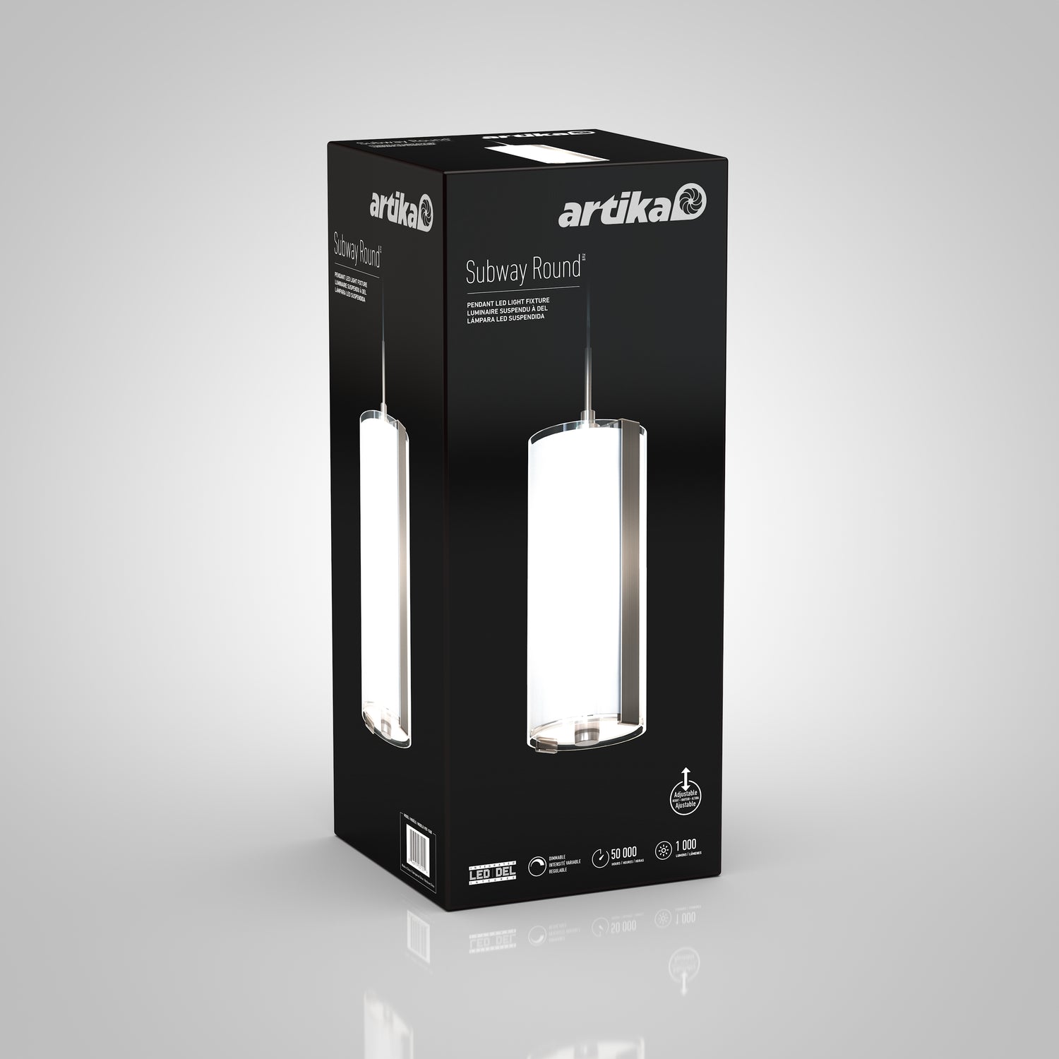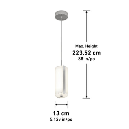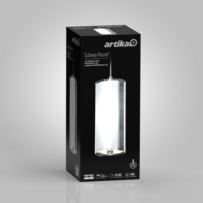 The Artika Subway Round Mini LED pendant light features a modern cylindrical design with a frosted glass shade, suspended from the ceiling by a slim cord against a plain, light-colored background.