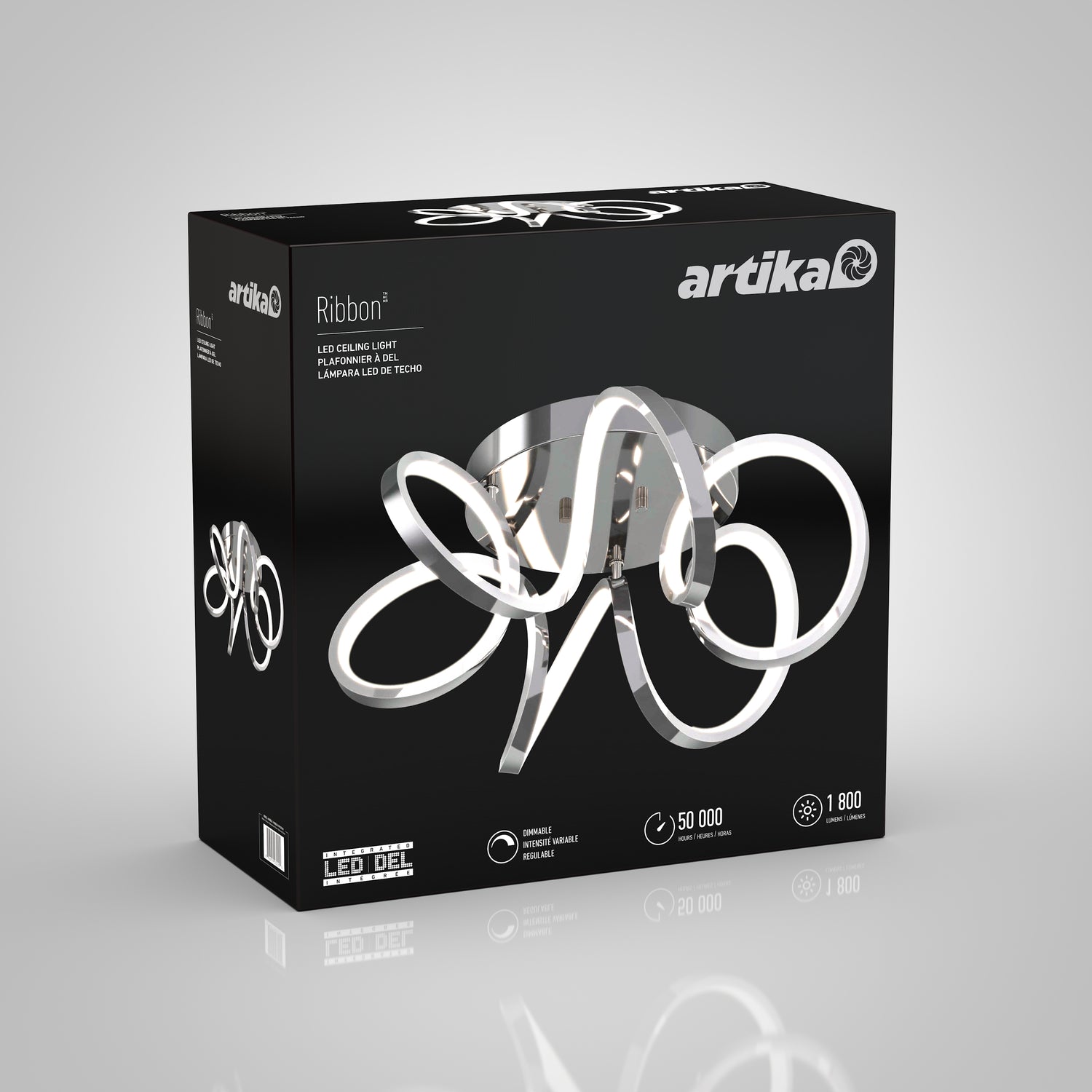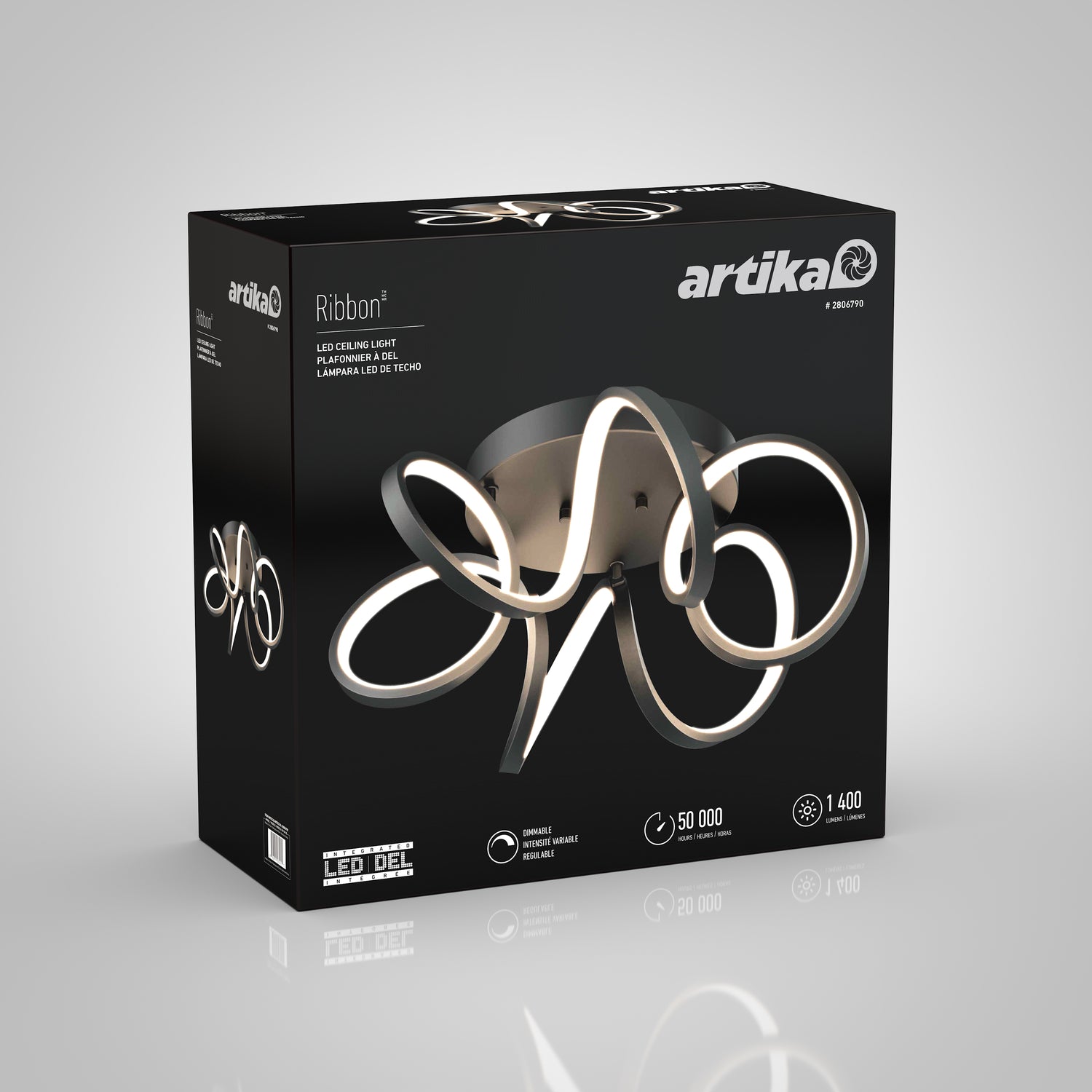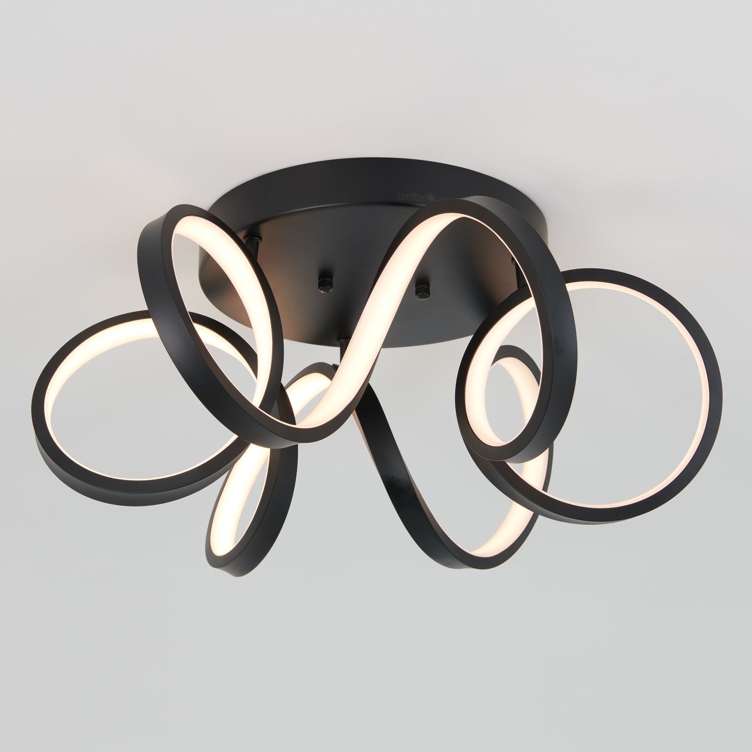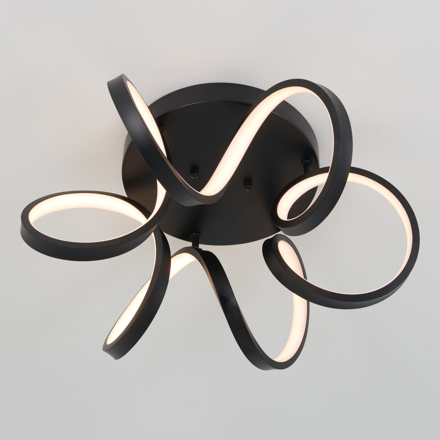 The Artika Swirl Ribbon flush mount light features a black base and multiple looping, curved LED strips for an abstract, sculptural look against a plain light gray background.