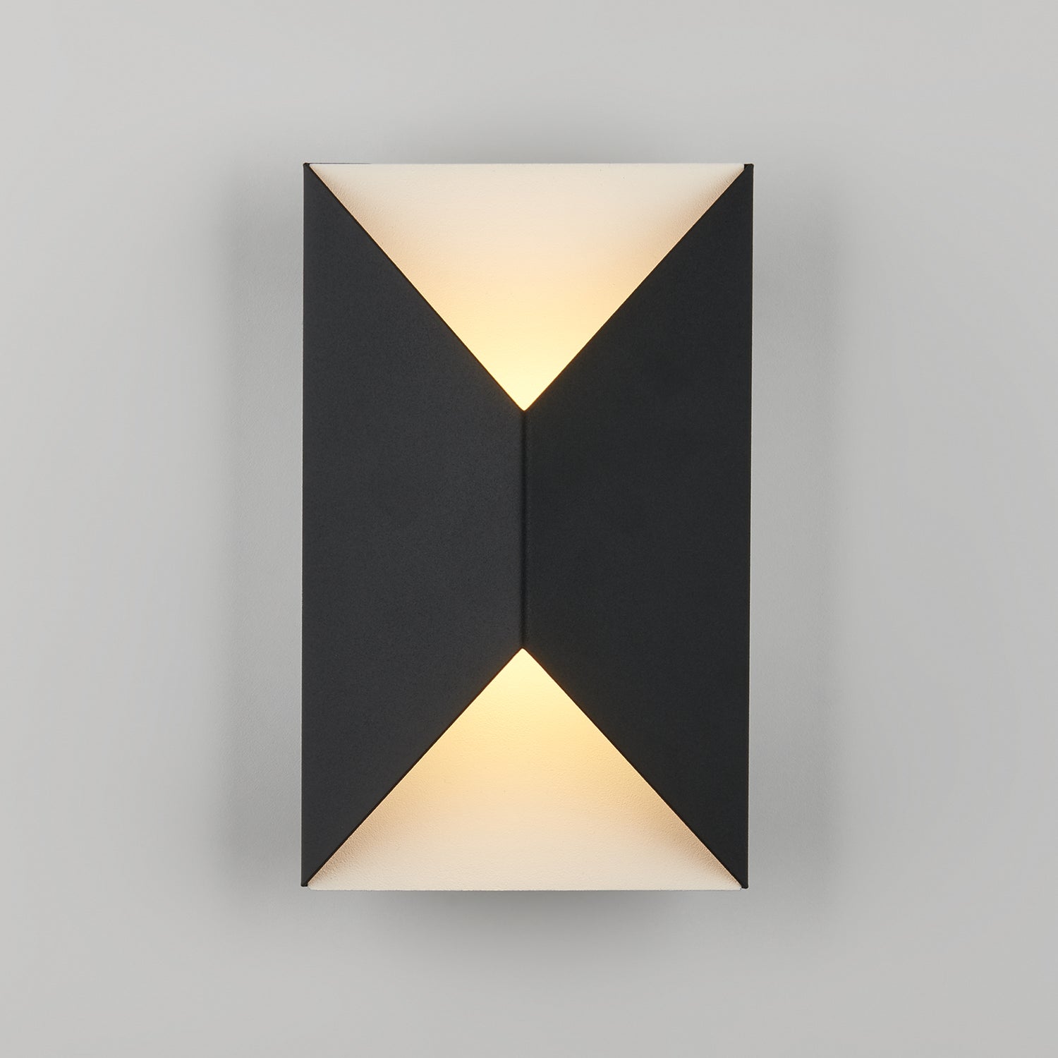 The Artika Tria LED indoor-outdoor wall light features a geometric black metal design with triangular openings at the top and bottom, casting soft, warm light onto a plain gray wall.