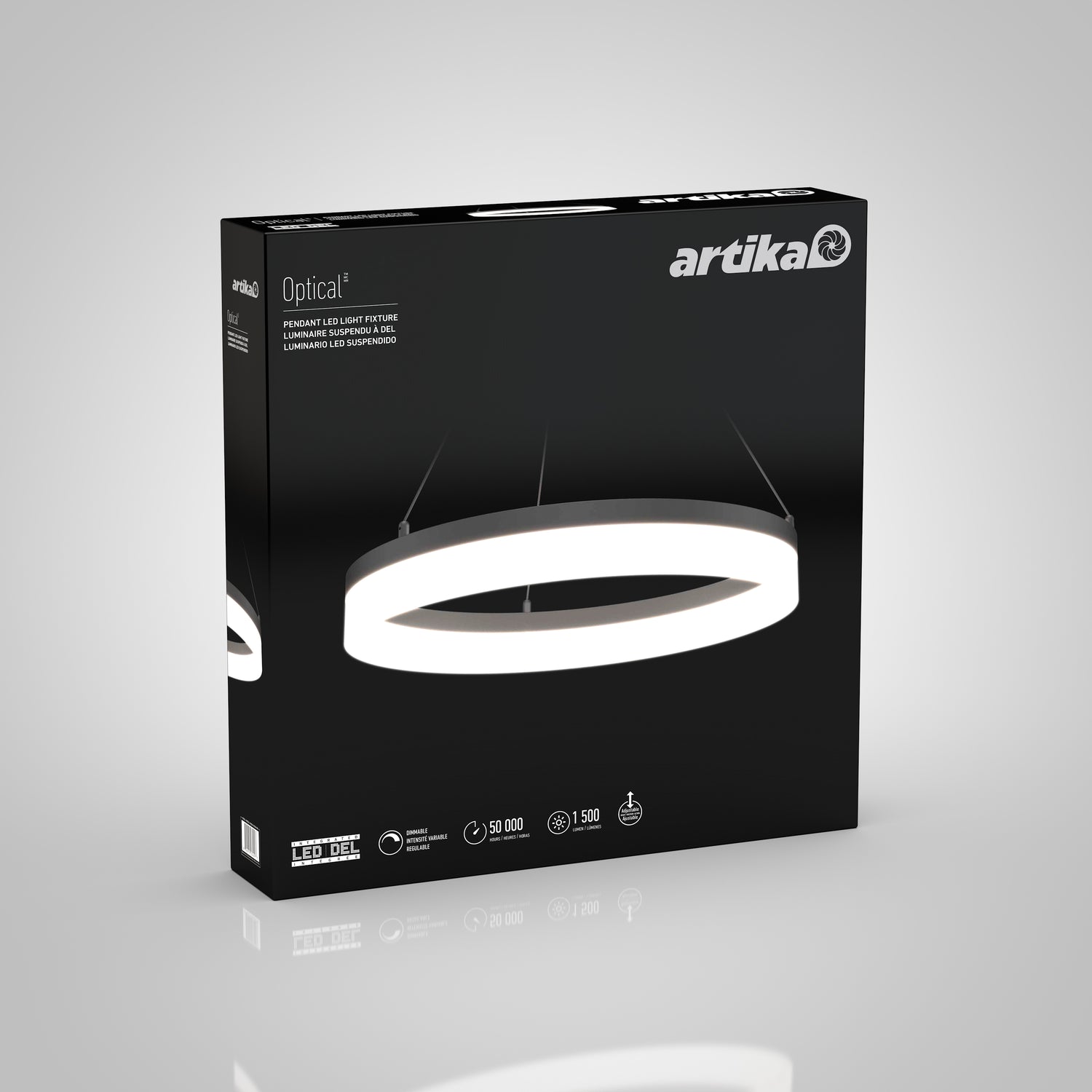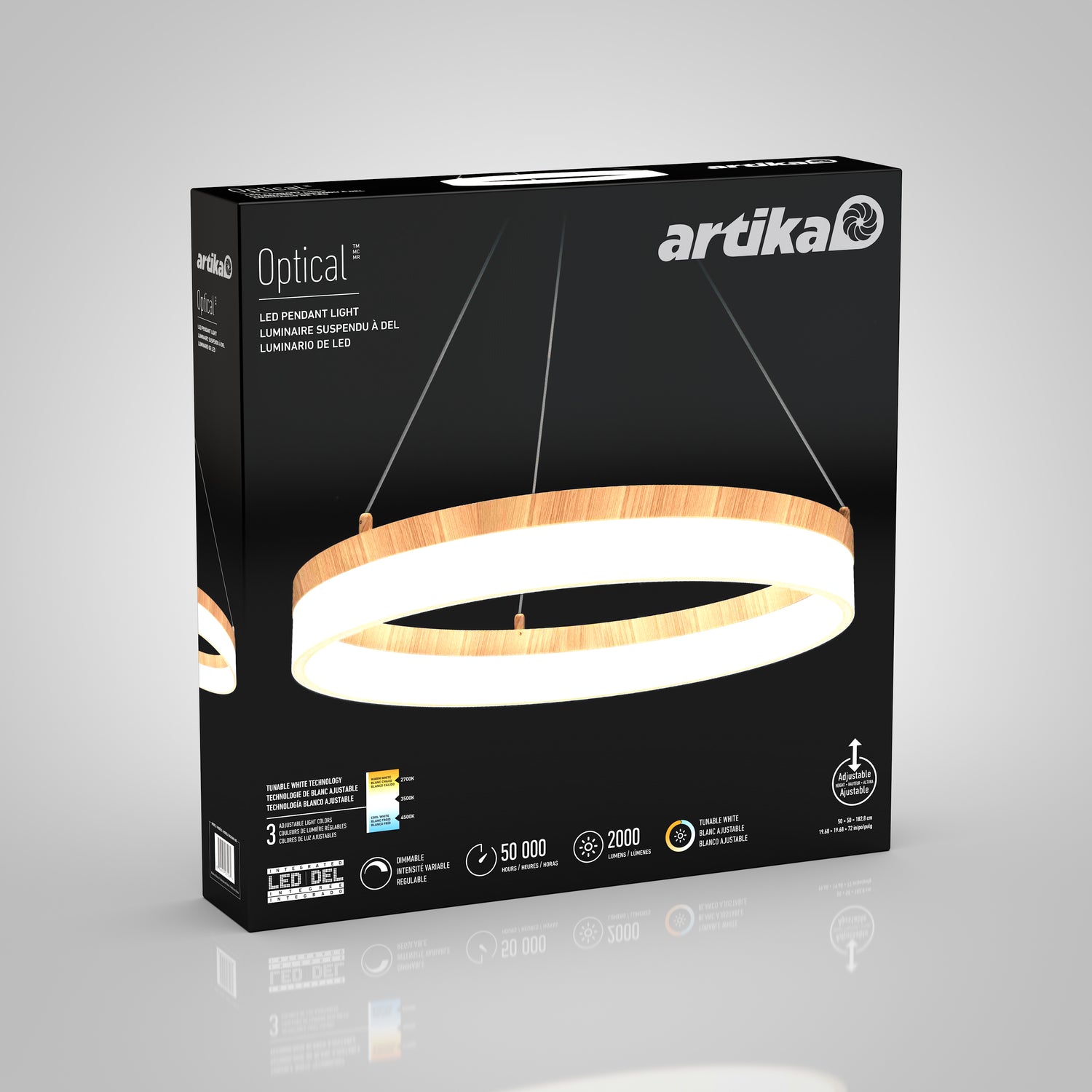 The Artika Optical LED pendant light 3 CCT features a modern circular design with a black frame, a glowing white ring, and hangs from the ceiling on three thin cables attached to a central black mount.